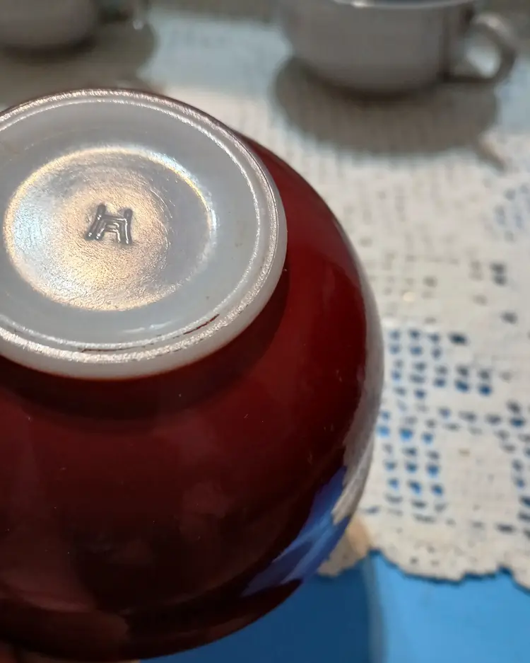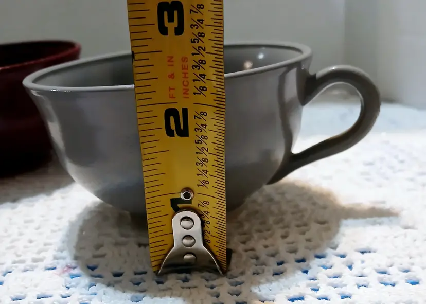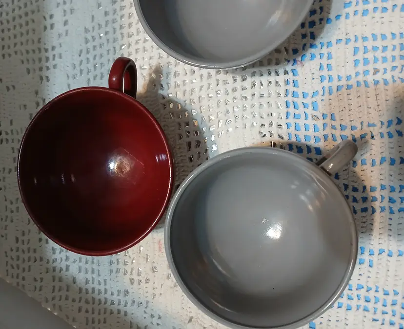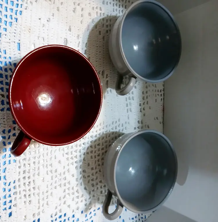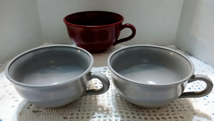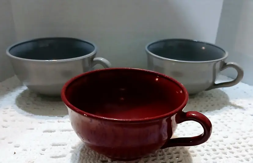 3 nice vintage cups NO Saucers. 2 gray and 1 maroon. These are lightweight cups and in good shape.
