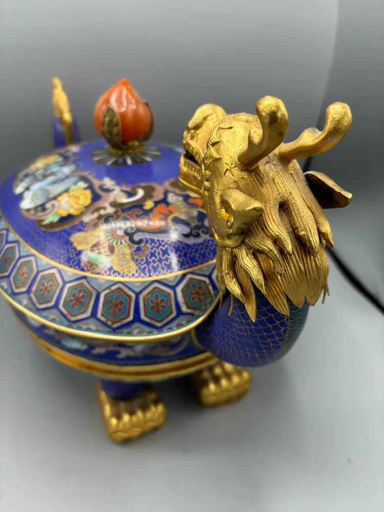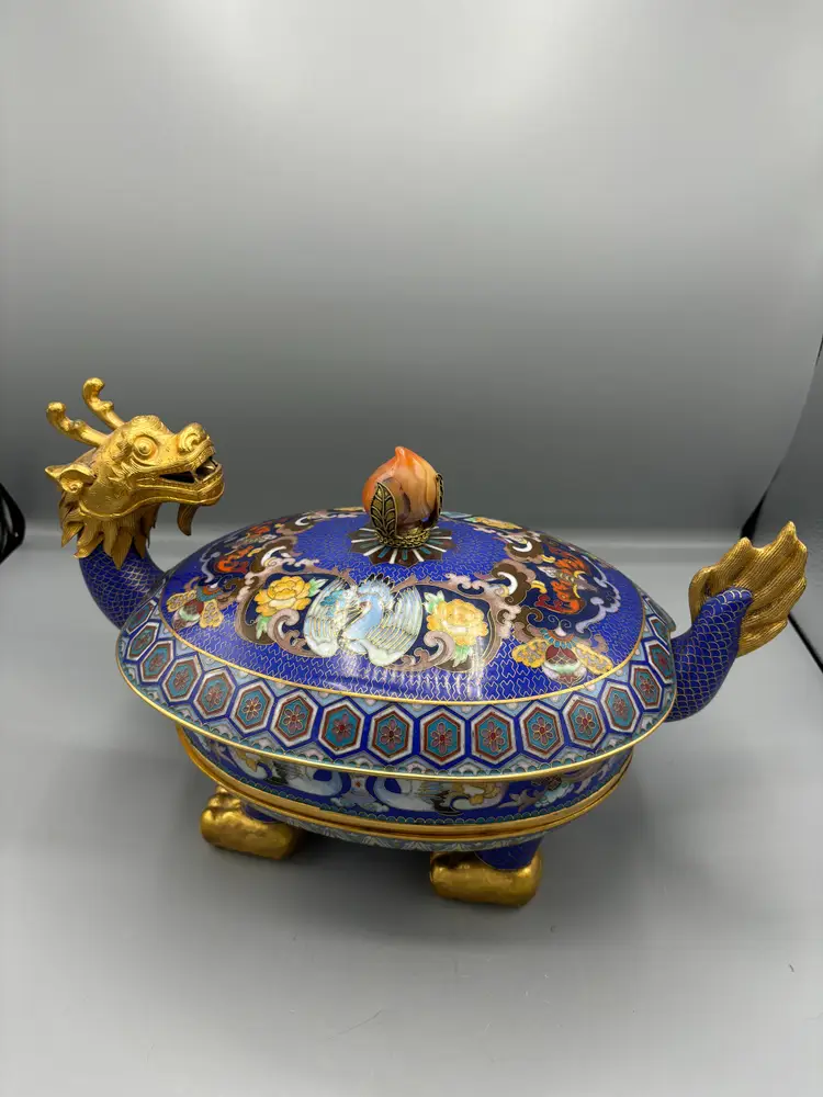 3 tier lidded Cloisonne Chinese Dragon Censor that is a RARE find! This would make a great conversation starter at any gathering. The enamel is worn around the inside bottom of bowl, refer to pictures. The colors on the bowl is vibrant and the details are amazing.