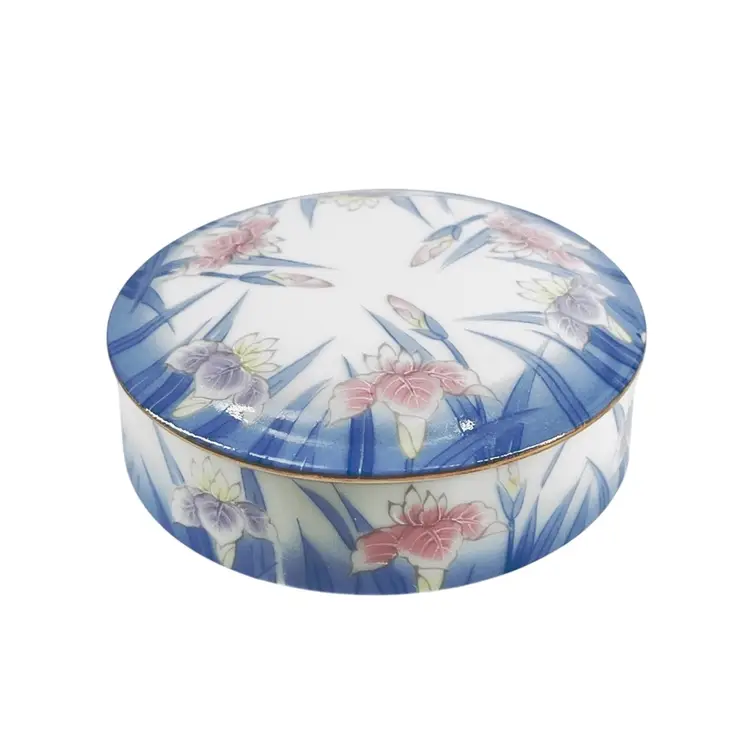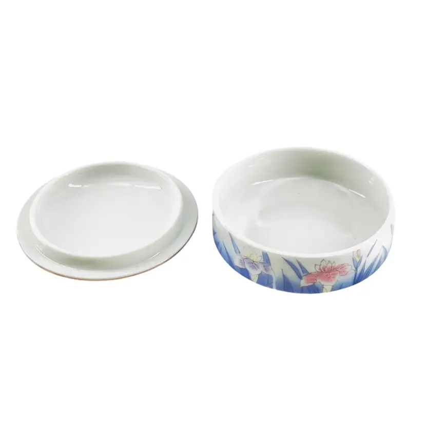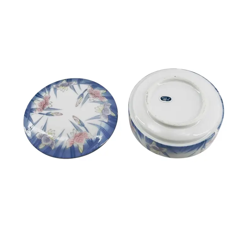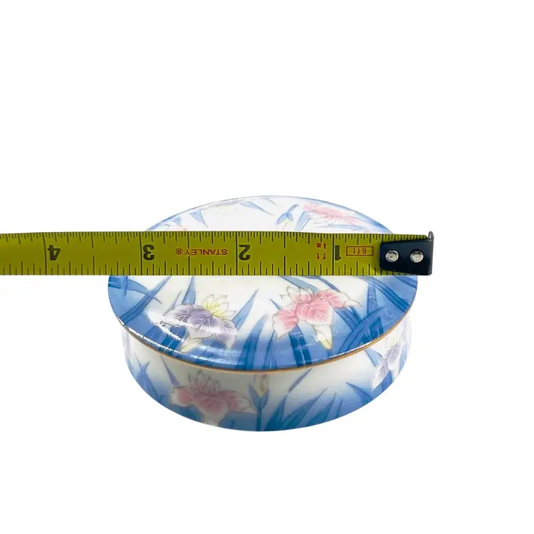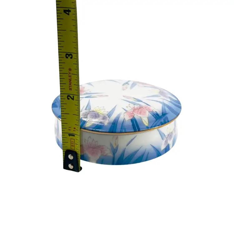 👉 3 1/2”Dia x 1 1/4“D Ring Jewelry Pink Purple Iris Blue Trim 👉Shipping Overages <$1 Refunded 👉No Chips or Cracks 👉 Review Photos for Best Condition Description 👉 Sold as Shown