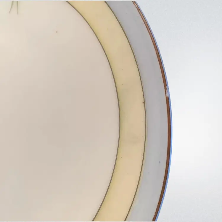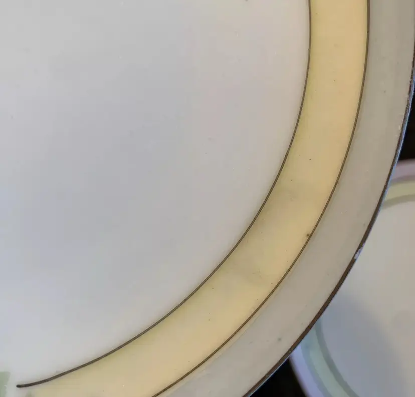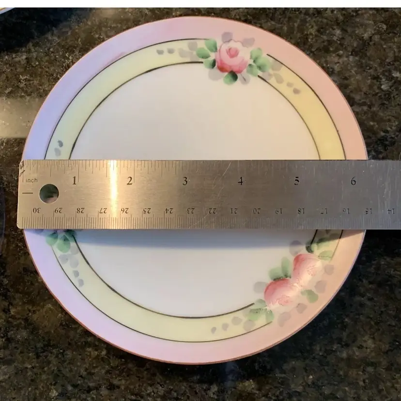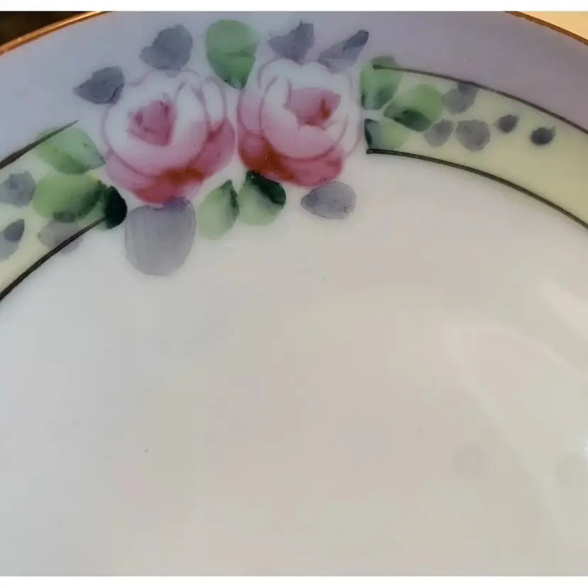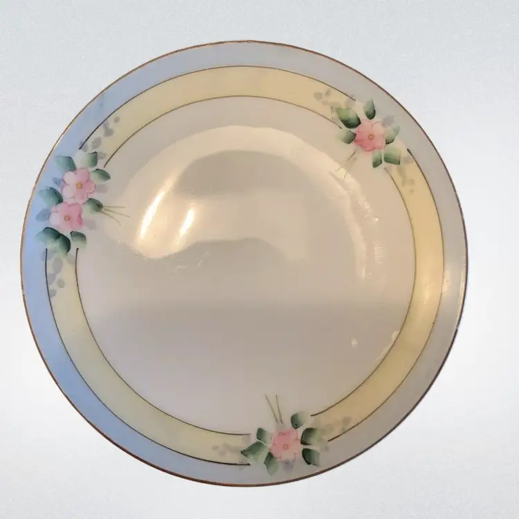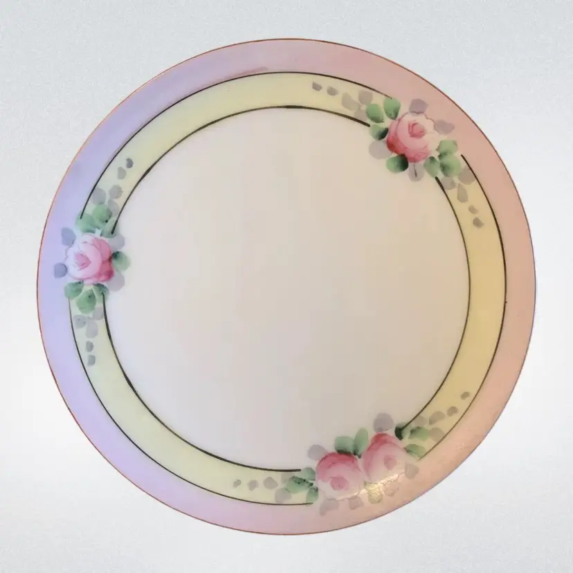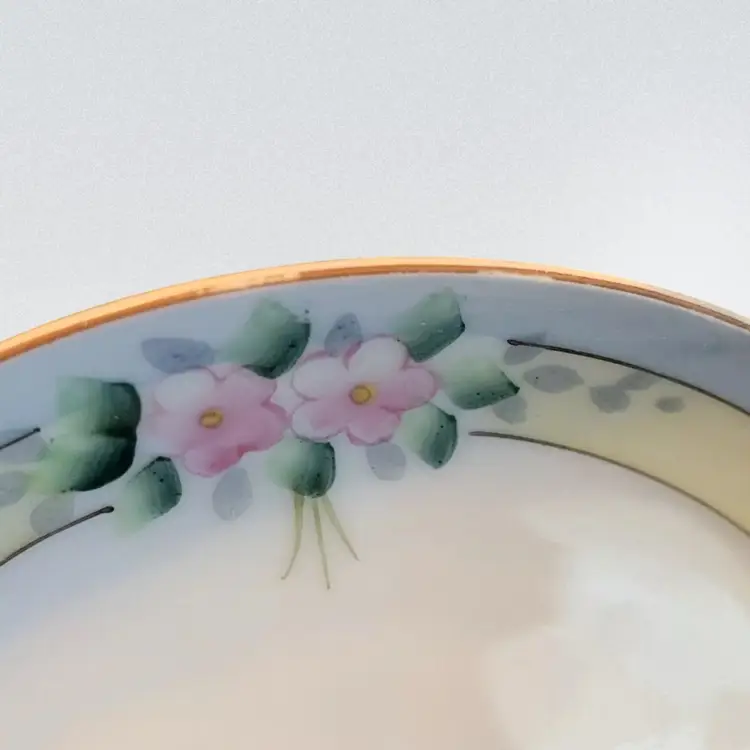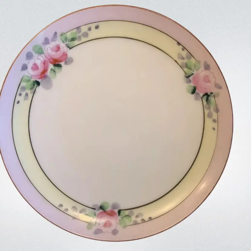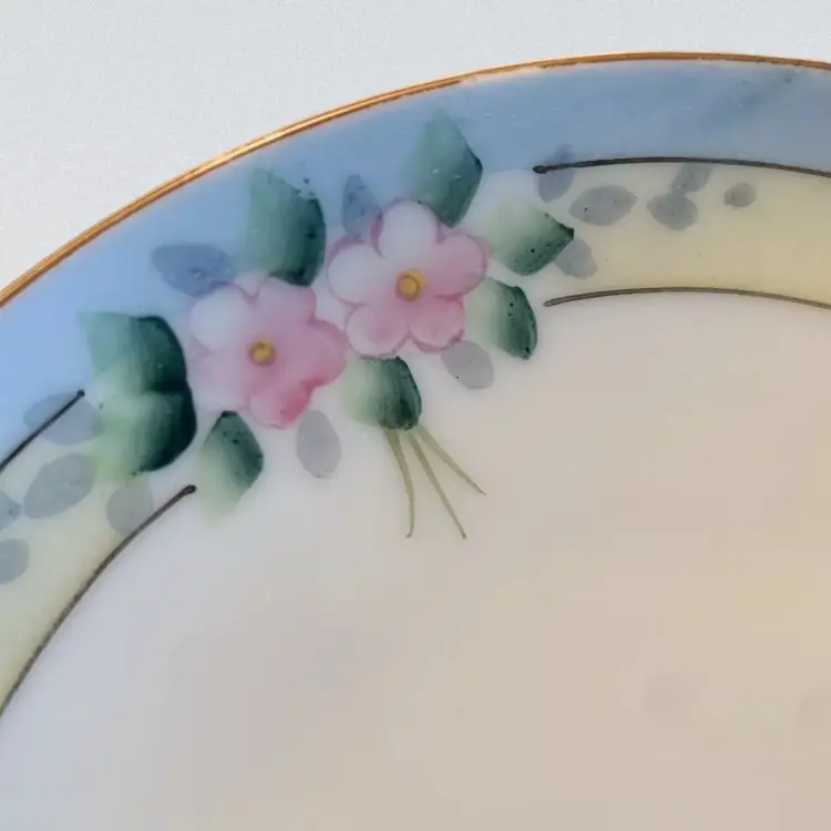 2 of the plates have a pink band and hand painted roses. One plate has a blue band with what look to be hand painted cherry blossoms. No chips or cracks. There are some minor marks and minor wear to the gold trim. The blue plate has more wear to the gold trim than the pink plates. Please see all pictures!