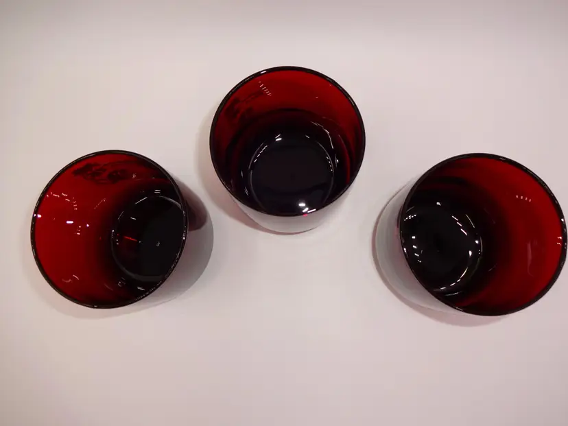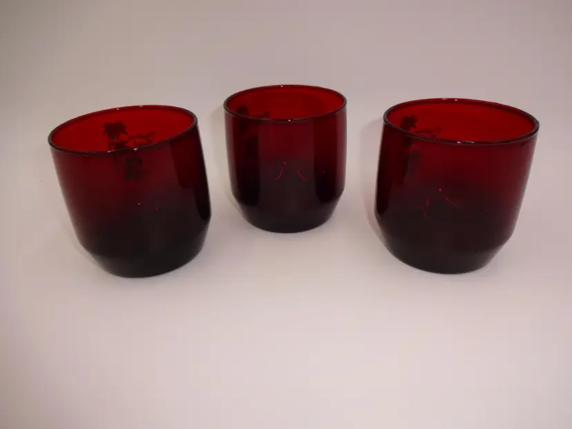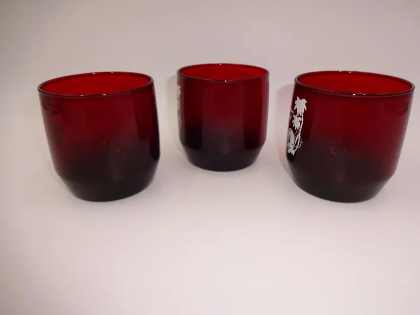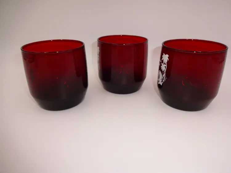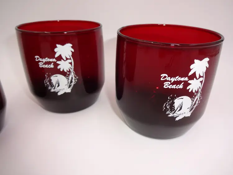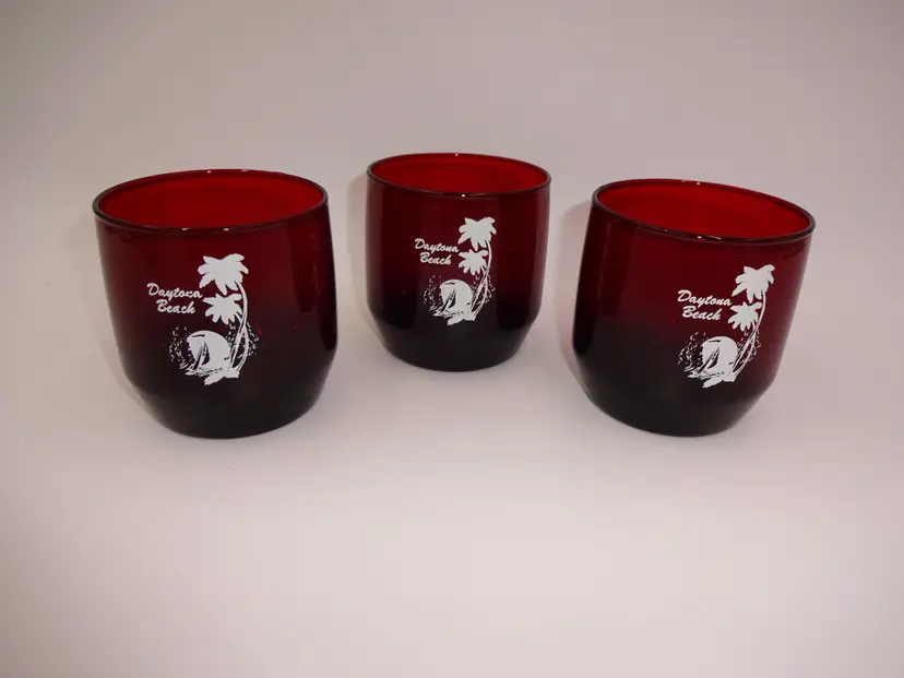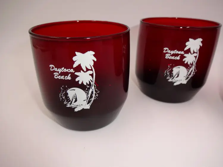 Very good pre-owned condition. Ruby red low ball/rocks/old fashioned glasses with Daytona Beach in cursive, palm trees, the sun, and a sailboat sail in white on the front that hold approximately six ounces (eight ounces to the rim). Approximate measurements: 2-3/4" x 3". No chips, cracks or stains.