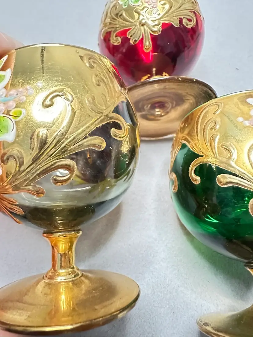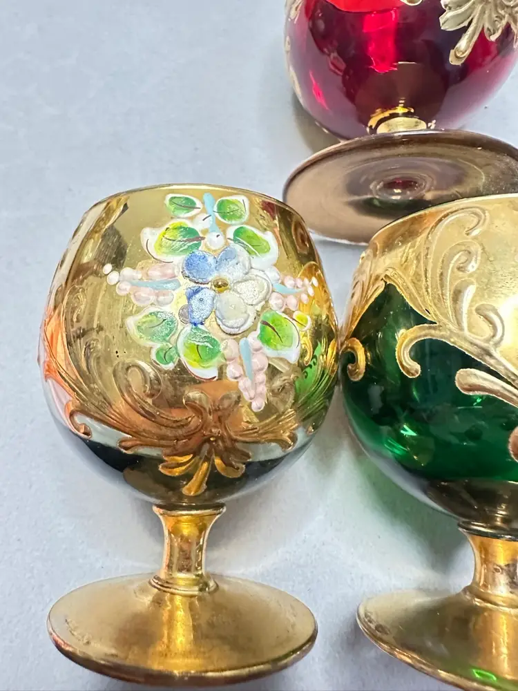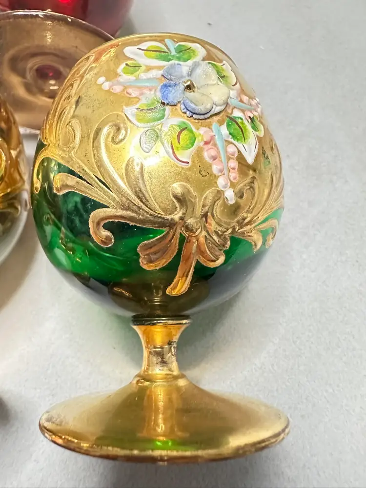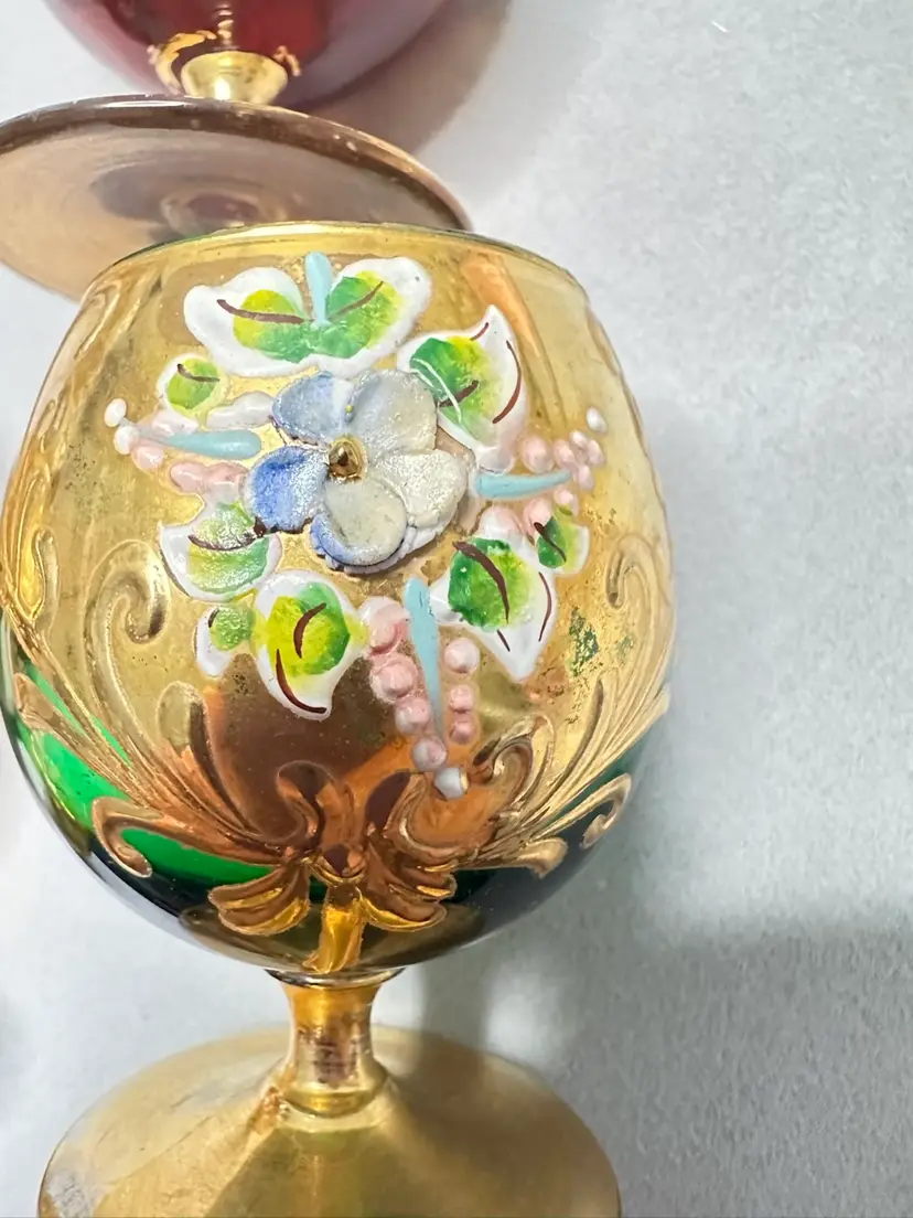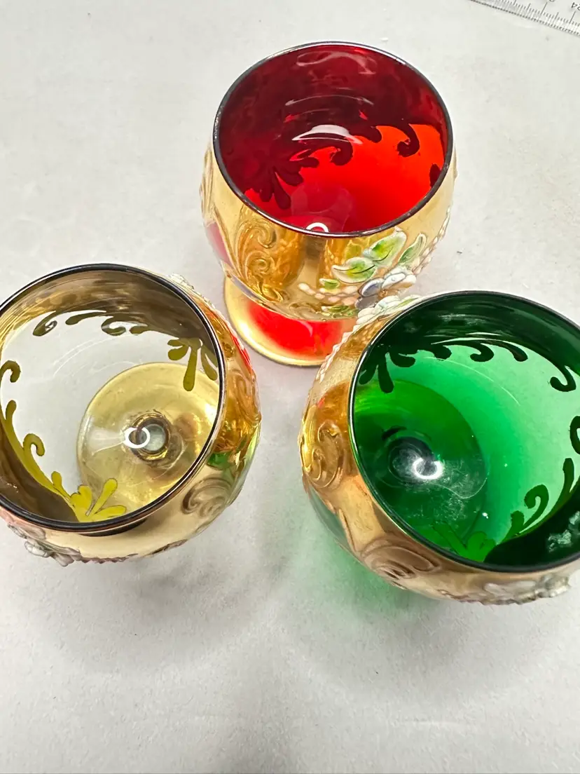 3 brandy sniffers grey or very light blue, green and red. Each are 2.75 inches tall. Refer to photos as some have condition issues on the flowers.