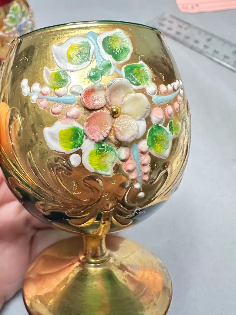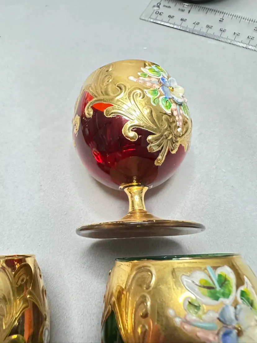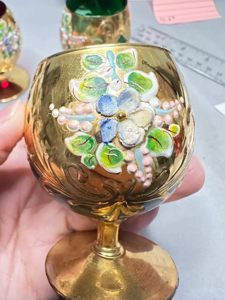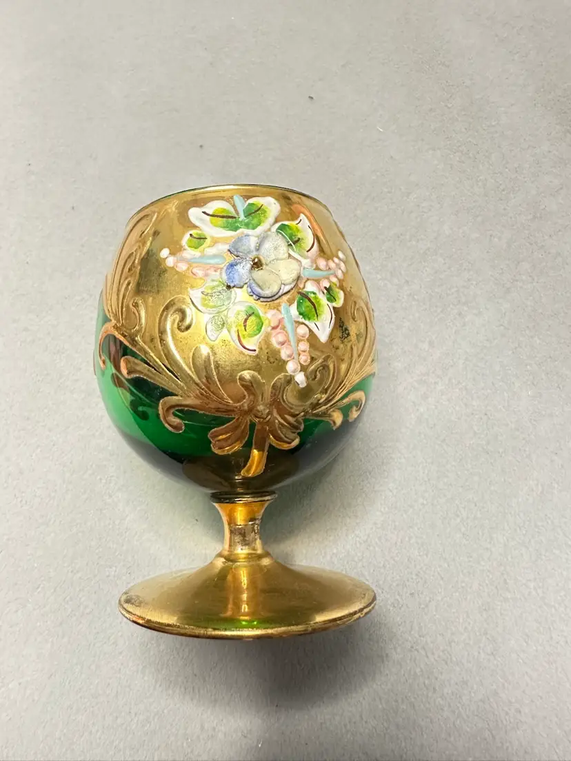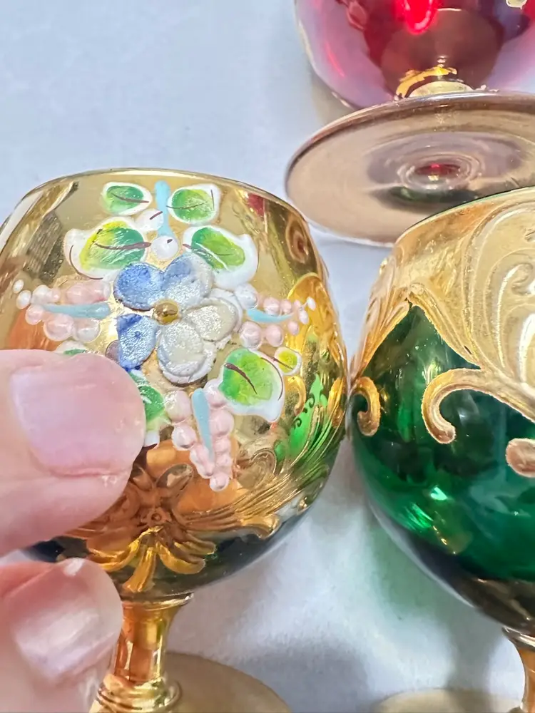3 brandy sniffers grey or very light blue, green and red. Each are 2.75 inches tall. Refer to photos as some have condition issues on the flowers.
