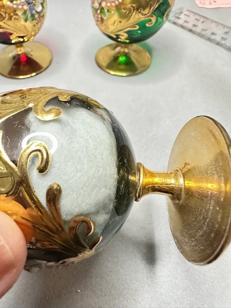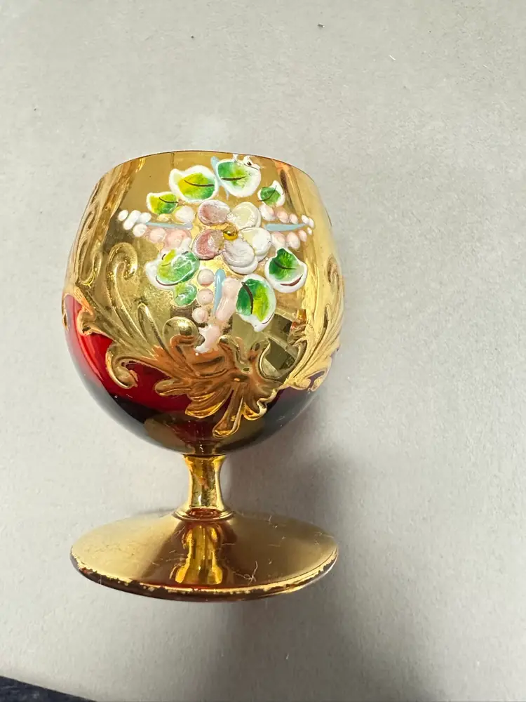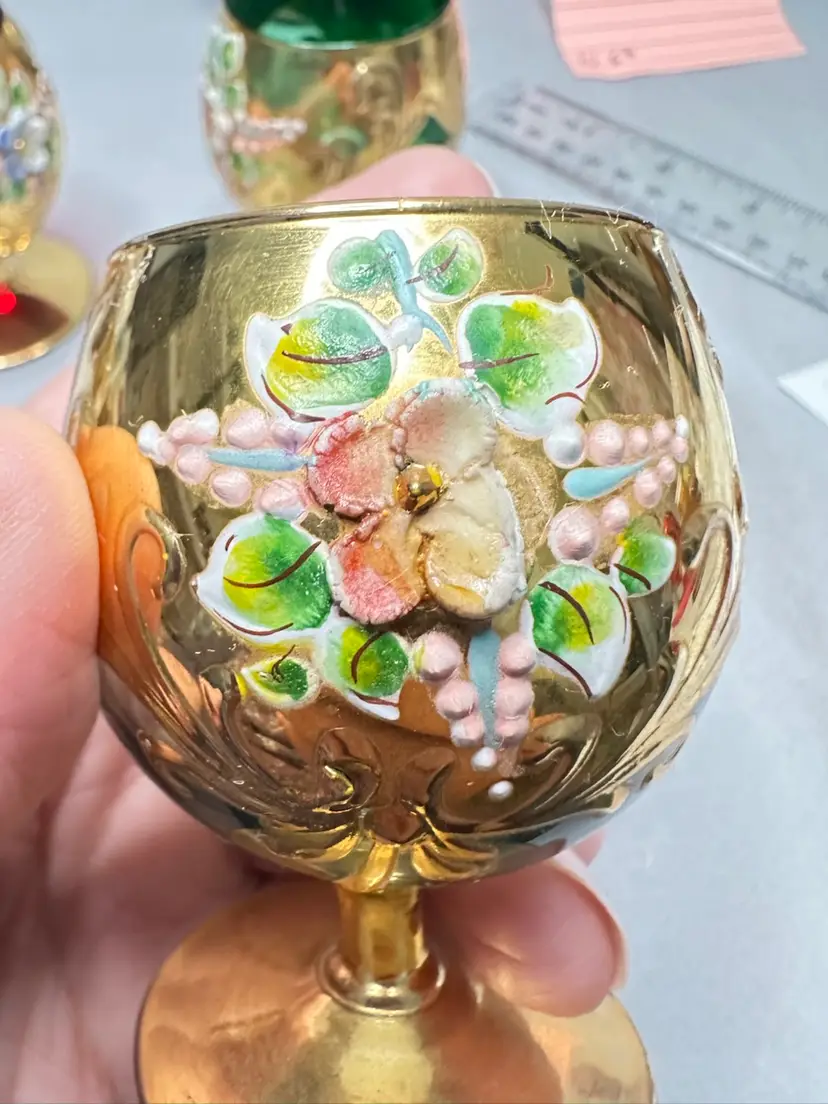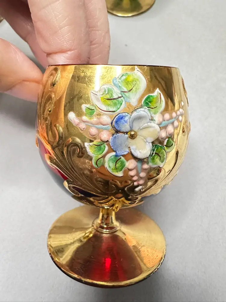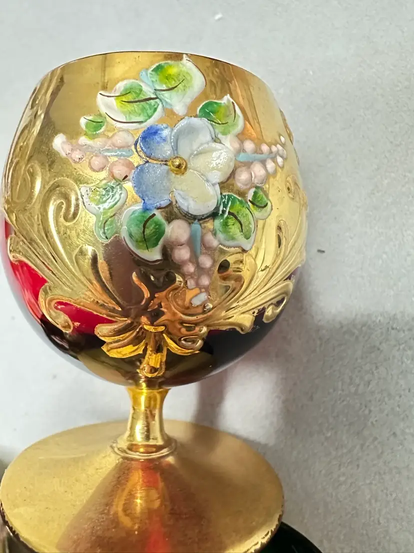 3 brandy sniffers grey or very light blue, green and red. Each are 2.75 inches tall. Refer to photos as some have condition issues on the flowers.