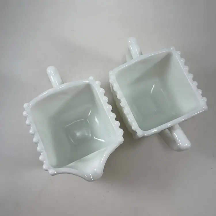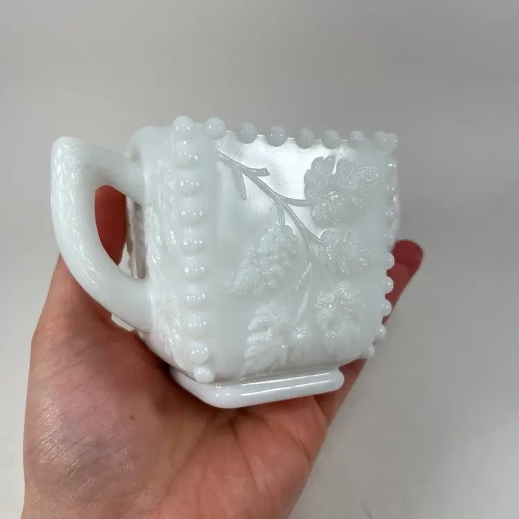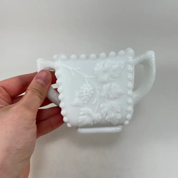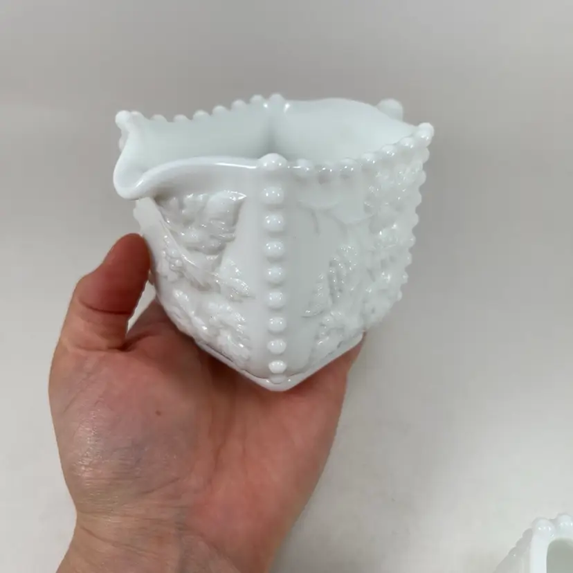 Approximately 3” tall, 4.5” at the widest, and a 3” opening. No chips or cracks.