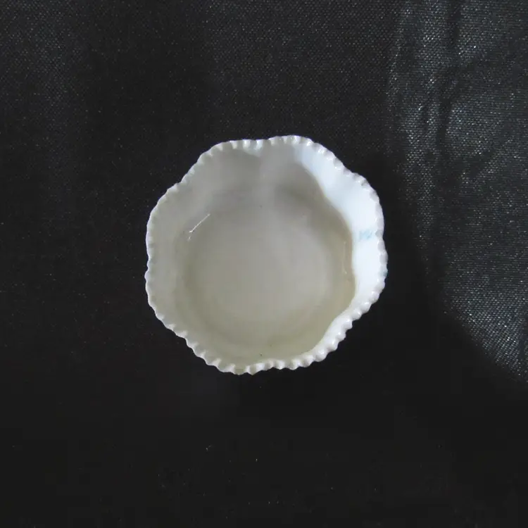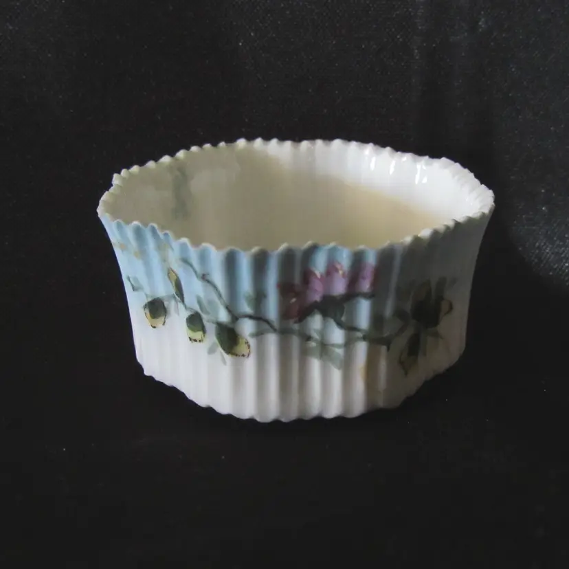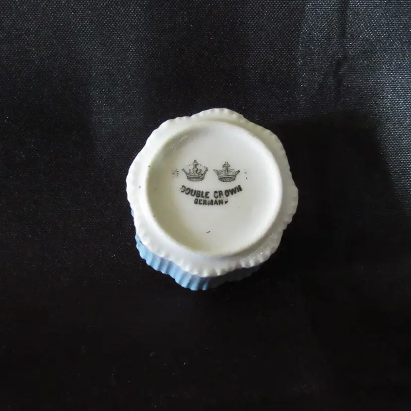 This porcelain salt is approx. 1" tall x 2" across. White porcelain with ring of blue and flowers.Marked Double Crown Germany. It is in excellent condition with no chips, cracks or breaks.