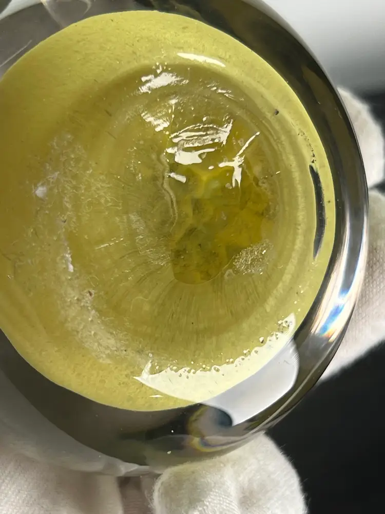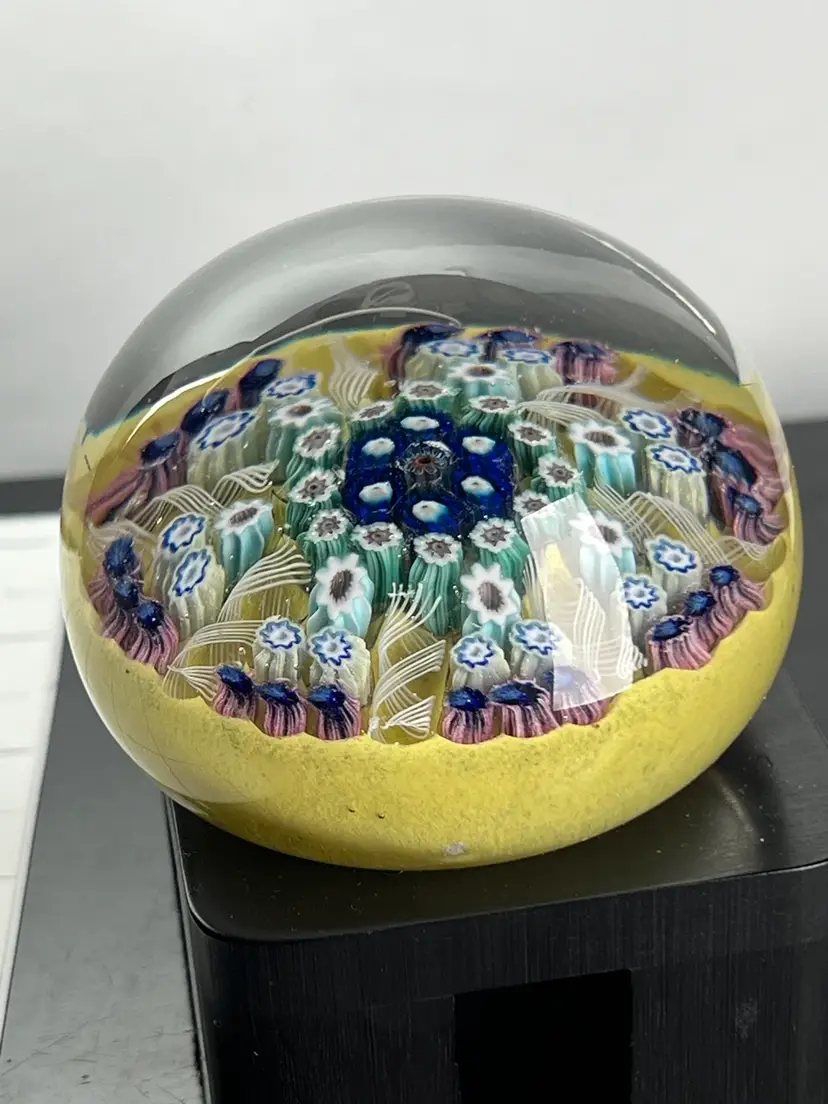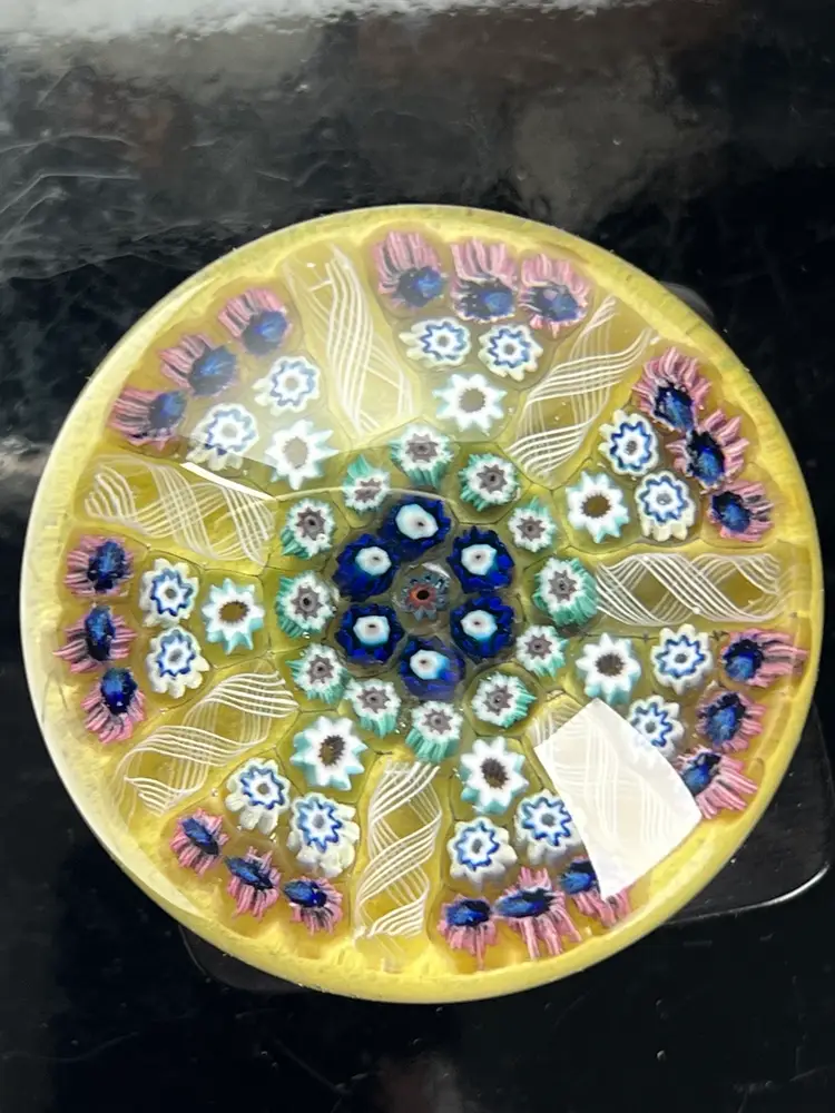 really nice yellow base with a 7 spoke Millefiori design. about 3" wide.