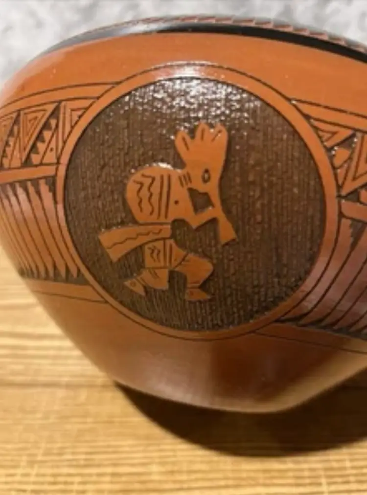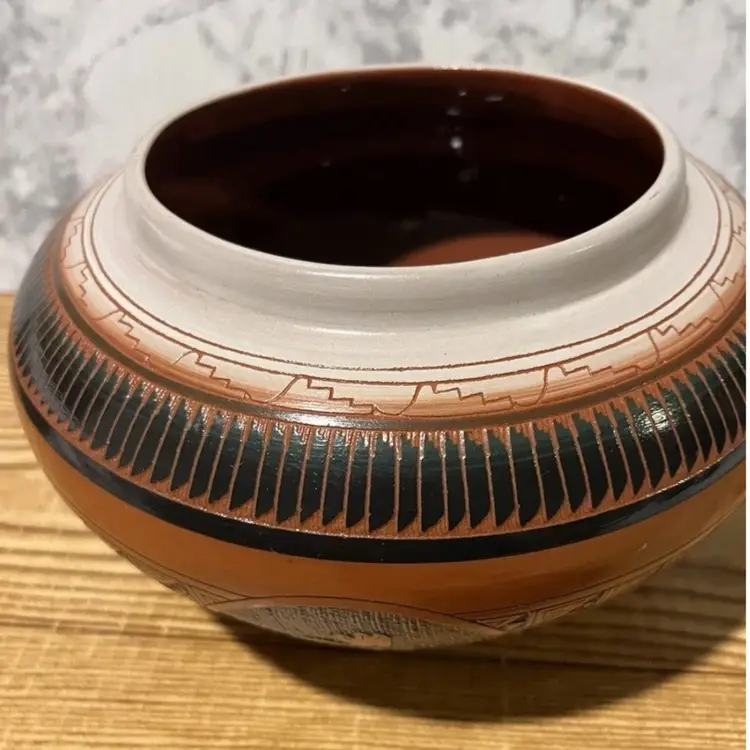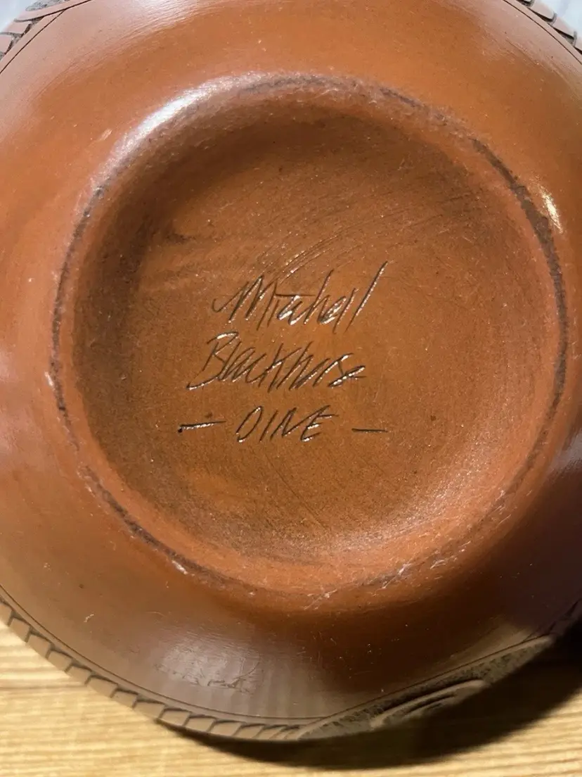 This Vase is a beautifully handmade piece of Navajo art by artist Mitchell Blackhorse. This Native American pottery vase showcases traditional craftsmanship and cultural design, making it a unique and collectible item. The intricate detailing and cultural significance of this piece make it a valuable addition to any collection of Native American art and crafts. Great condition with no chips or cracks. Review all pictures carefully for size, color and condition.