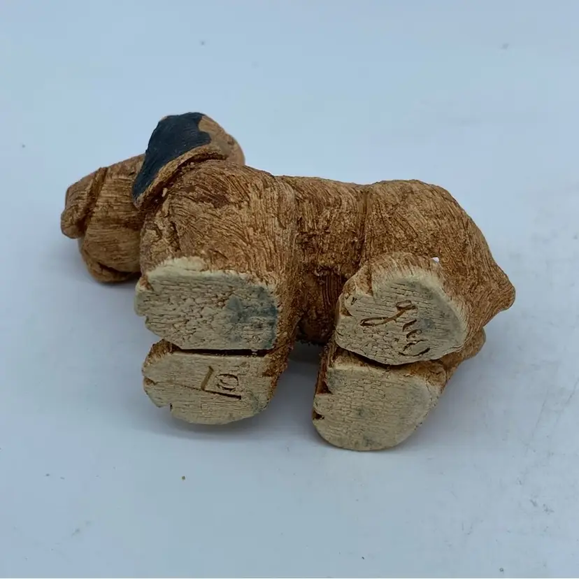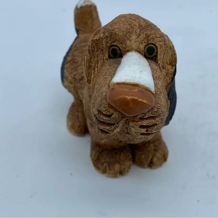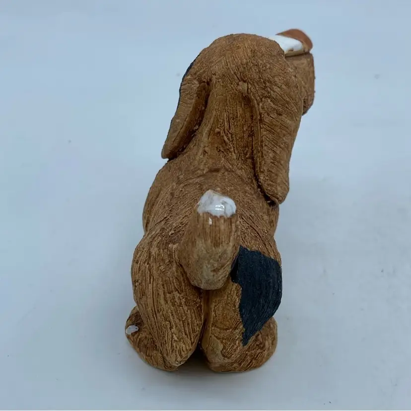 This particular basset hound figurine exemplifies the brand's signature aesthetic, featuring a textured body, expressive eyes, and the characteristic floppy ears of the breed. The combination of earthy tones with contrasting black and white accents on the tail and muzzle adds to its charm. Figurines from Artesania Rinconada are popular among collectors worldwide, appreciated for their quality craftsmanship and endearing representations of animals.