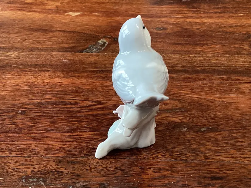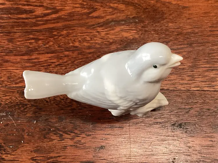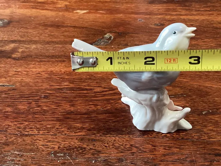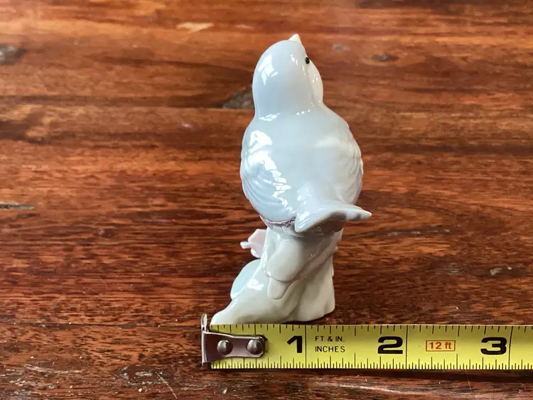 This bird stands 3 inches tall 3 1/2 inches long and 2 inches wide. No condition issues noted. Partial sticker on the bottom.