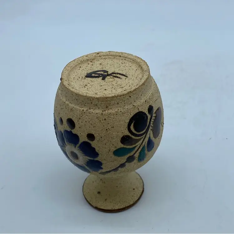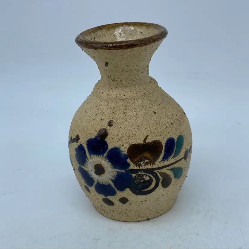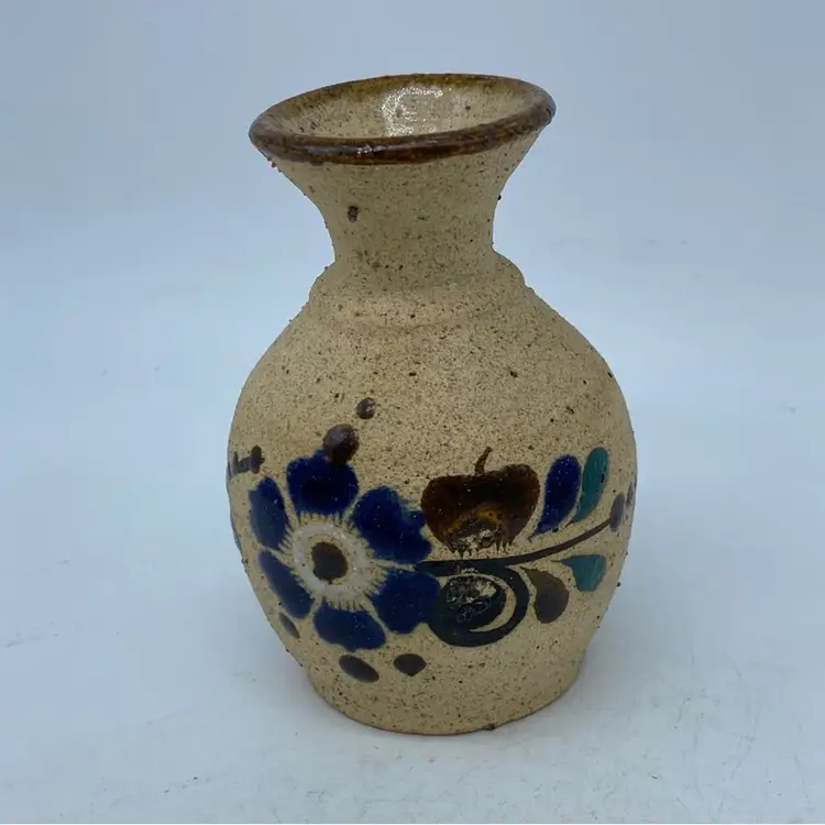 This particular vase, with its blue floral design on a speckled, earth-toned background, is representative of the common decorative ware produced in Tonala. While not typically considered high art, these pieces are popular collectibles, appreciated for their handcrafted charm and cultural significance. The style suggests it likely dates from the mid-20th century, a period when such decorative ceramics gained popularity internationally.