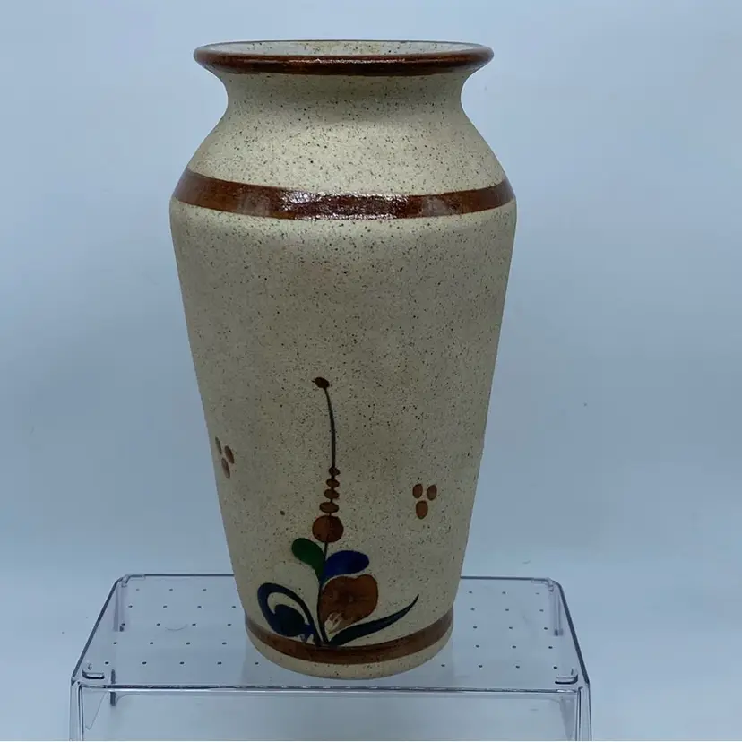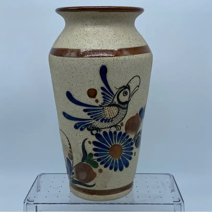 Tonala pottery is characterized by its earth tones, often incorporating speckled glazes and detailed brushwork. The "bird and flower" motif is a classic design element found on many pieces, symbolizing nature and prosperity. These vases are typically made from earthenware or stoneware and are appreciated for their artisanal craftsmanship and cultural significance.