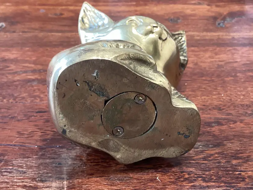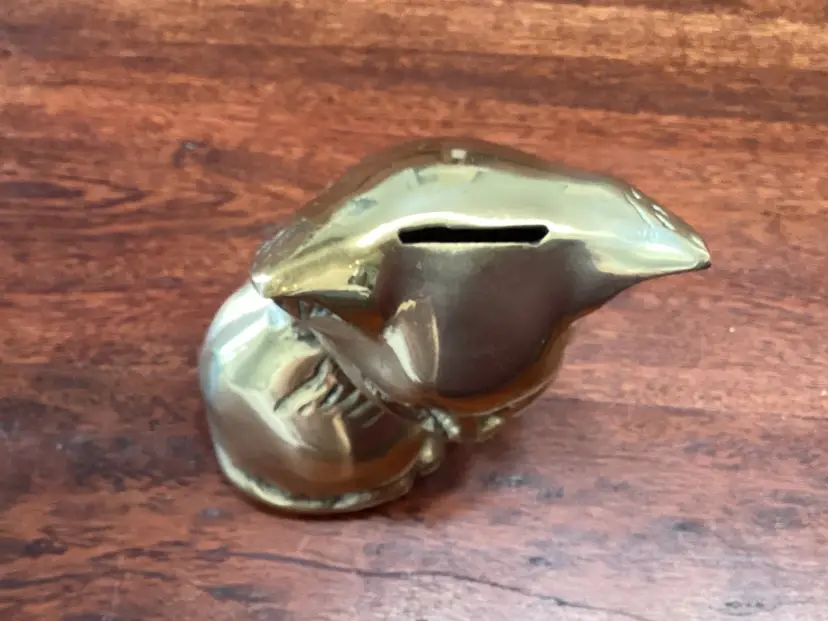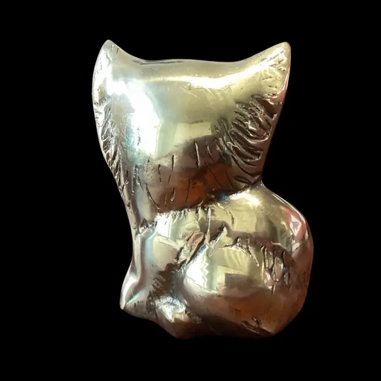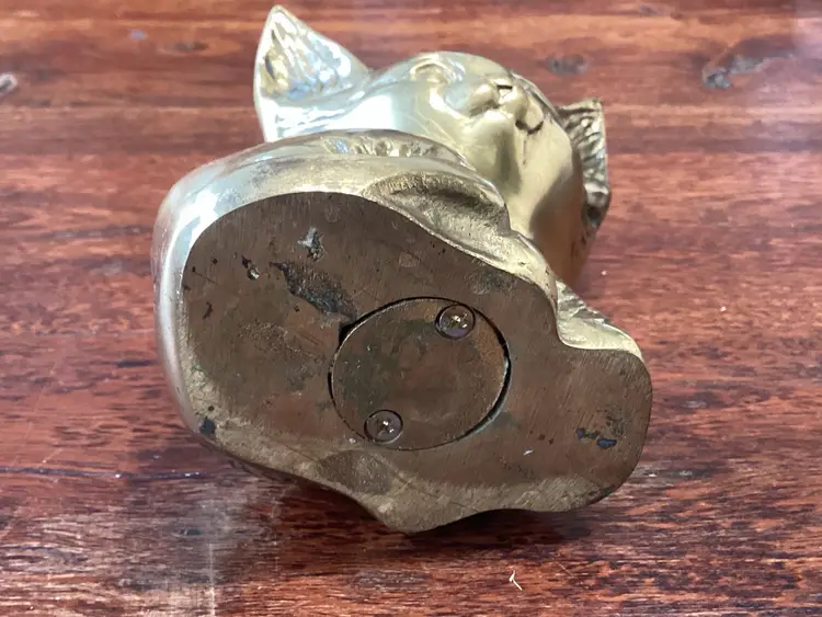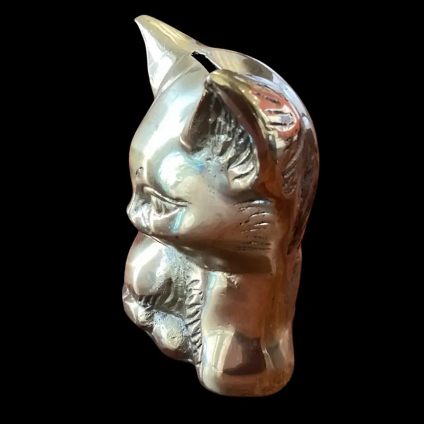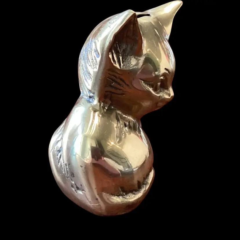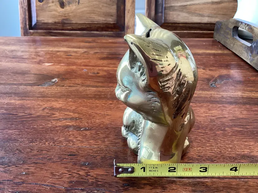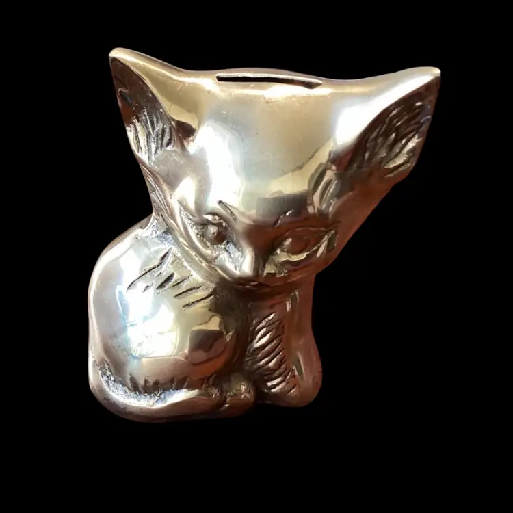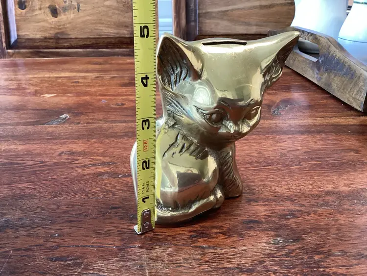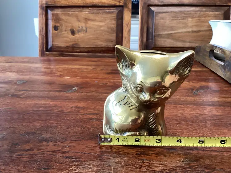 The brass cat bank is approximately 4 3/4 inches tall 4 inches long and 3 inches wide. There are no condition issues noted.