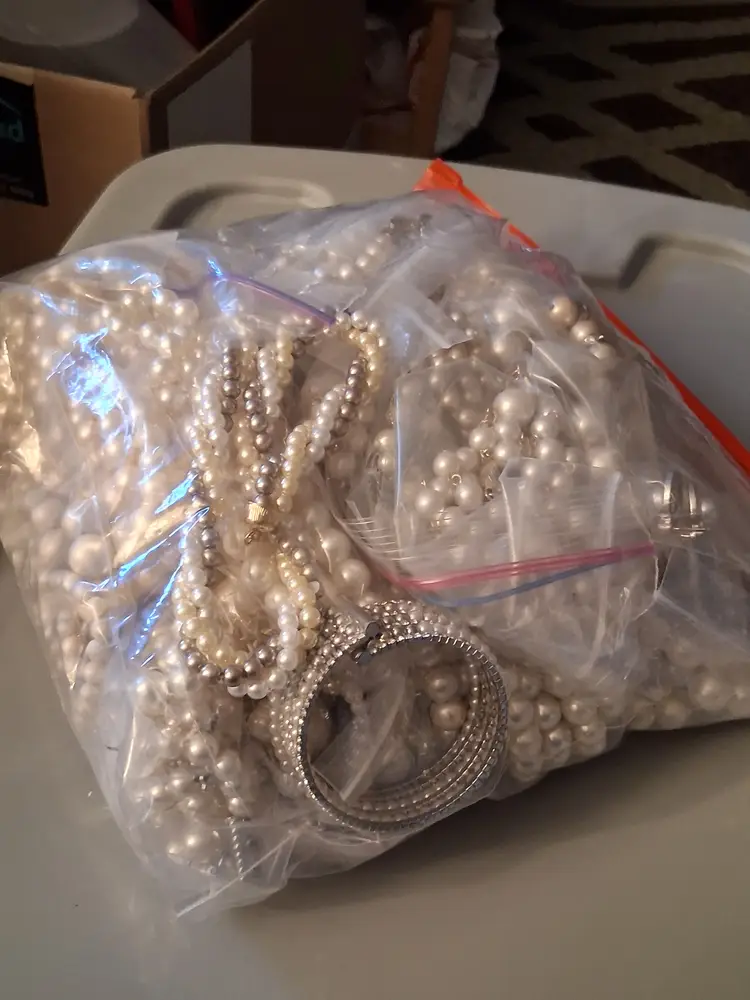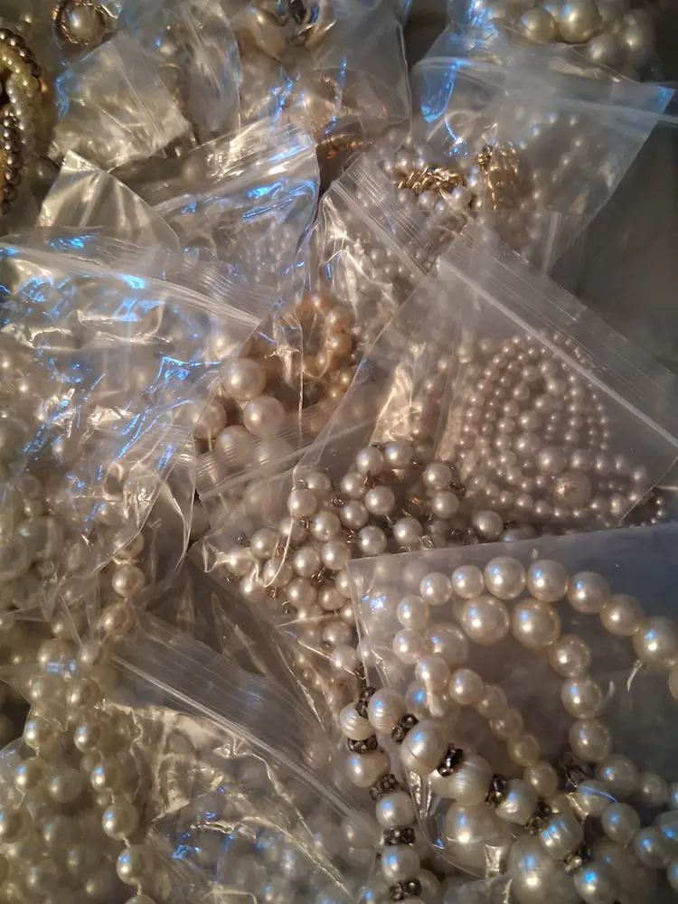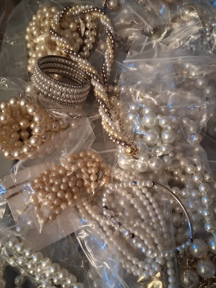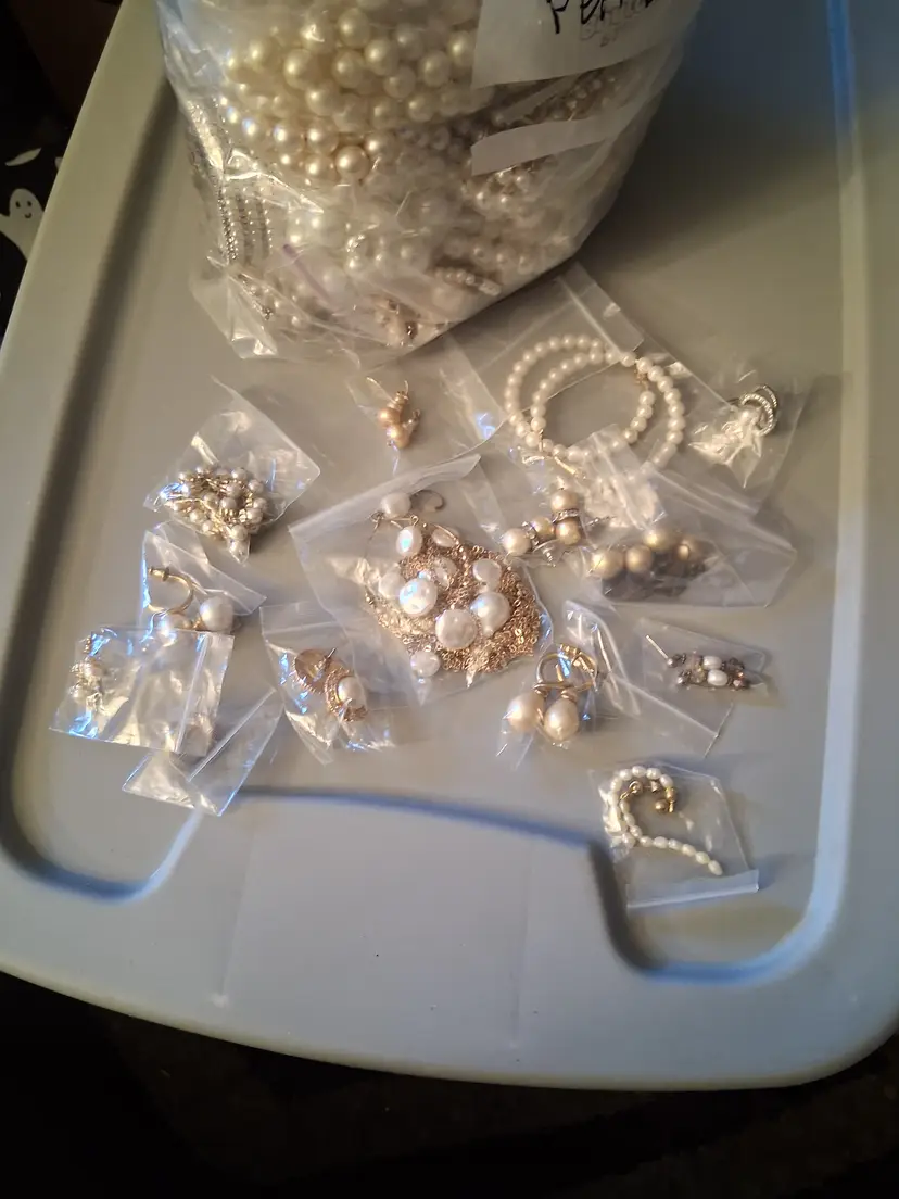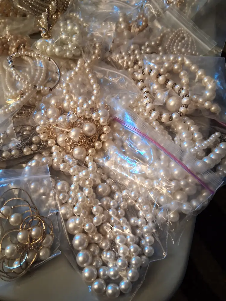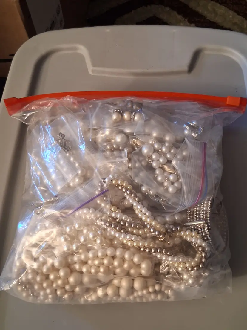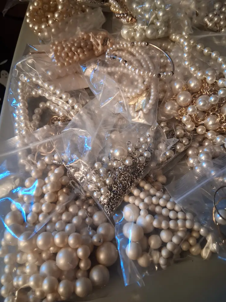 This is a 3 lb. 10 oz. lot bag of vintage to modern, all wearable and mostly all bagged, beautiful, costume, man-made, faux and some real pearl/cultured/fresh water pearl, jewelry, consisting of, many necklaces, and some earrings & bracelets. Can also use for upcycling/crafting! Perfect for vintage shops, especially bridal!! I have not tested any of these, but you can tell some are real and others are not.