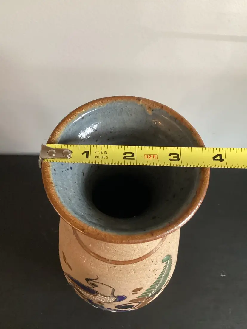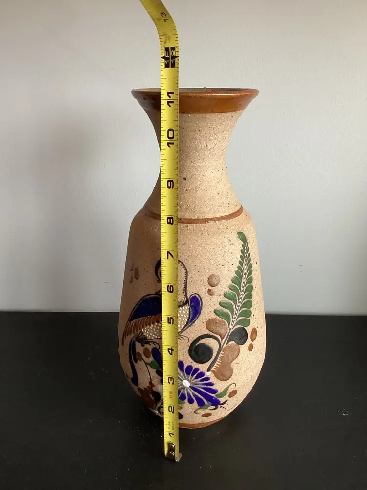 This Tonala vase measures 11 inches tall. It has no condition issues. It is decorated with a beautiful bird and floral motif.