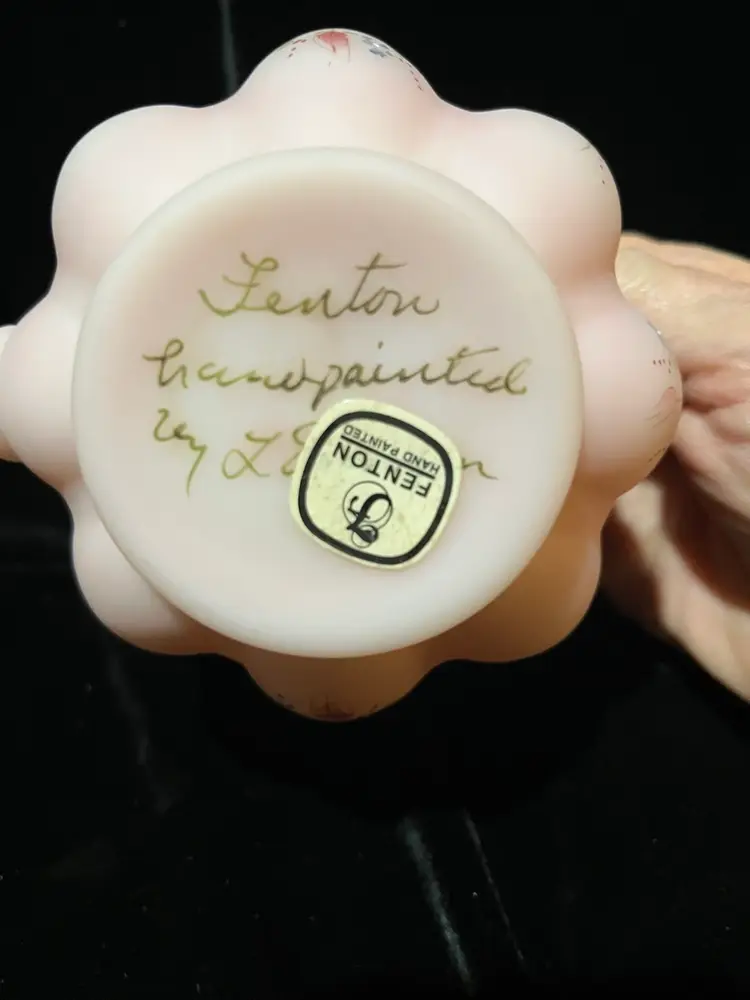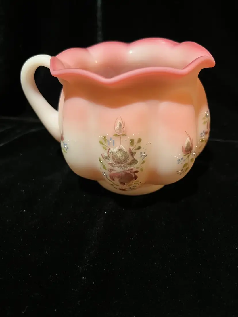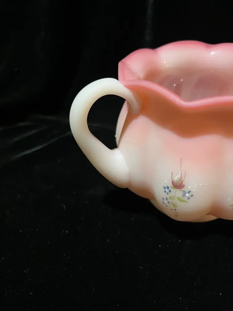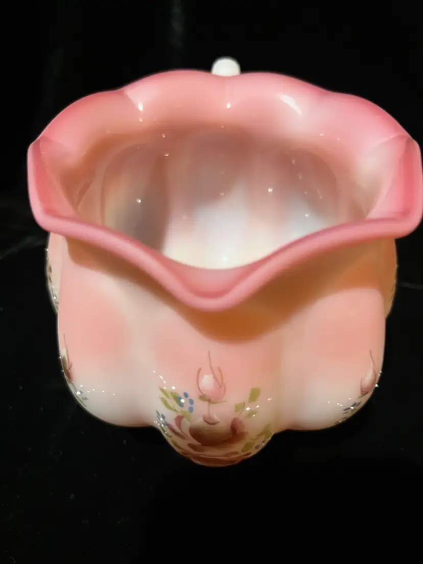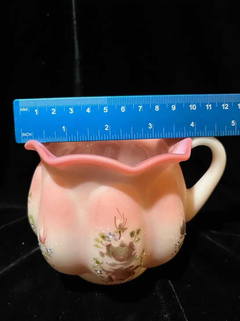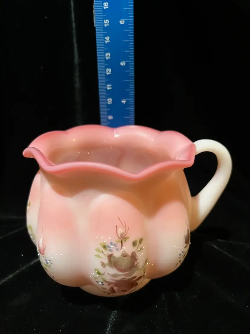 Hand painted, signed Fenton Rosalene creamer. No condition issues. Approx 4.5@x3.5”