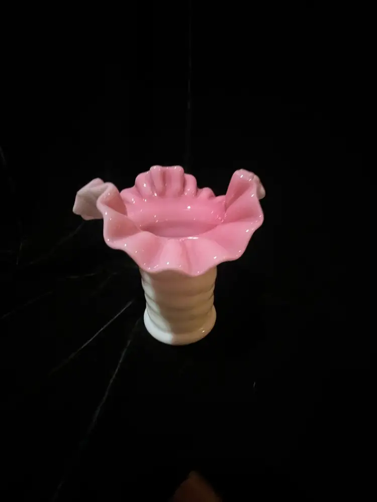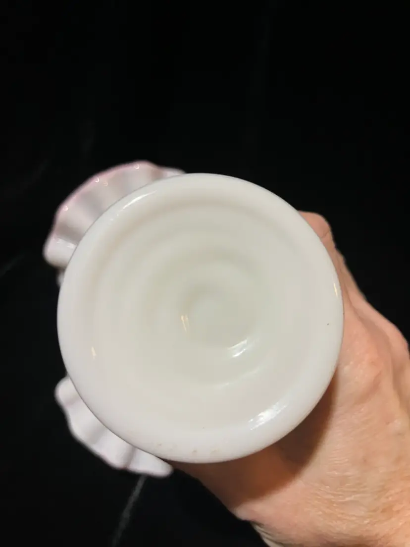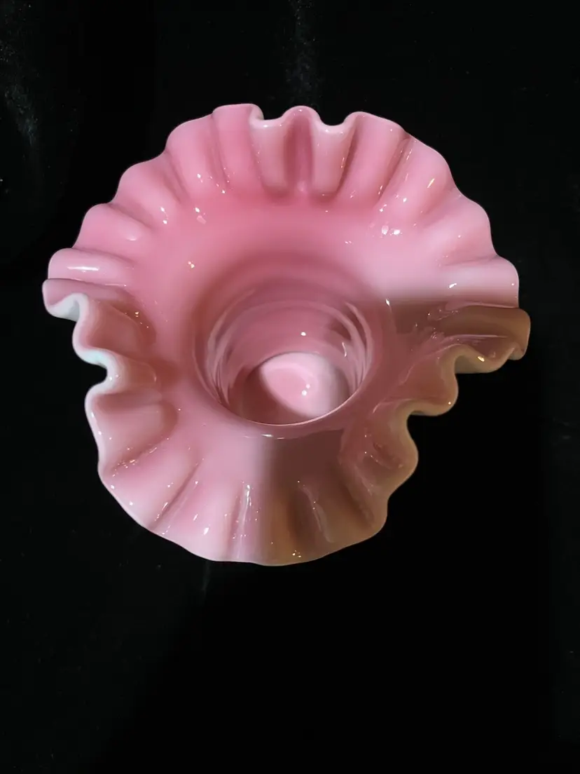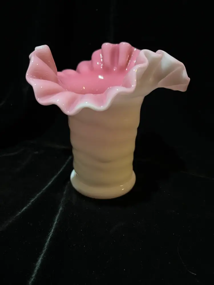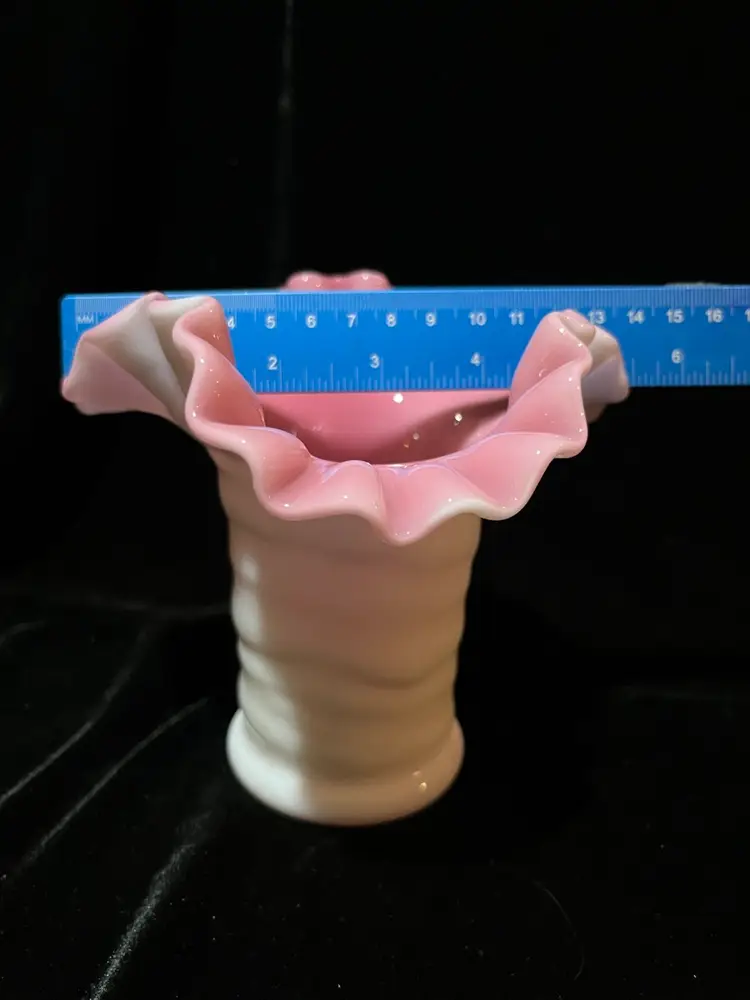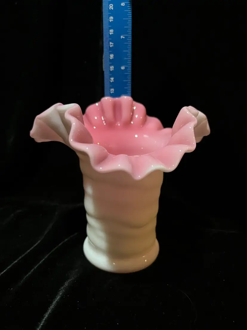 Beautiful Fenton pink overlay ruffled vase. Approx 5x6.6”. No condition issues.