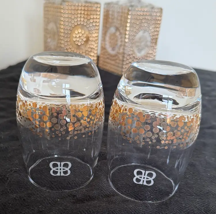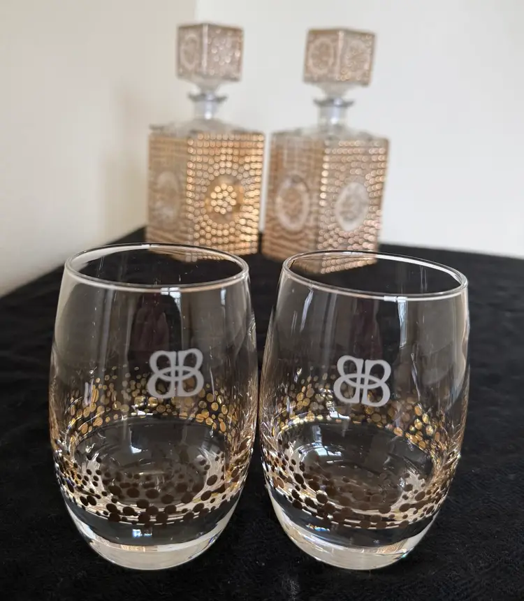 Bailey's Irish Cream is a liqueur produced by R&A Bailey & Co. in Dublin, Ireland. These particular glasses featuring a stylized logo and a decorative pattern of gold dots, is a typical example of promotional barware. these glasses can hold collectible value for fans of the brand or those interested in vintage barware.