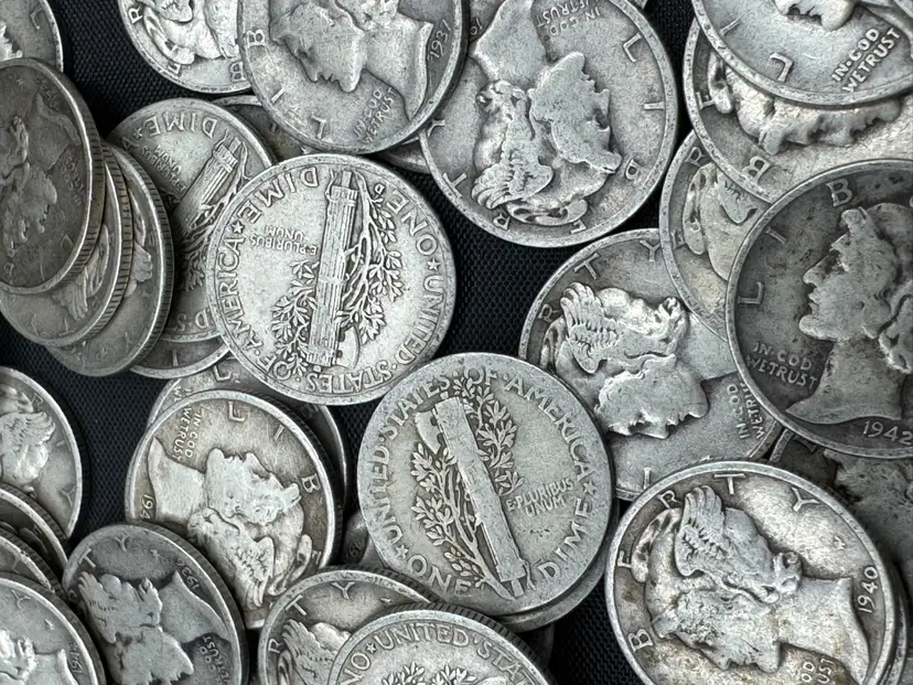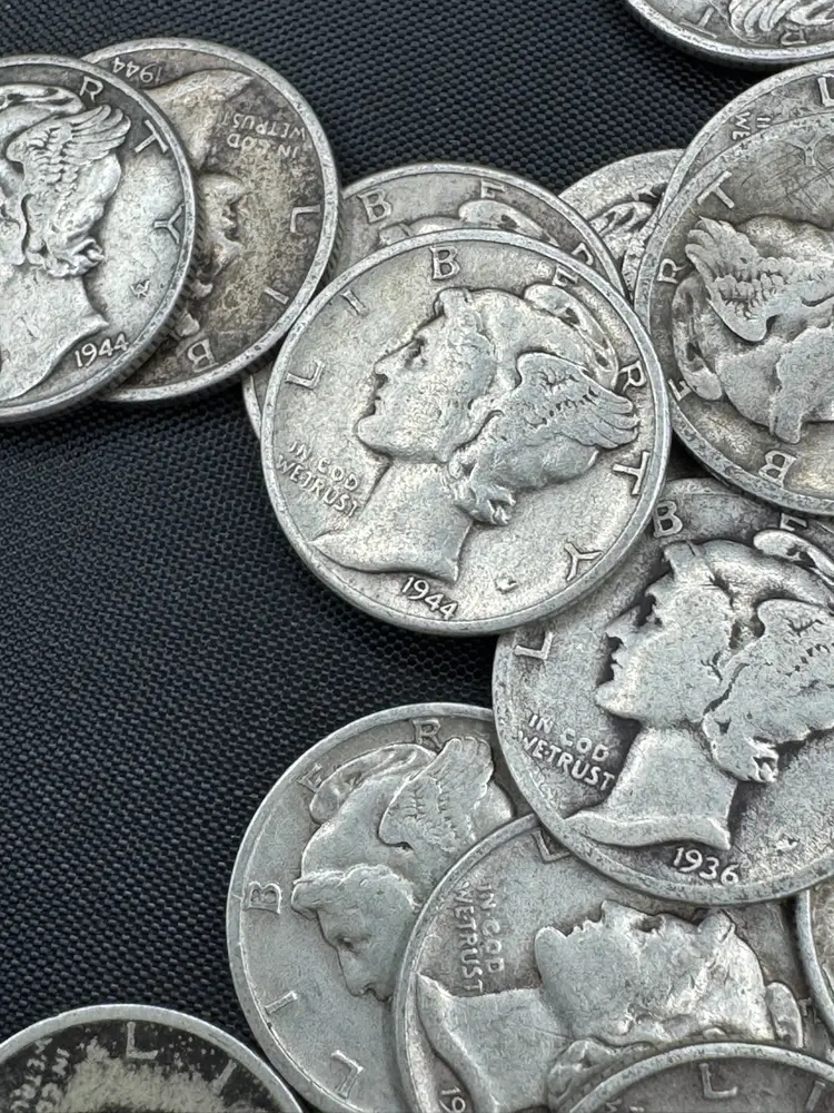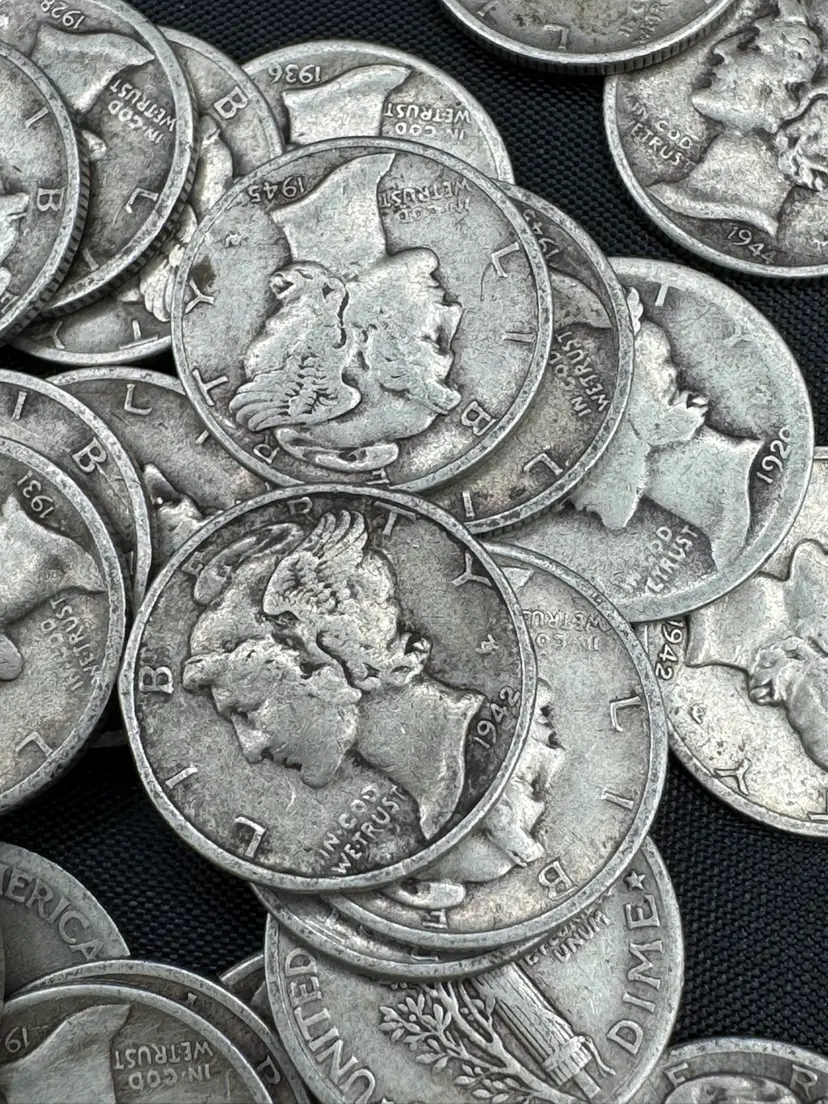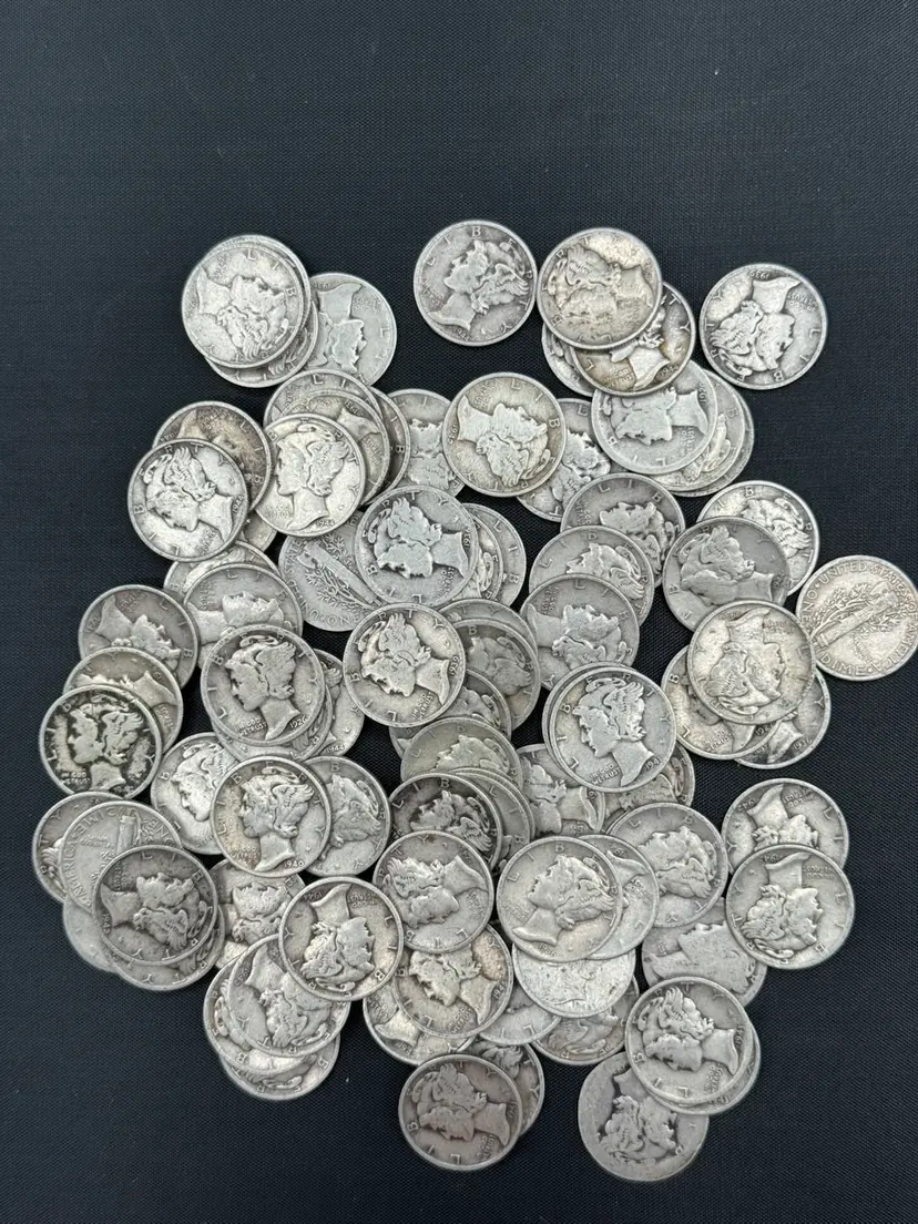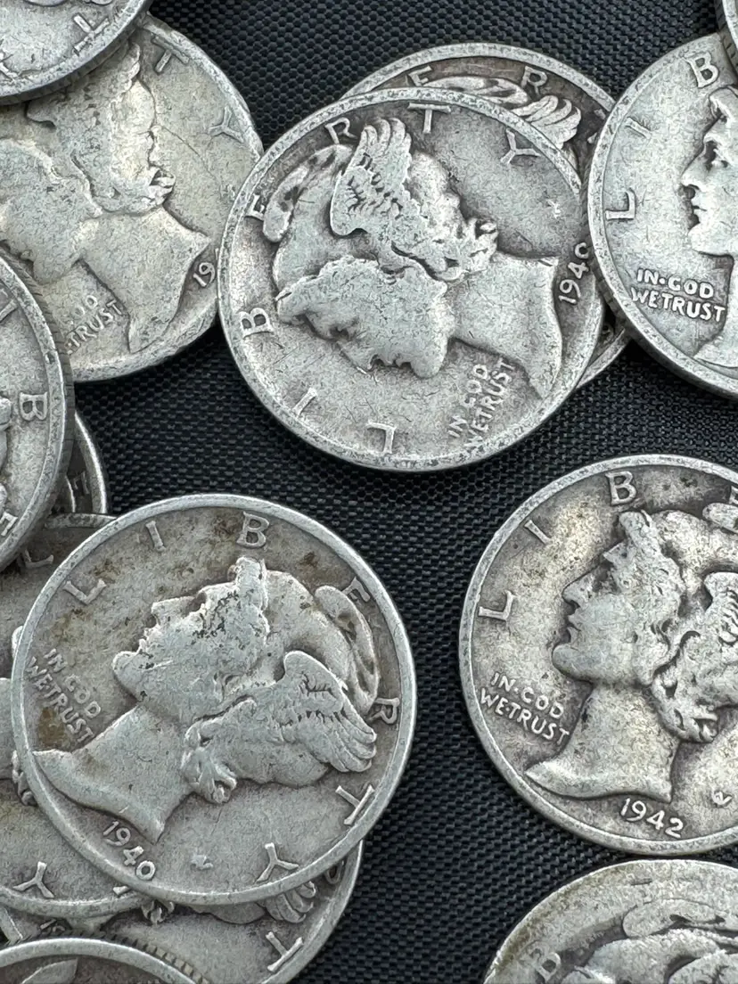 Mercury dimes, produced by the U.S. Mint between 1916 and 1945. Composition: These coins are composed of 90% silver. Design: The obverse depicts a profile of Liberty wearing a winged cap to represent freedom of thought, while the reverse features a fasces and an olive branch.