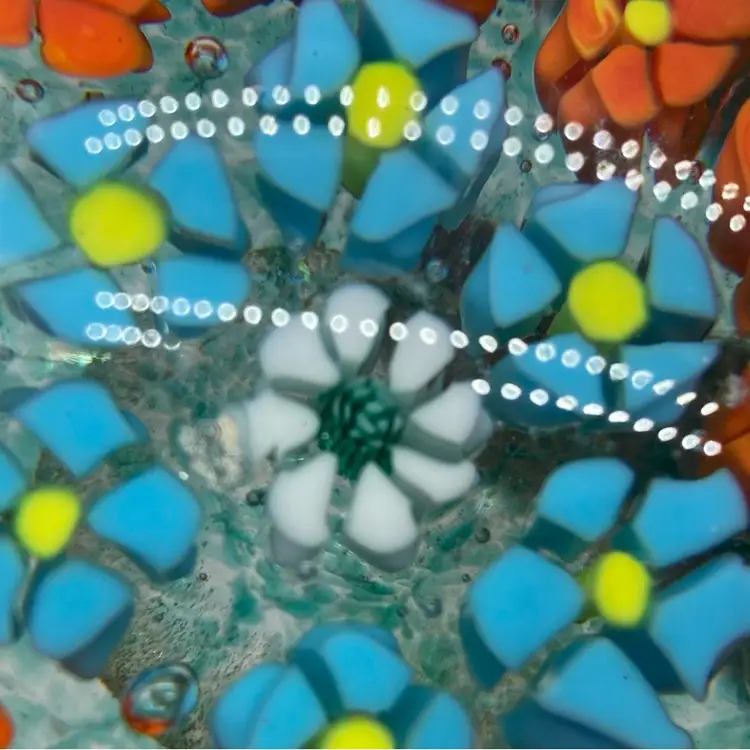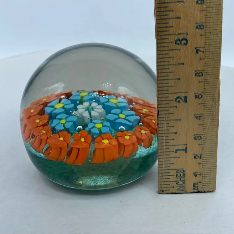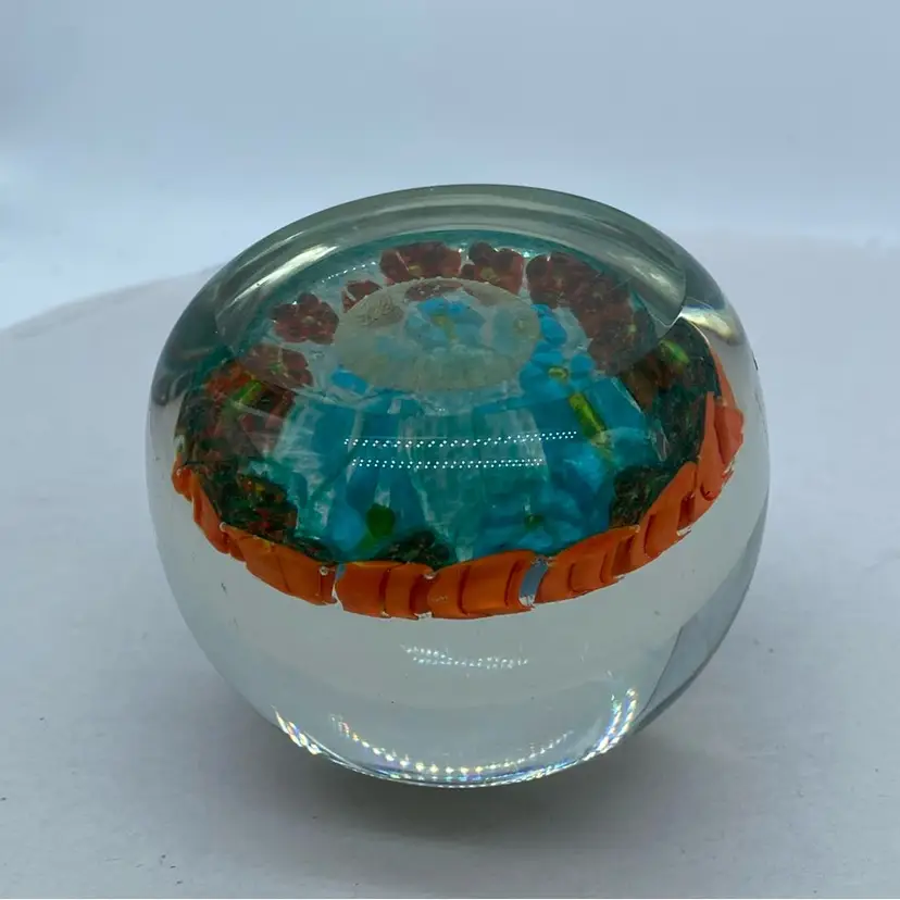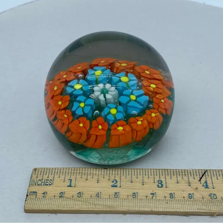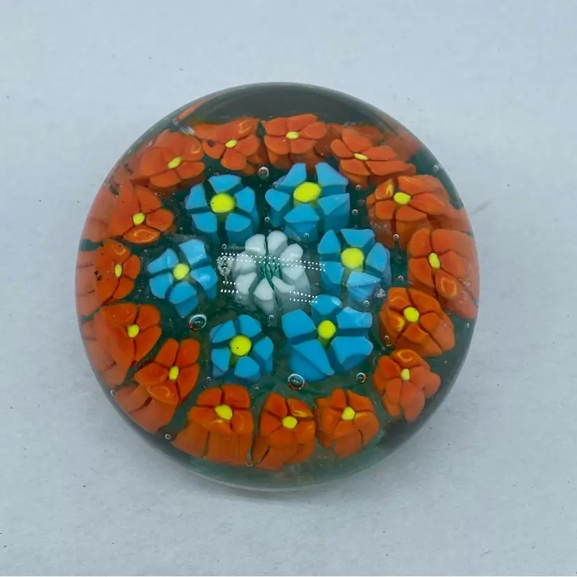 Orange Blue and white chunky canes Approx 3.5 x 3 inch No chips or cracks Polished base