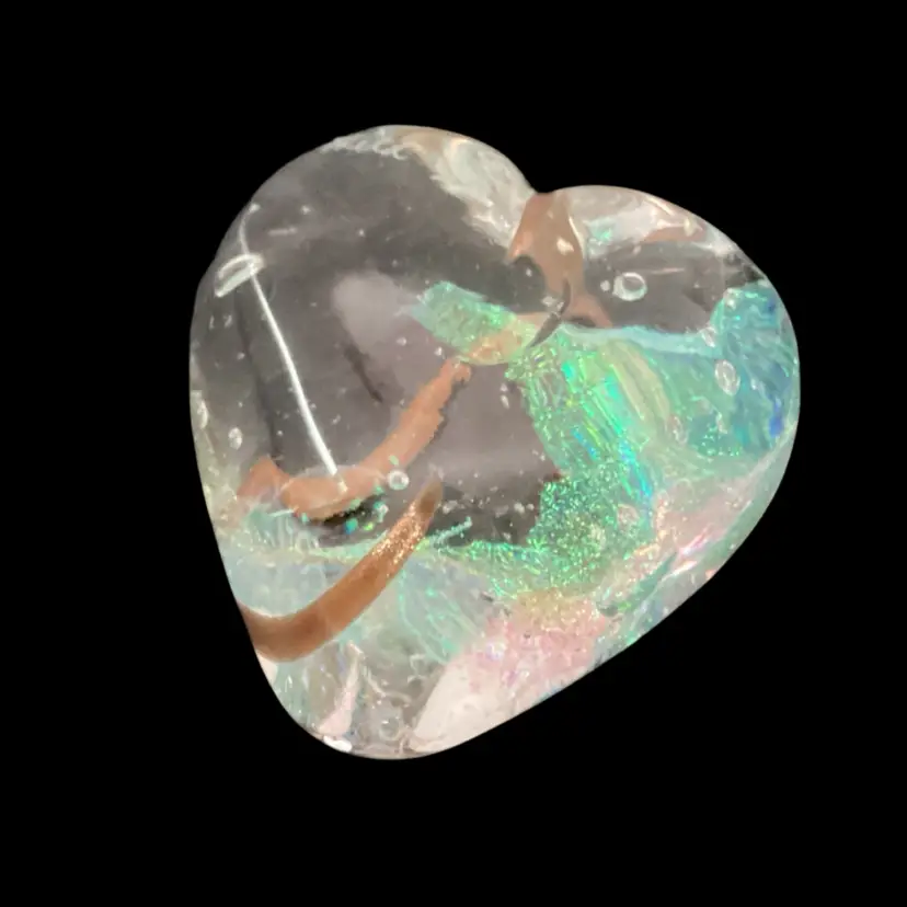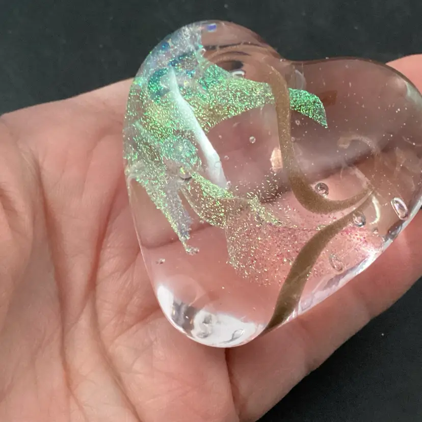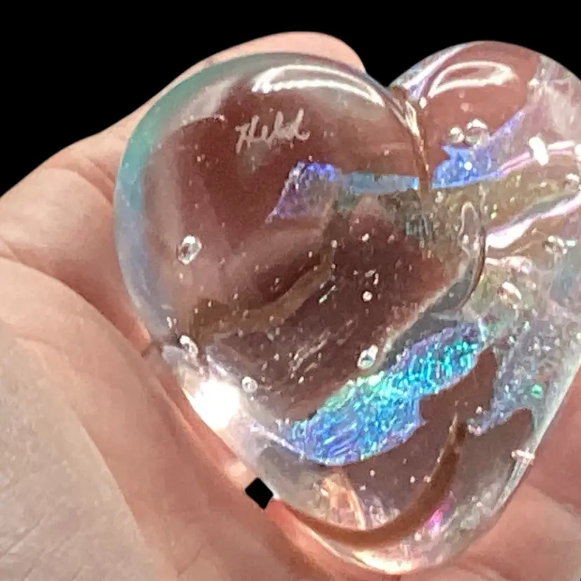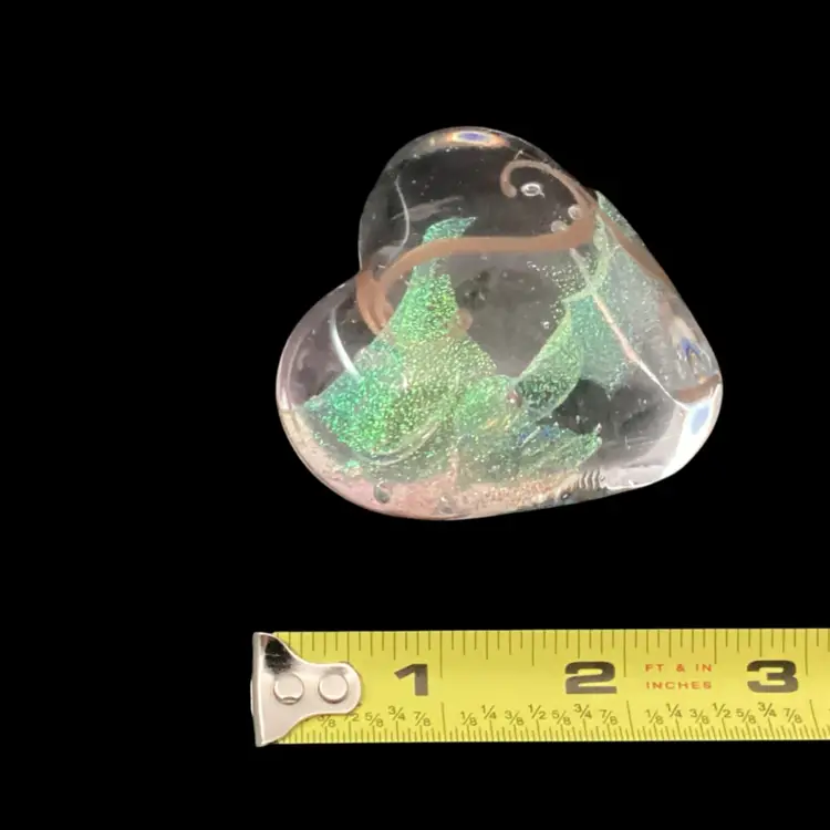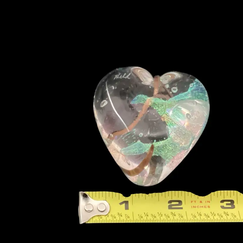 This paperwork has no condition issues noted. It has a beautiful gold swirl inside a clear glass heart. There is areas of iridescent glass throughout.