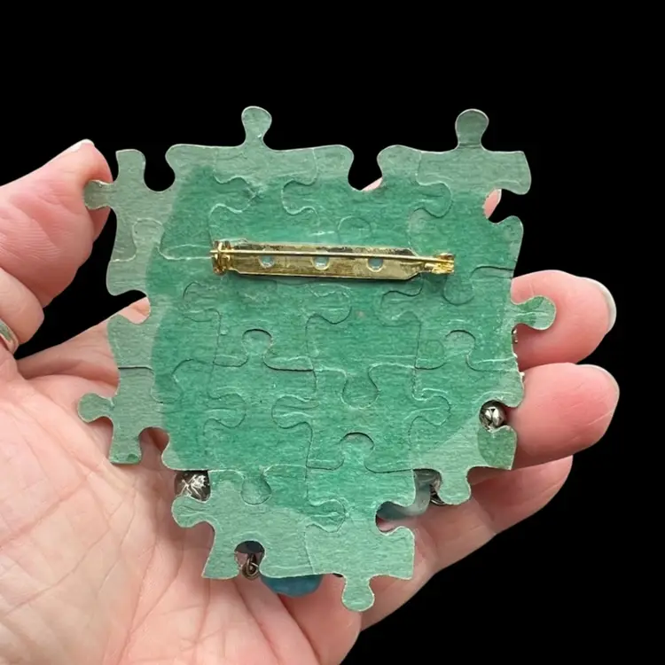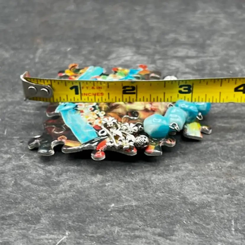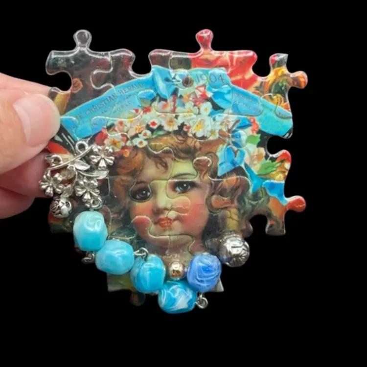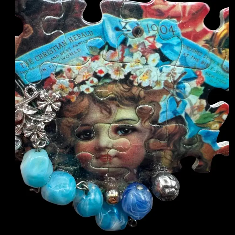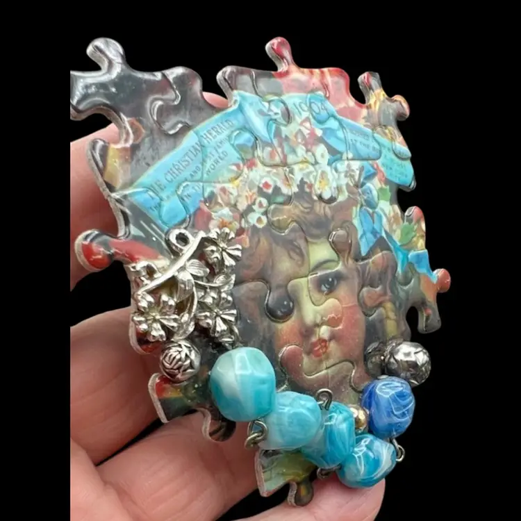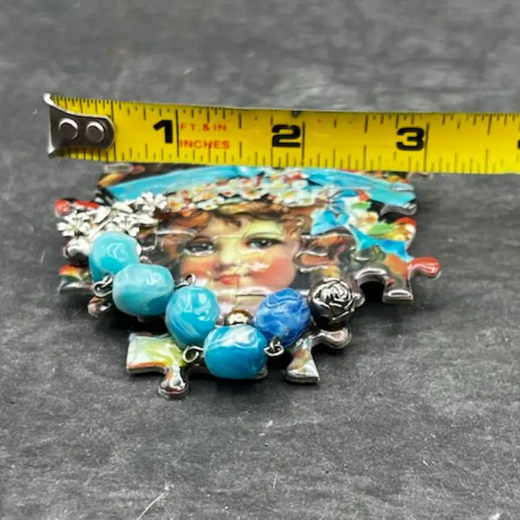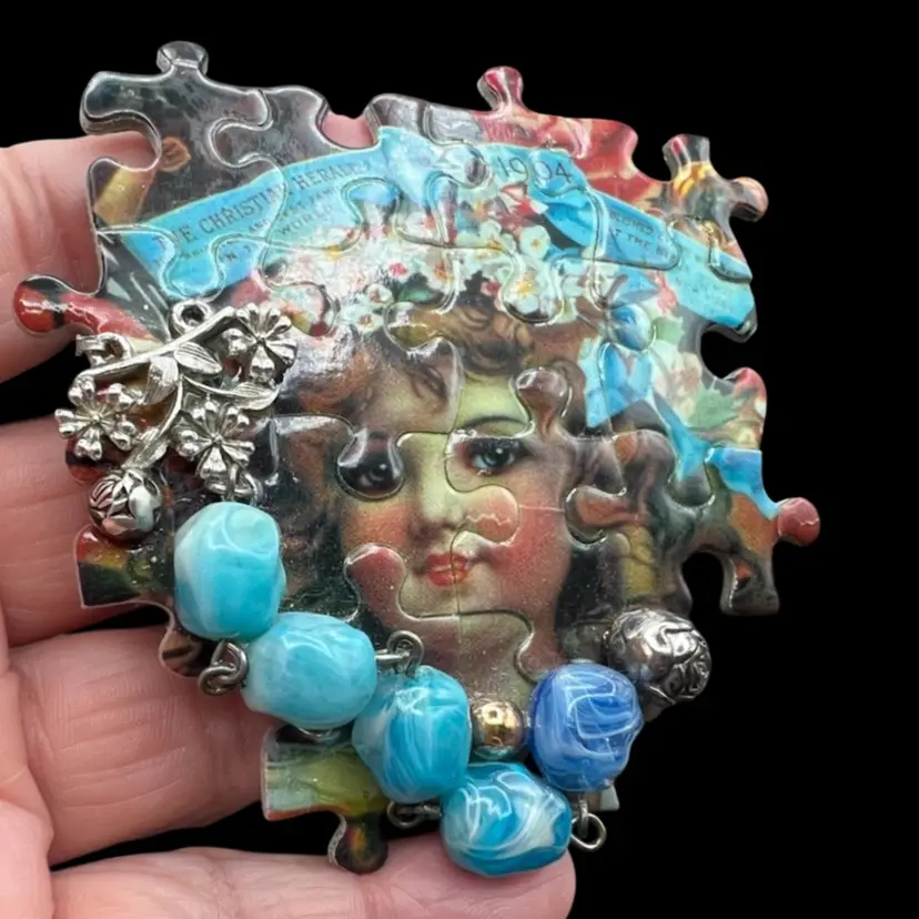 Vintage Handmade Brooch Made From An Old Puzzle Of A Victorian Girl Adorned With Beads And Baubles In good vintage condition very colorful Measures just over 3” x 3”