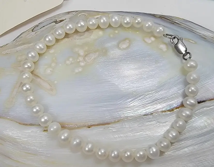 Timeless elegance! The perfect little pearl bracelet to go with your little black dress! 7 ½” long fresh water pearls with sterling clasp, marked 925. It is in excellent condition and just in time for the holidays!