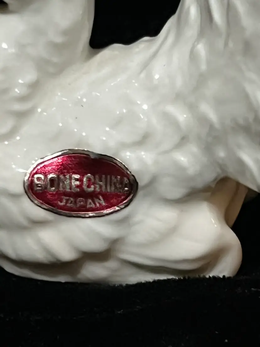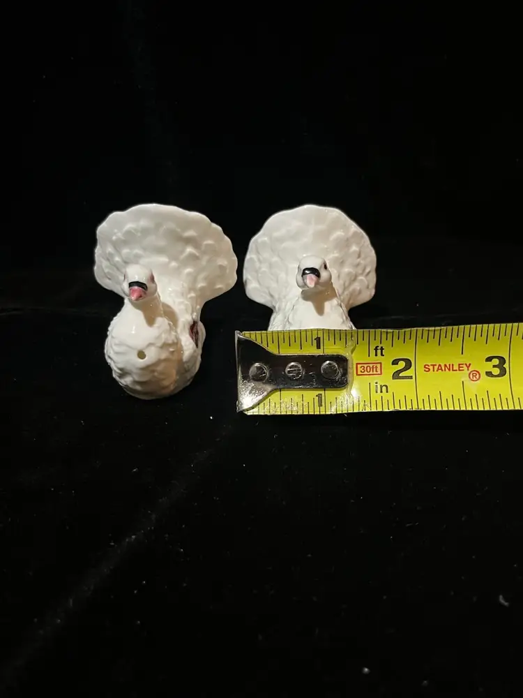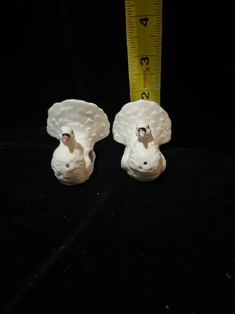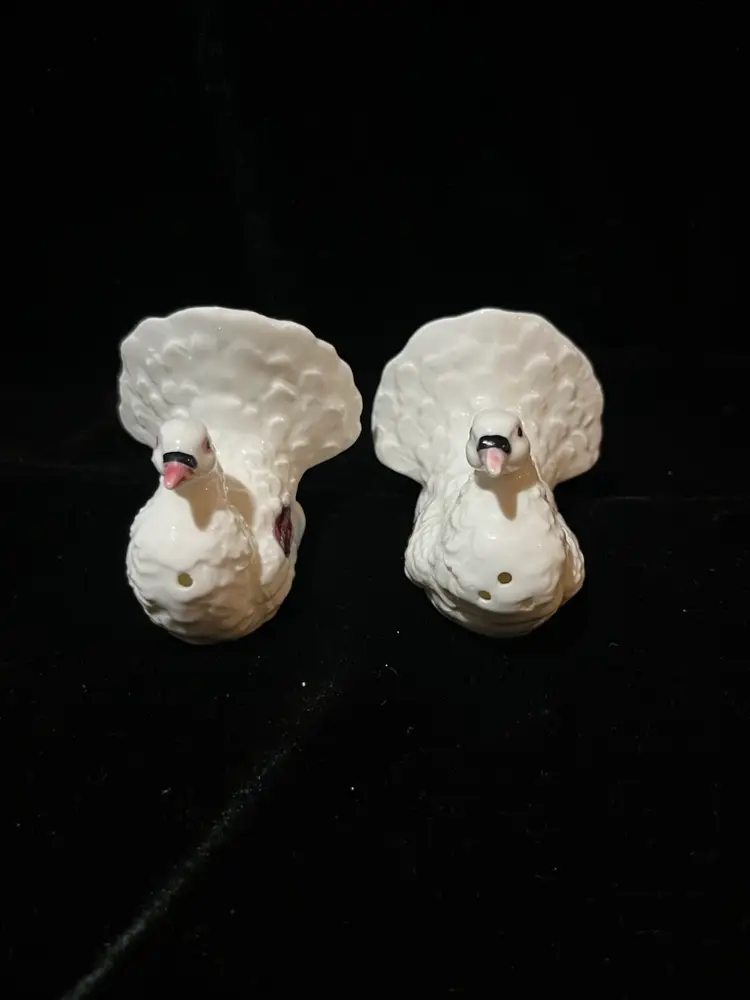 Nice pair of vintage bone china salt and pepper shakers with original stickers made in Japan. There are some flea bites on the back of the tails as shown in the pictures. Absolutely beautiful otherwise. Measures approximately 1.75” tall and 1.5” wide.
