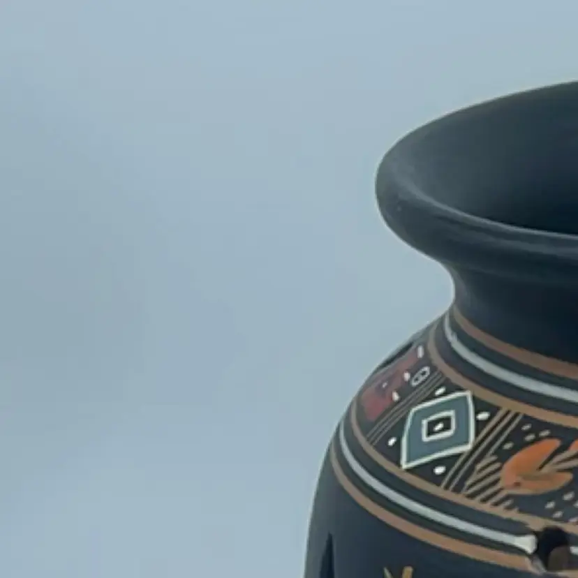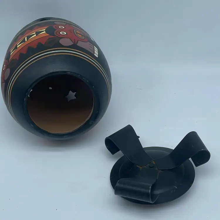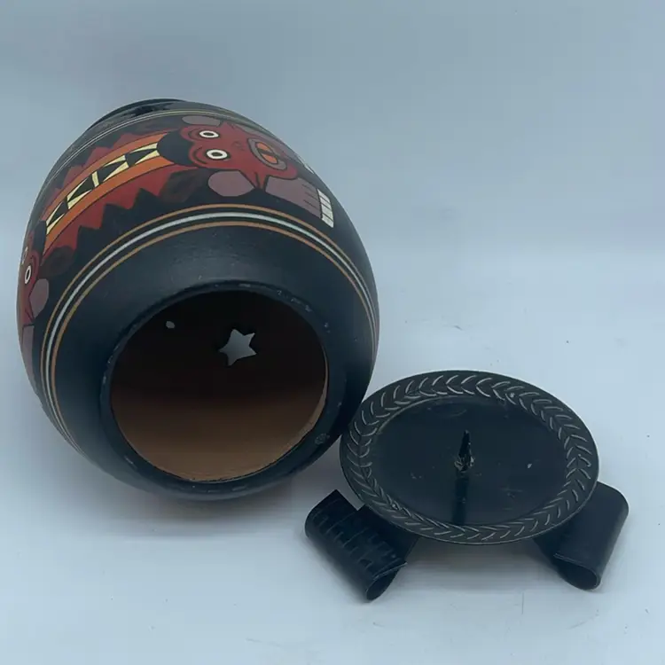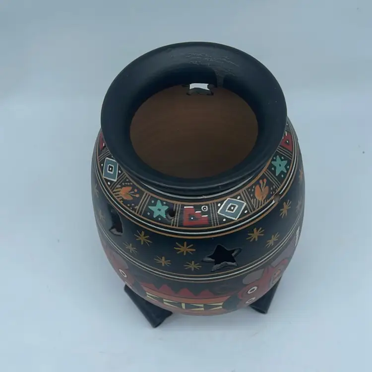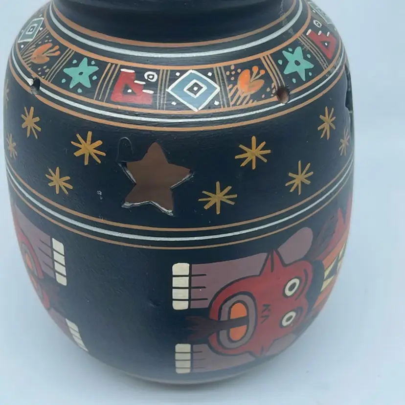 8.5” tall. No chips or cracks. Hand painted. The use of pottery as lanterns or luminarias has a long history across various cultures, particularly in regions where light sources were precious. These vessels often featured perforations or intricate designs that allowed candlelight or other forms of illumination to escape, creating atmospheric effects. Such items were commonly used during festivals, religious ceremonies, or simply to provide ambient lighting in homes.