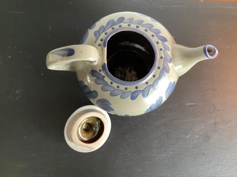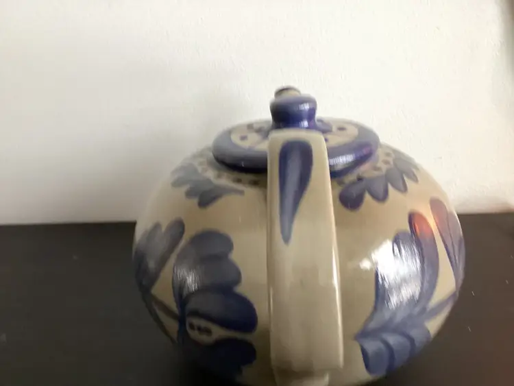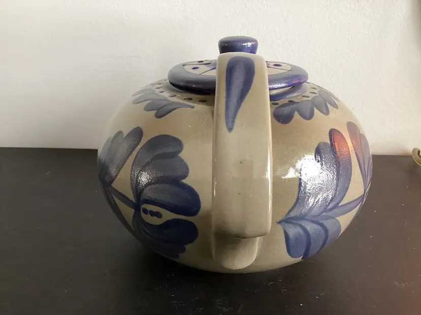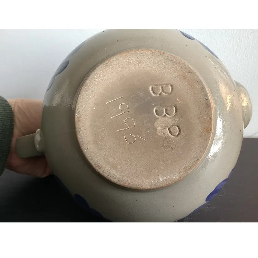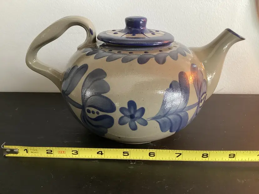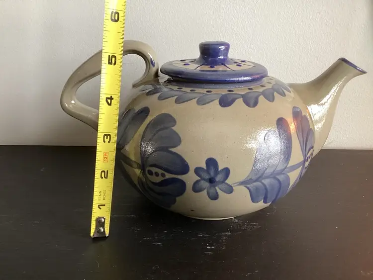 This BBP tea pad scans approximately 5 1/4 inches tall and is 9 1/2 inches from handle to tip of spout. There is one tiny chip out of the spout as shown in pictures. Otherwise an excellent condition. It is signed on the bottom and dated 1995.