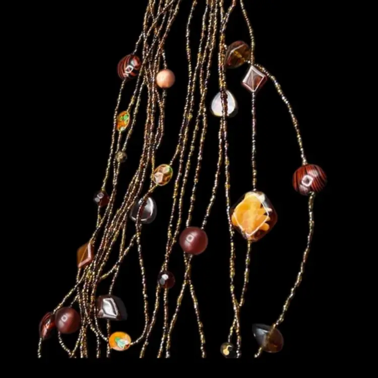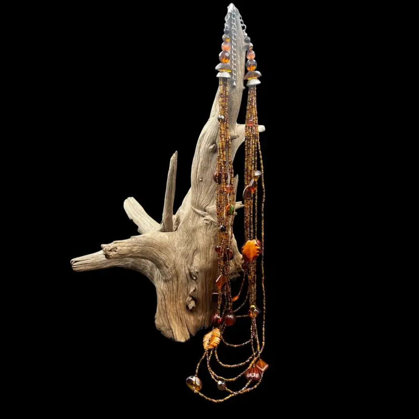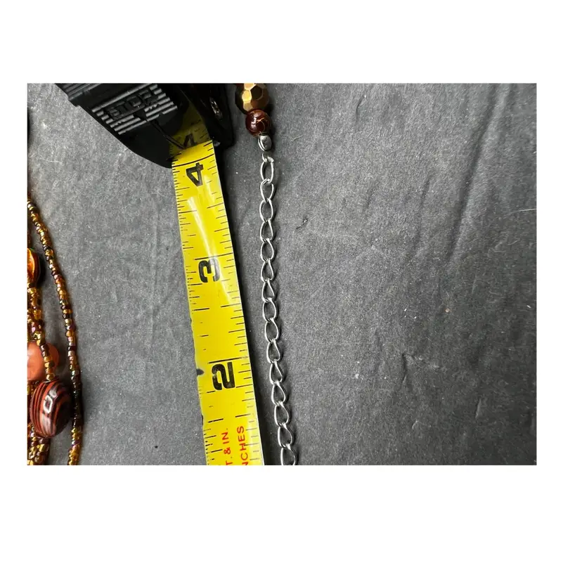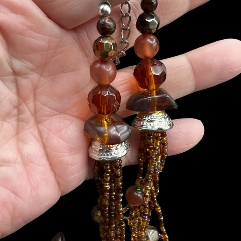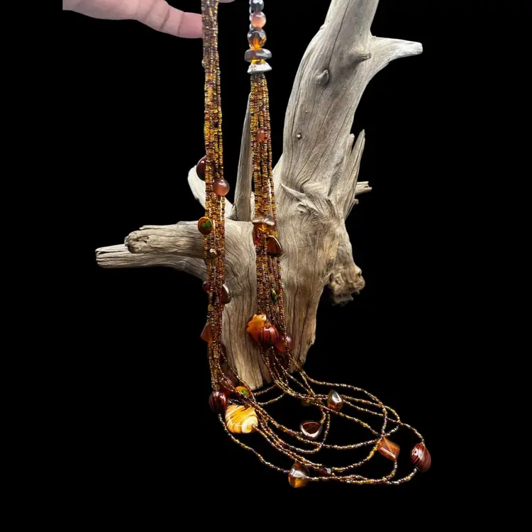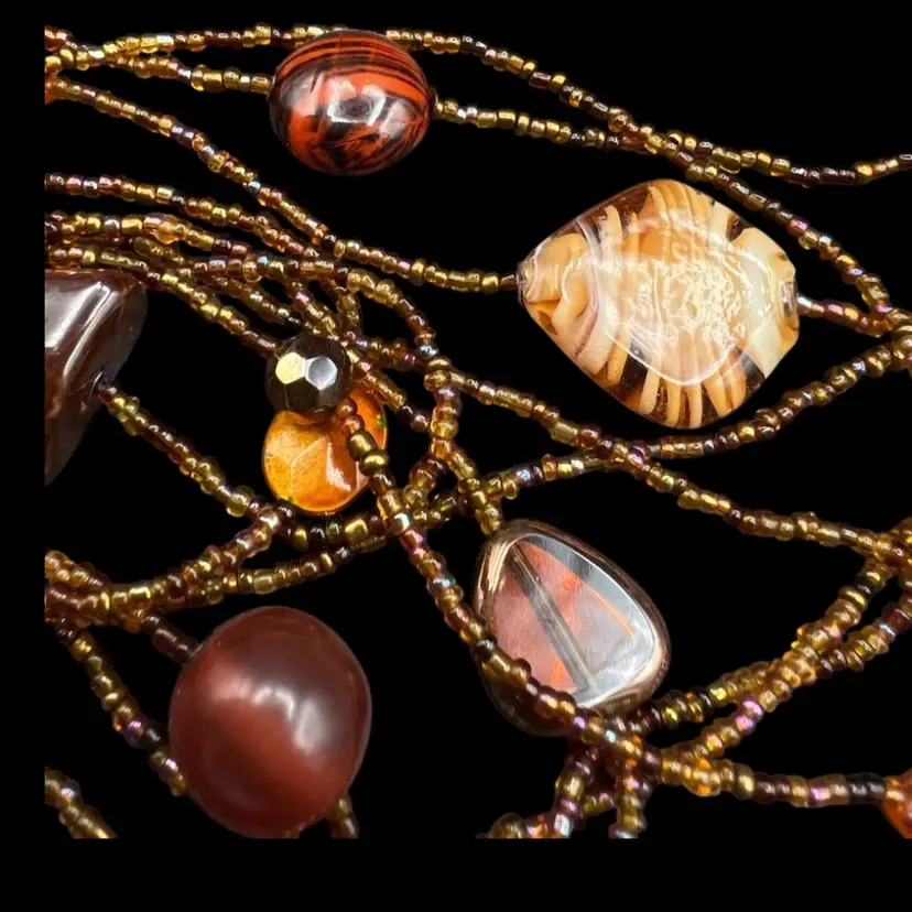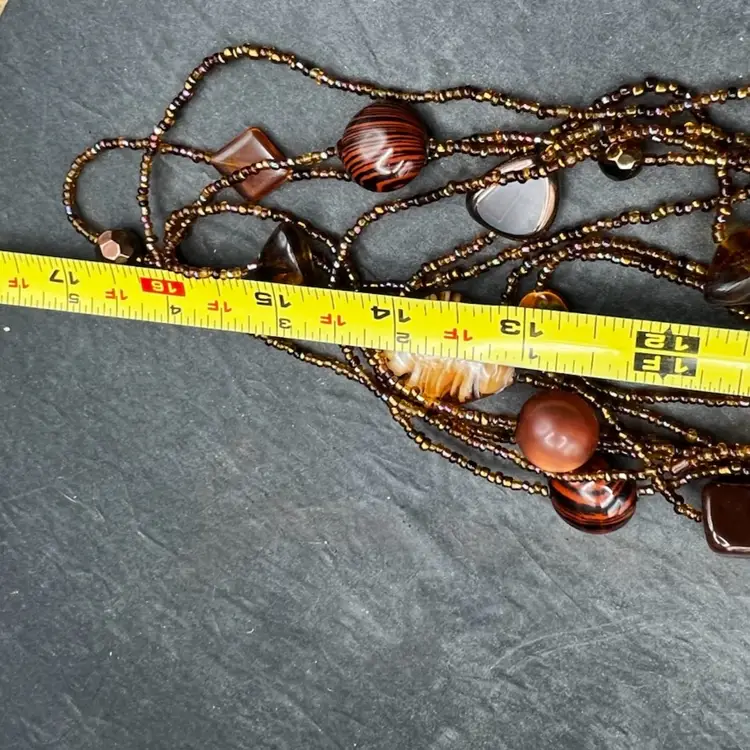 343A Beautiful 7 Strand Multi Layer Necklace In Brown Tones. Glass, Stone And Plastic Beads Shortest Strand Is 26” With The Addition Of 4” Drop To The Longest Strand. Also Has A 4” Extender Excellent condition
