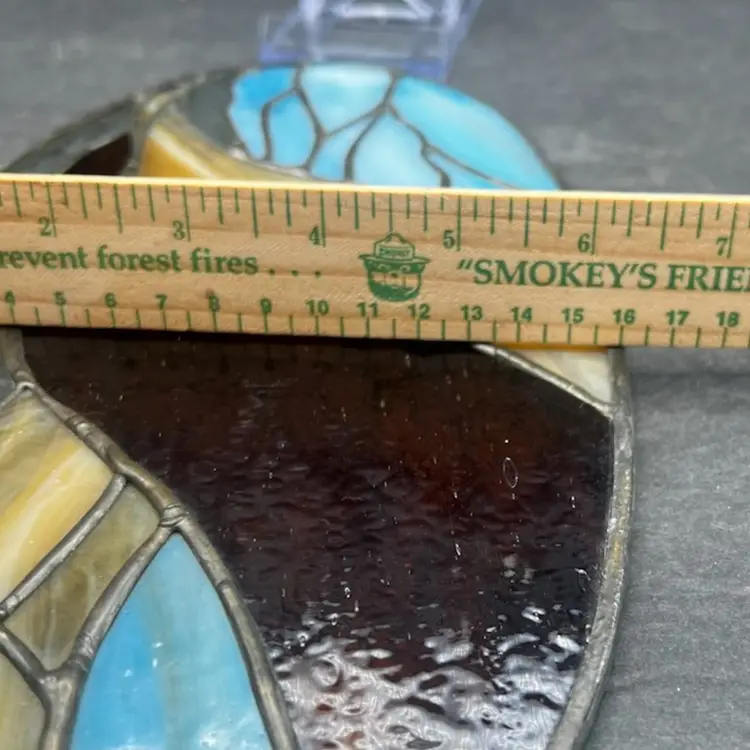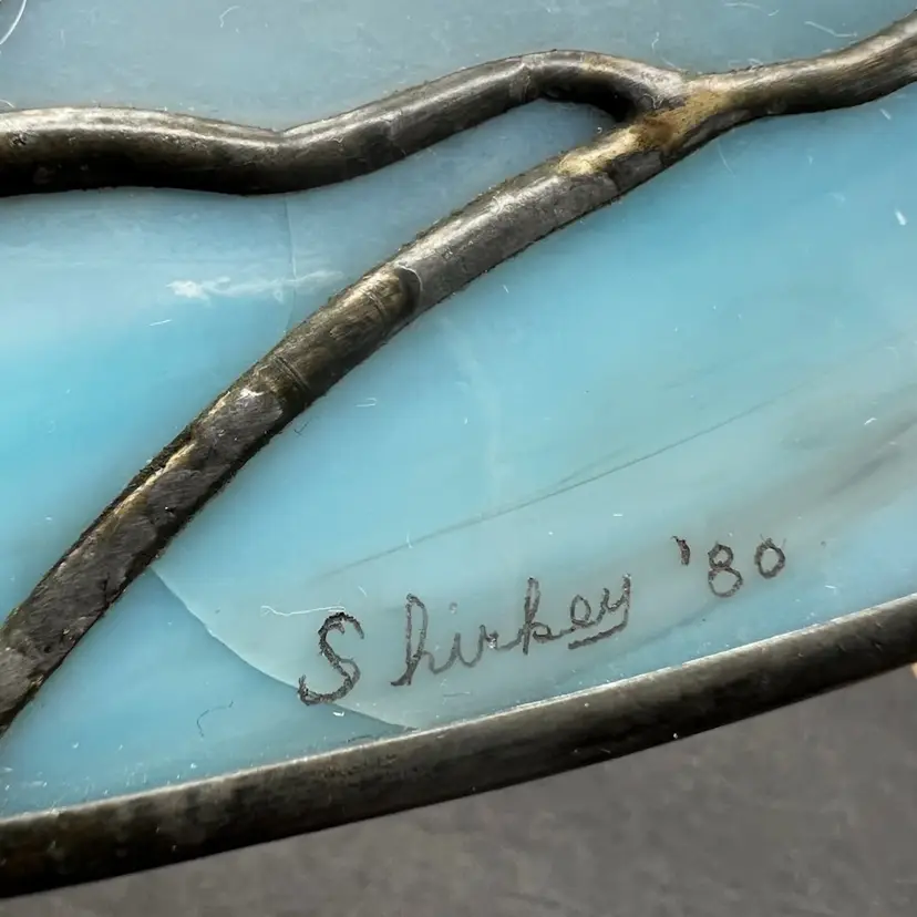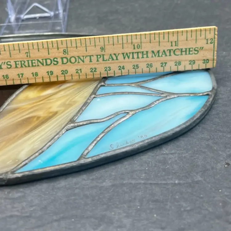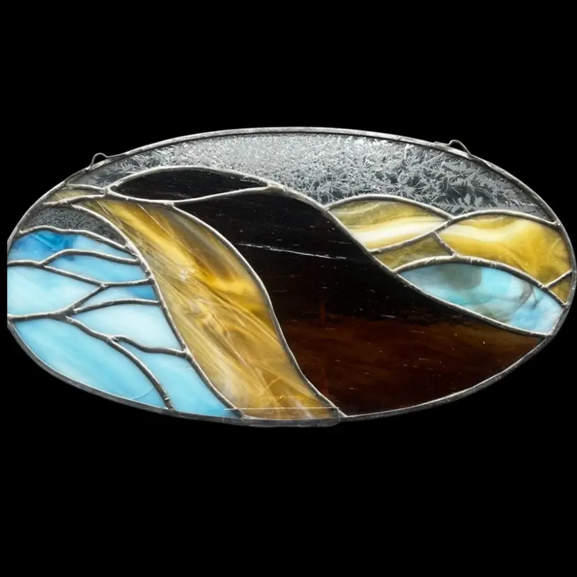 Vintage Oval Leaded Stained Glass Sun Catcher Landscape Blues & Browns Each Color Has A Unique Texture Signed Shirkey ‘80 In good vintage condition. There is a small crack in one panel noted in pictures by signature 12” x 6 1/4” oval No chains included. Chains or wire for hanging needed.