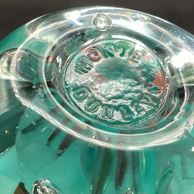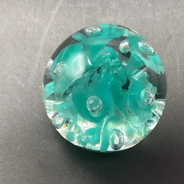 No issues noted. Paperweight is signed on the bottom. Beautiful control bubbles with aqua flowers. Paperweight is approximately 2 1/2 inches tall and 2 3/4 inches wide.