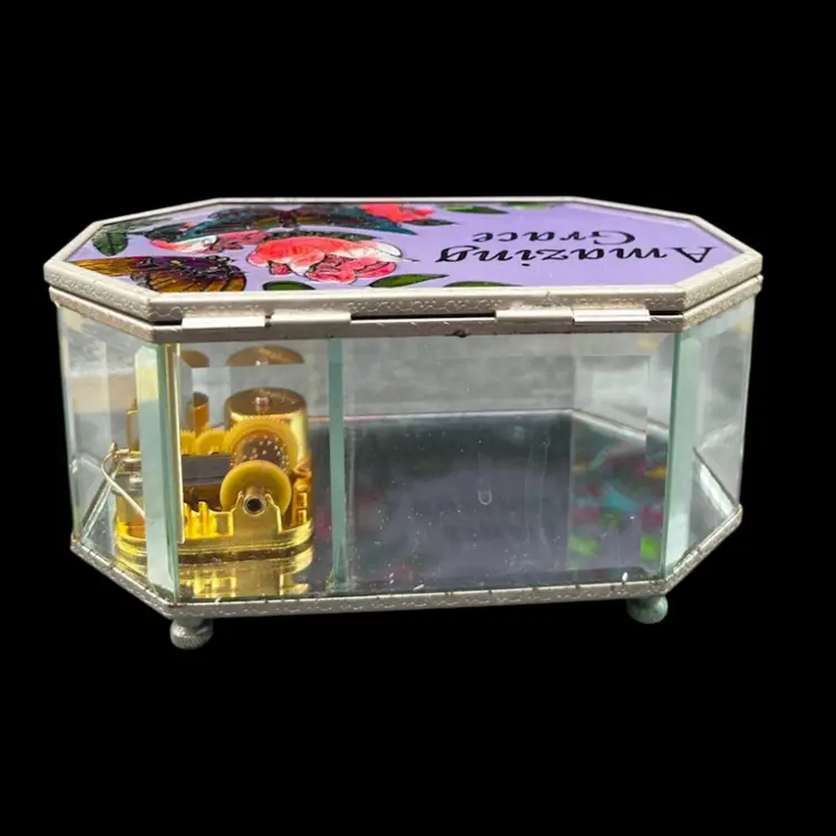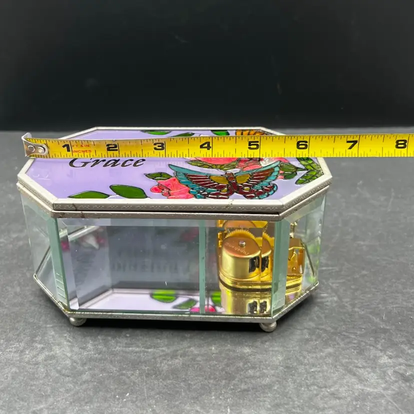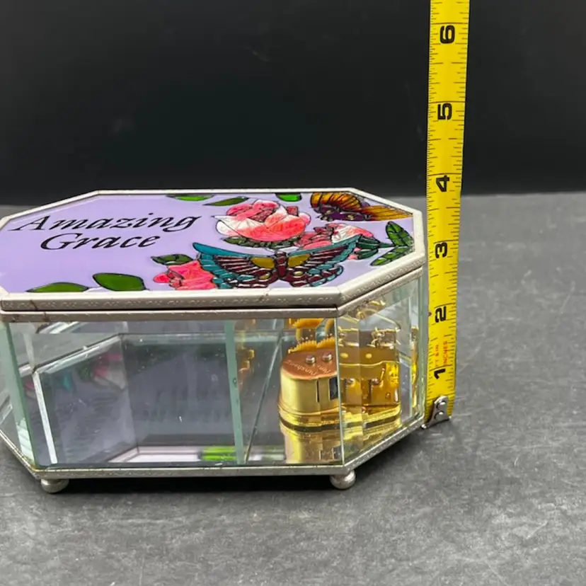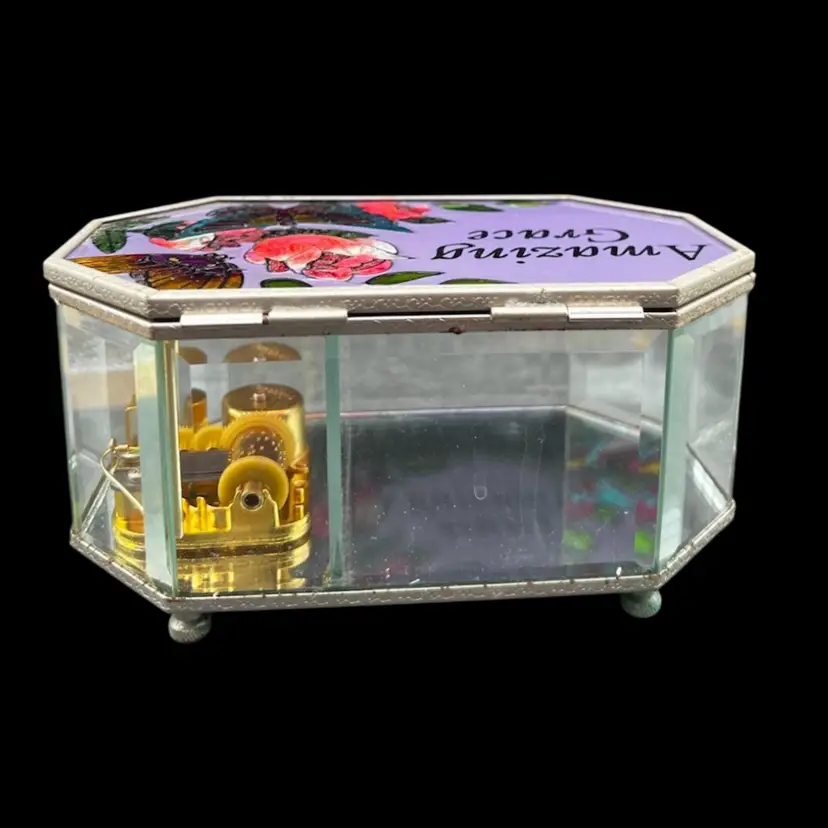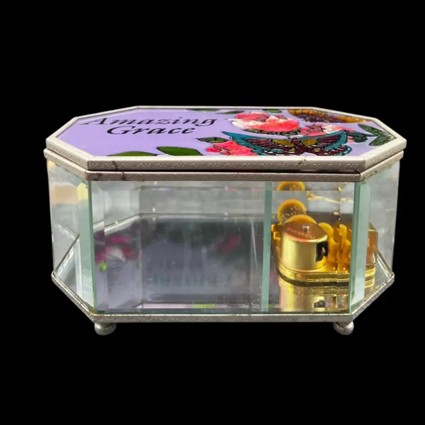 Vintage Painted Glass and Brass Musical Trinket Box. Colorful Flowers And Butterfly Plays Amazing Grace In very good working condition, no chips cracks and the paint is in great condition. Measures 3 1/4” tall x 6 1/4” x 3 3/4”