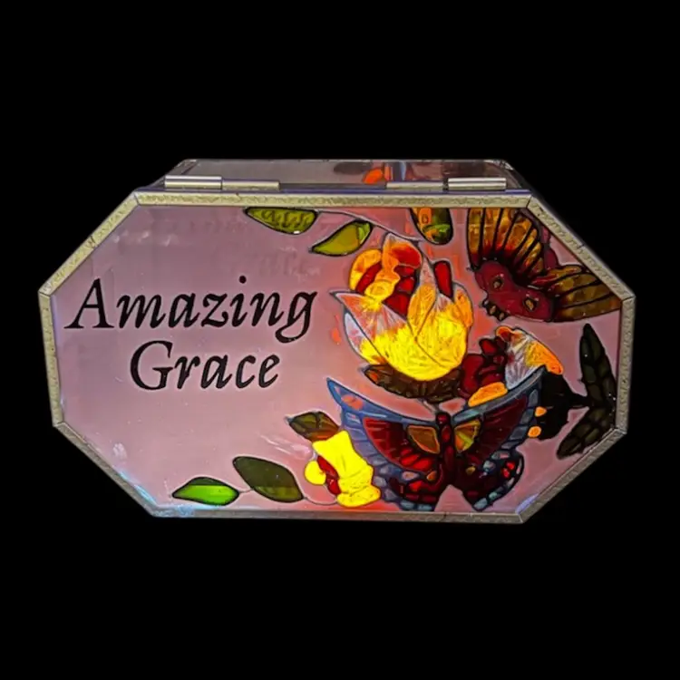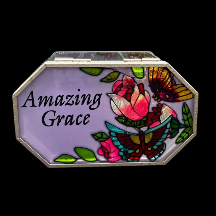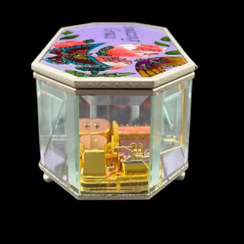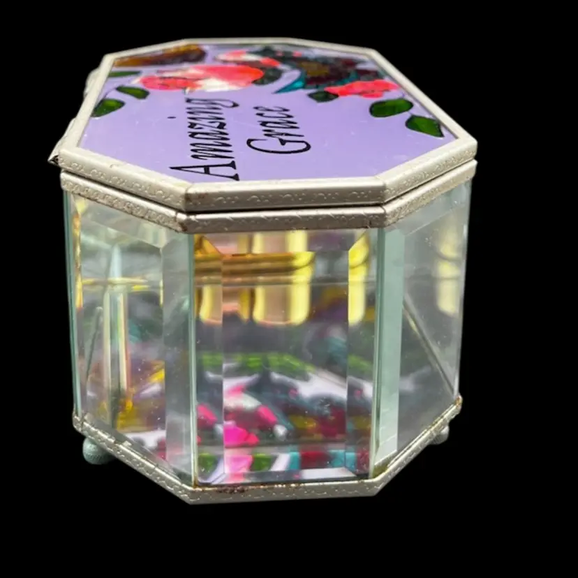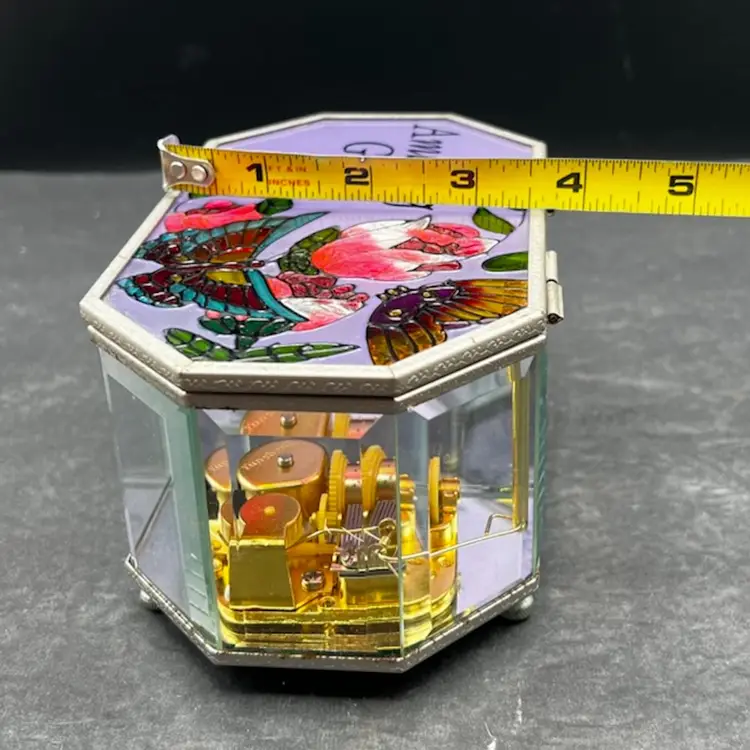 Vintage Painted Glass and Brass Musical Trinket Box. Colorful Flowers And Butterfly Plays Amazing Grace In very good working condition, no chips cracks and the paint is in great condition. Measures 3 1/4” tall x 6 1/4” x 3 3/4”