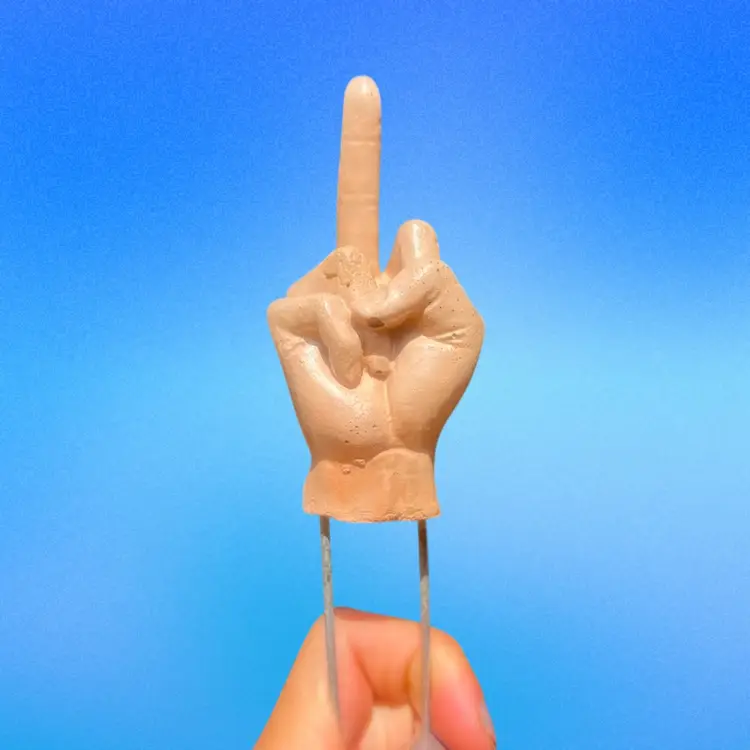 Hand poured concrete middle finger plant stake on steel plant stake.