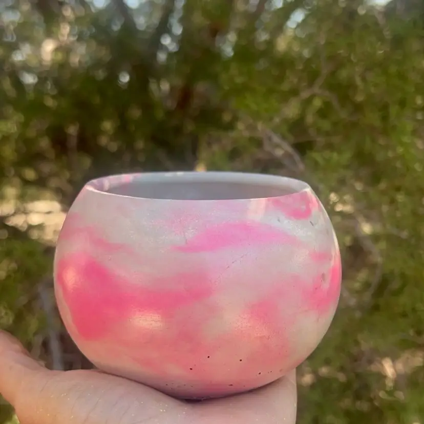 Hand poured concrete globe planter using various dyes concrete. Drainage included.