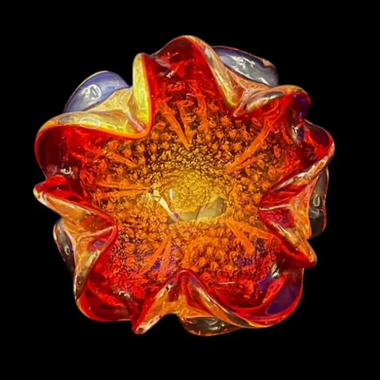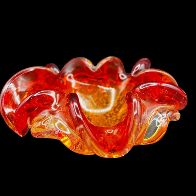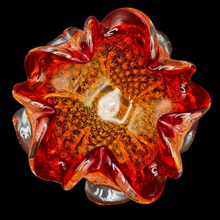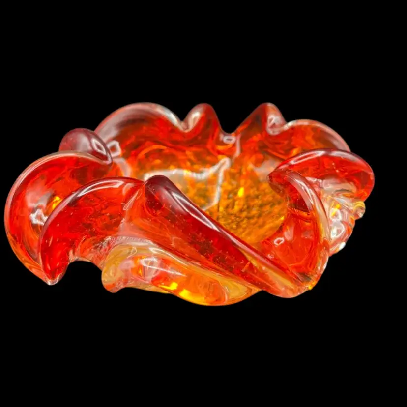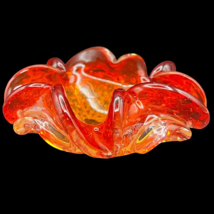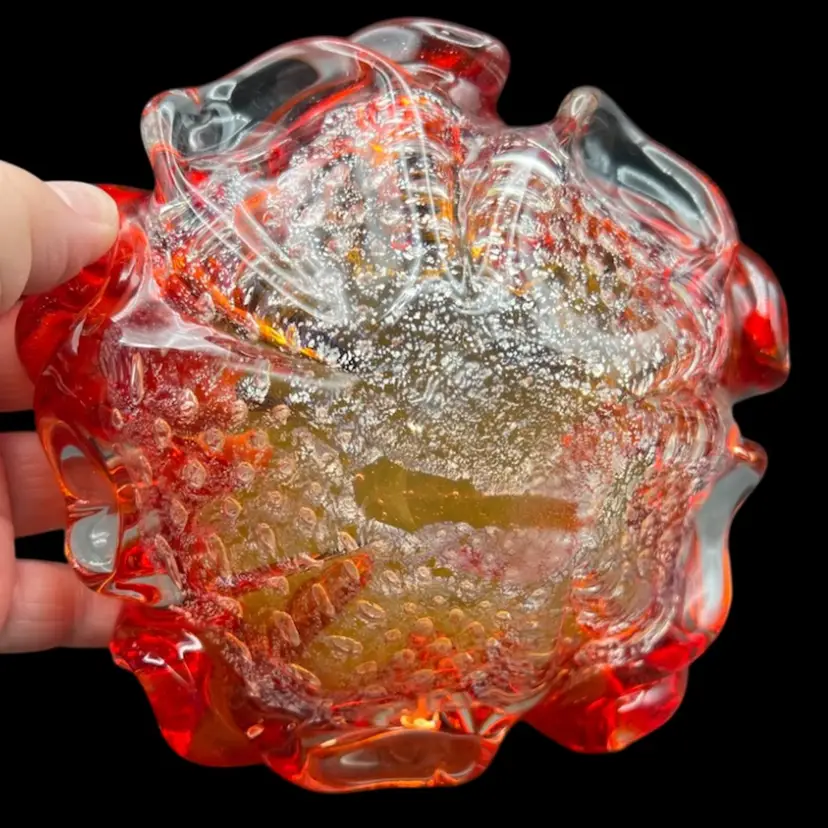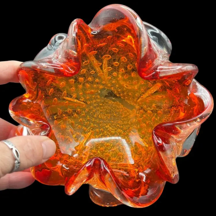 Stunning Vintage MCM Orange With Controlled Bubbles Art Glass Murano Ashtray/Bowl In excellent condition, no chips or cracks. Stands about 3” x 6 1/2” in diameter.