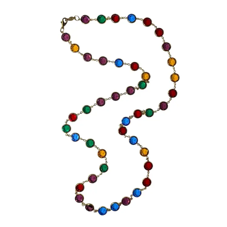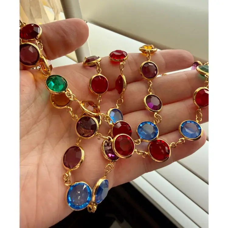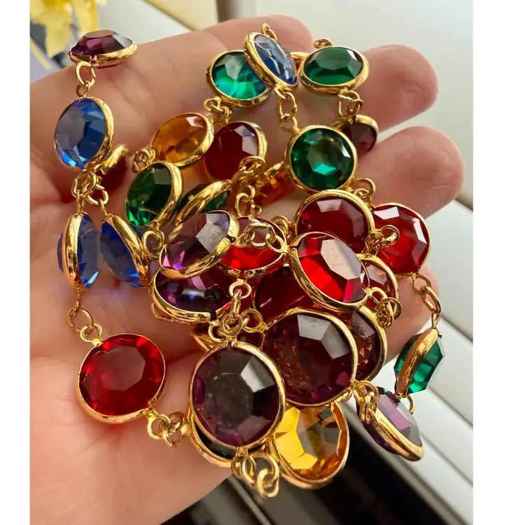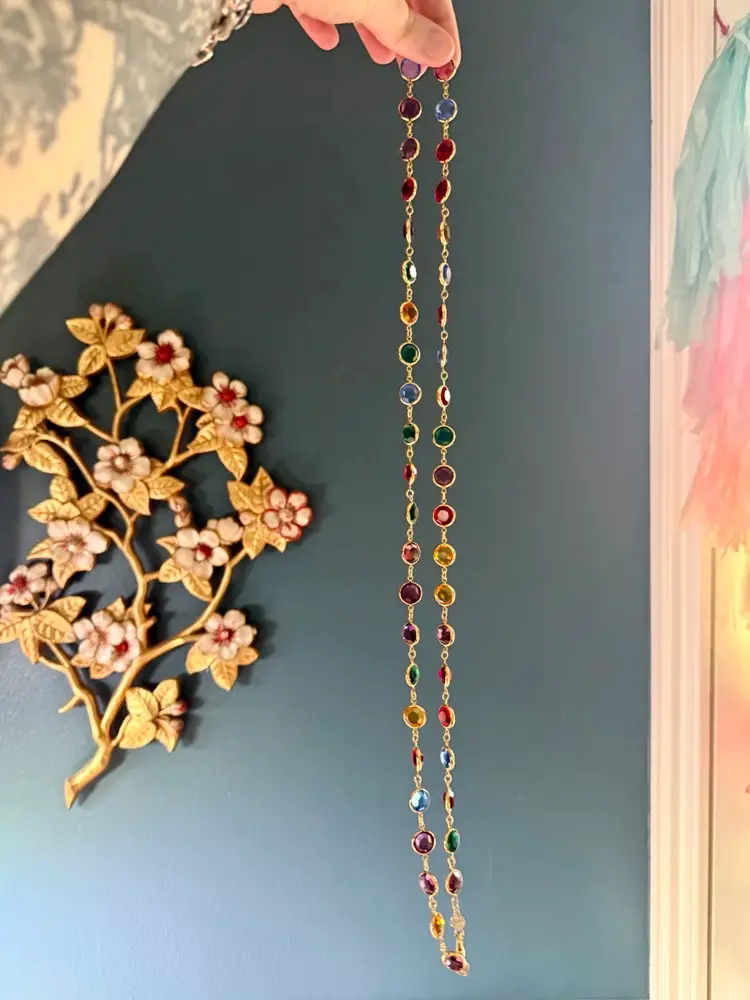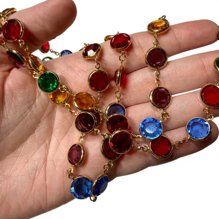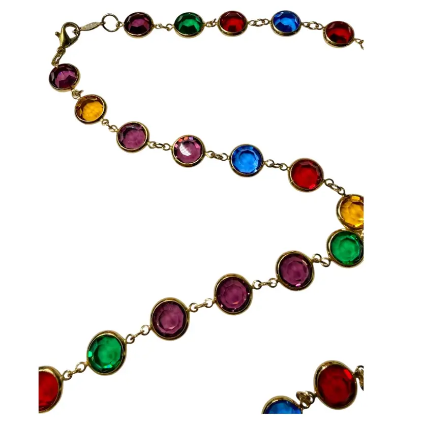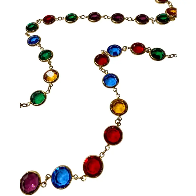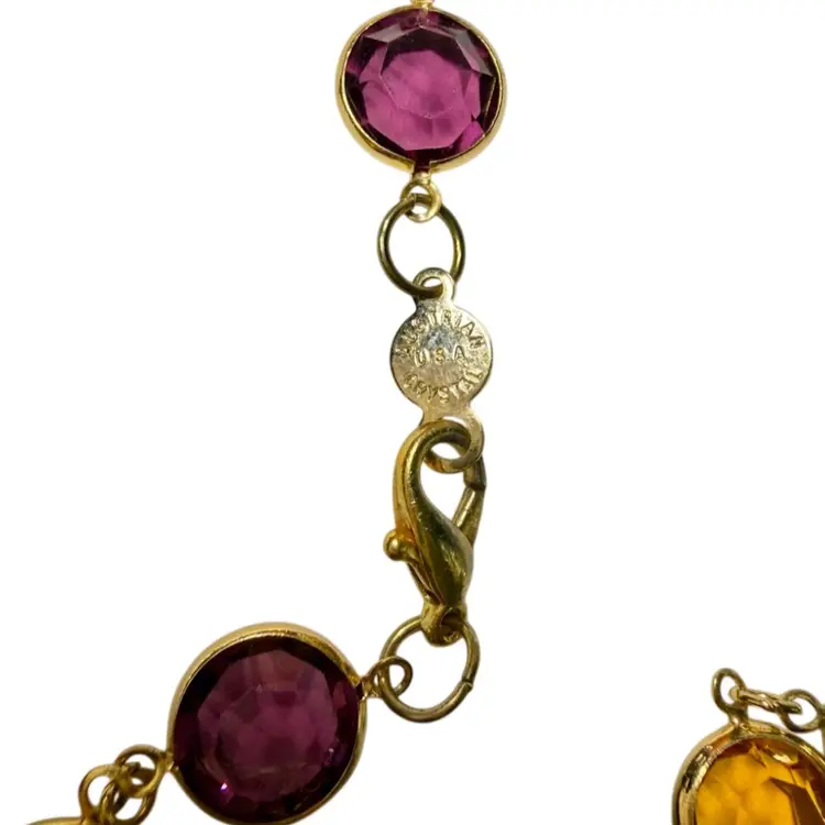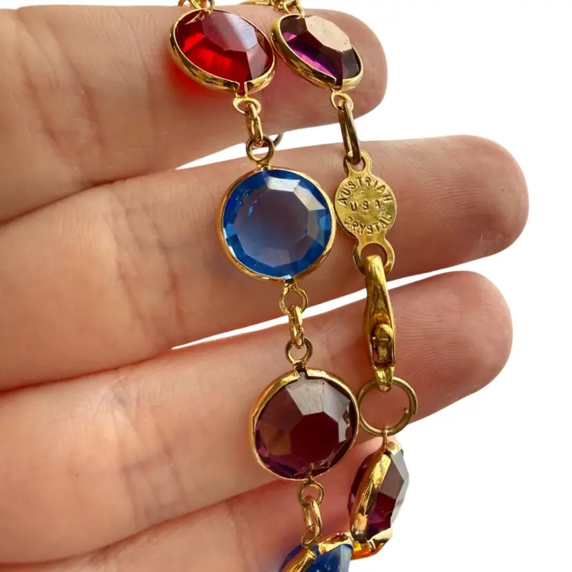 36”. Long, vintage, gold tone necklace made up of jewel toned Austrian crystals. The multicolored crystals are round & beveled. This necklace will add elegance and color to any look! Can be worn long or double wrapped around neck. Marked “Austrian Crystals USA” near the lobster clasp. No issues.