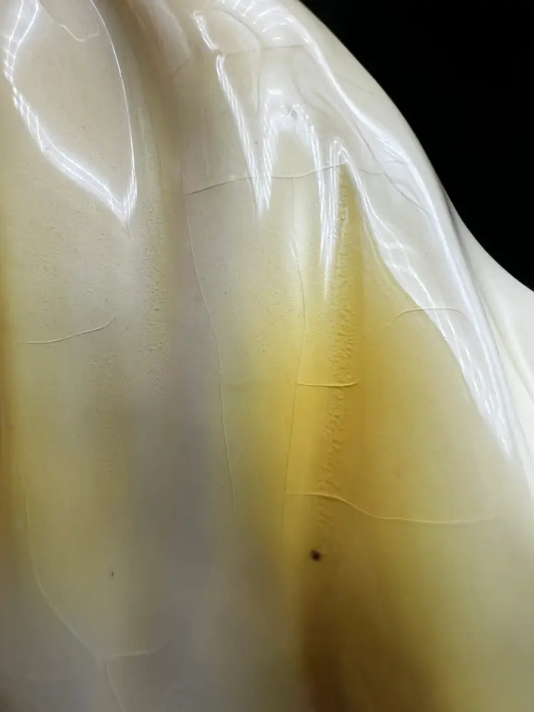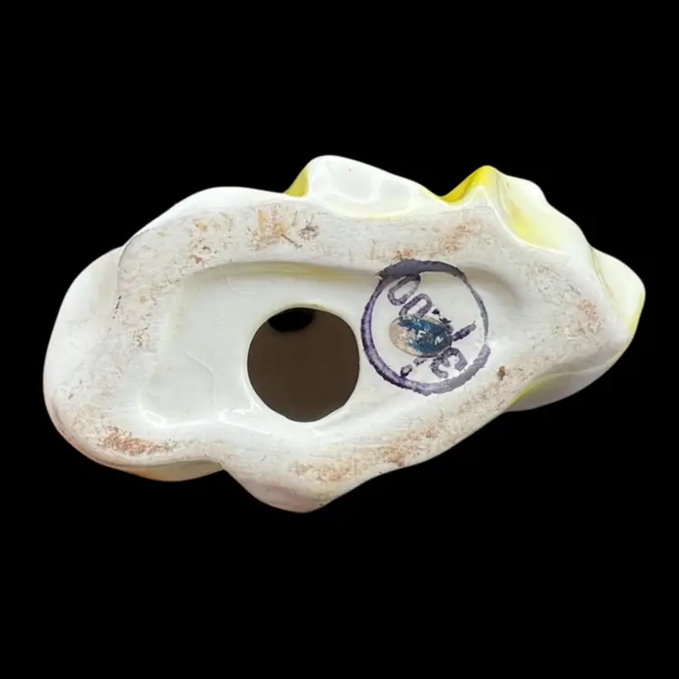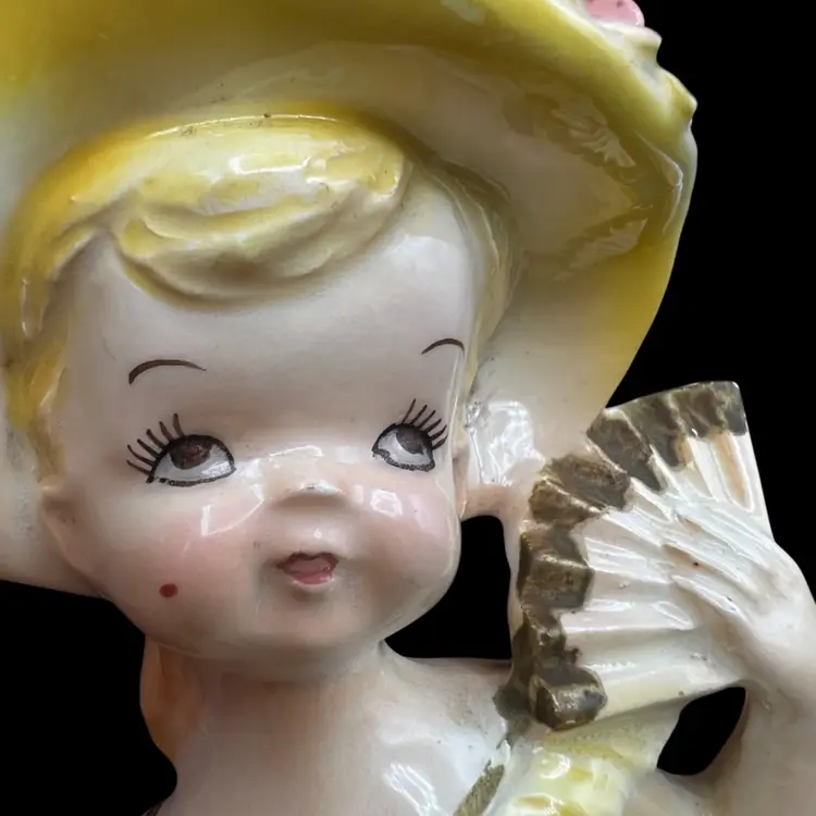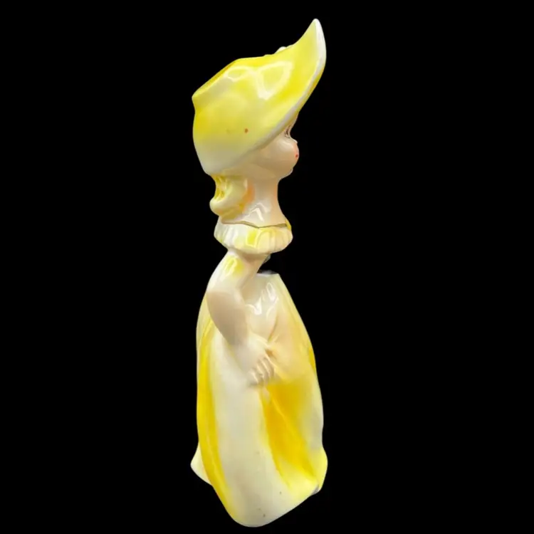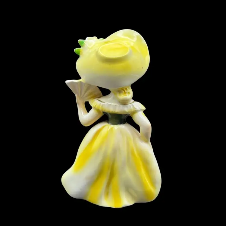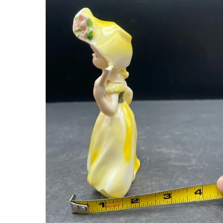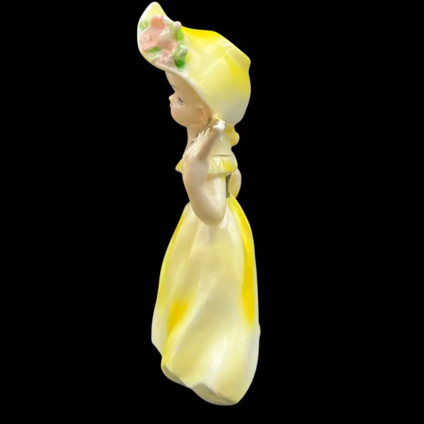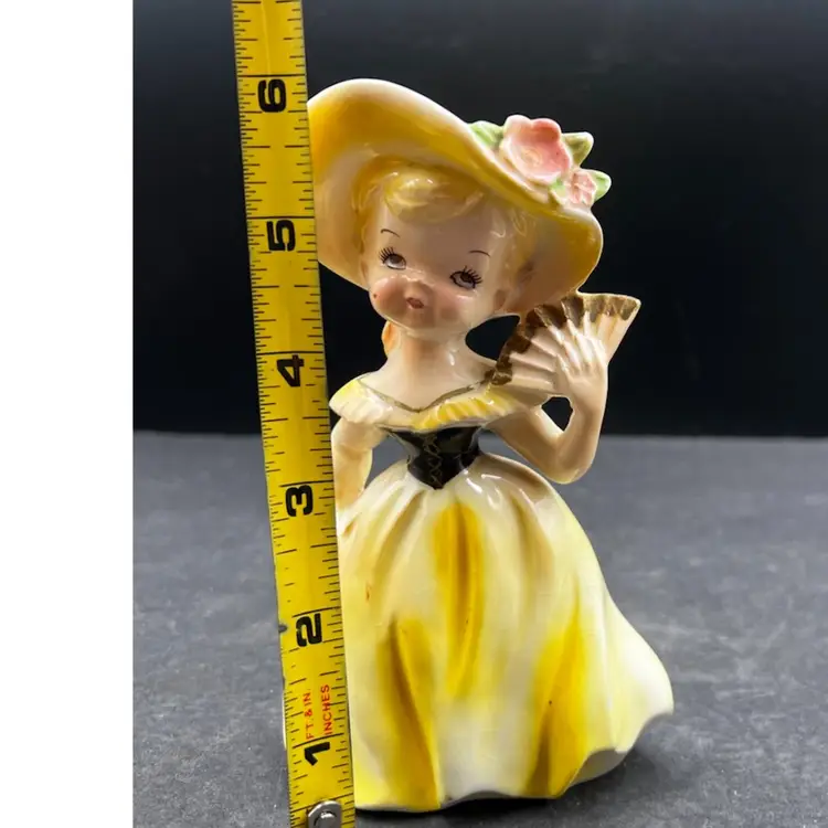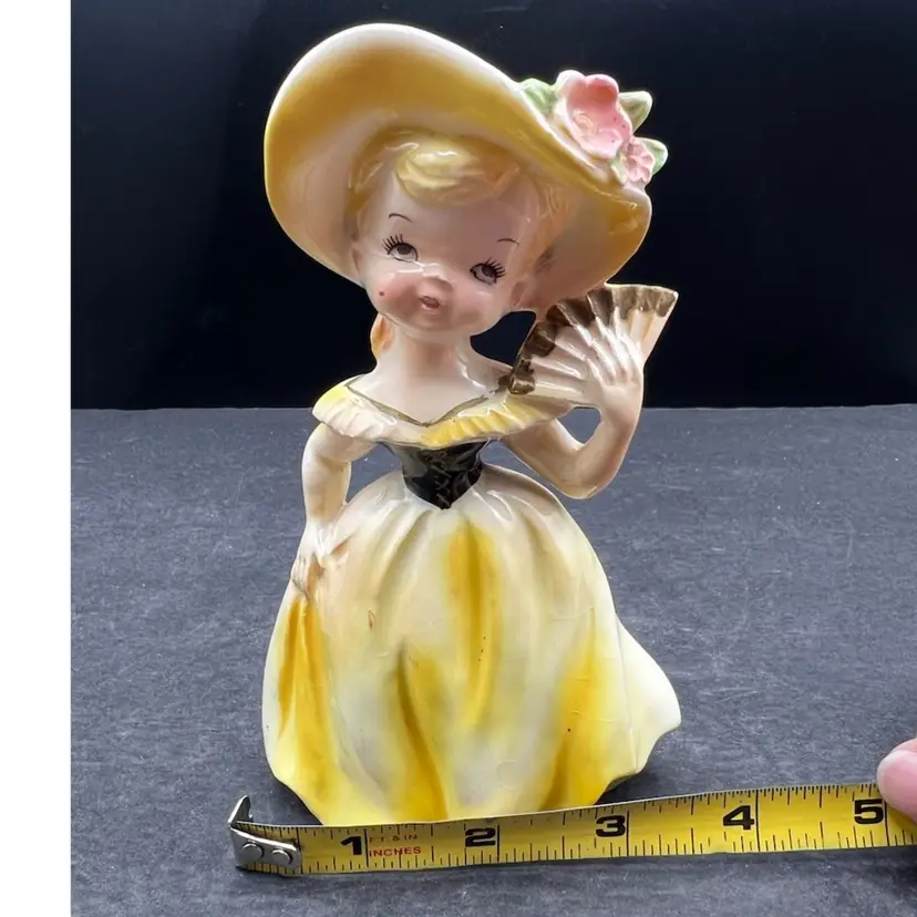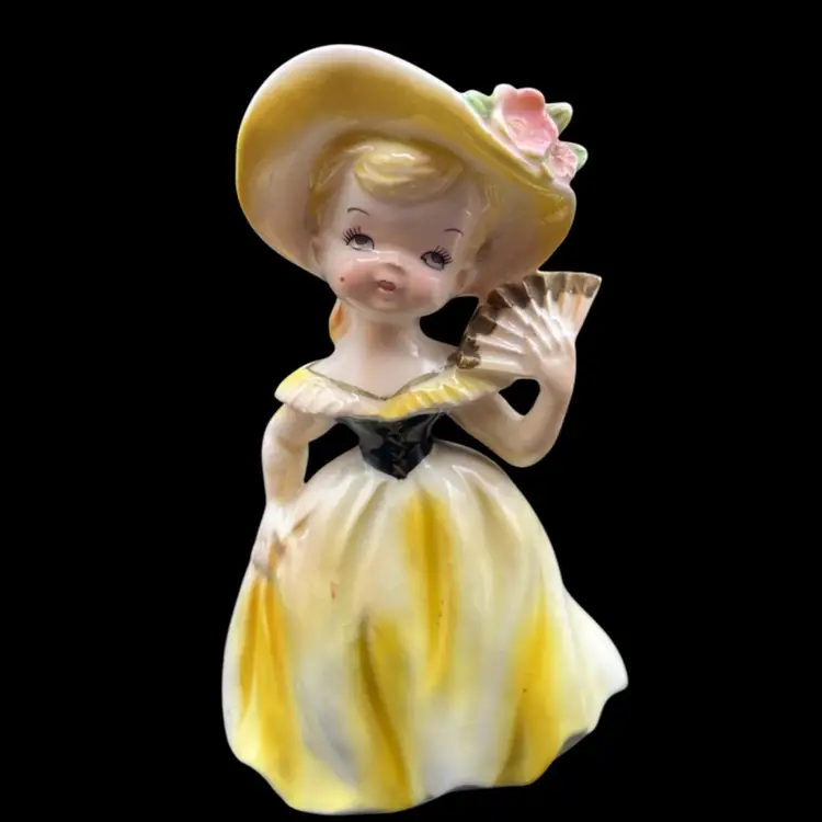 Vintage Figurine Small Girl Wearing a Bonnet with Flowers and a Yellow Dress Holding a Fan in One Hand 1950's Japan In very good condition. One tiny glaze chip on dress. See pictures for details. She is starting to craze 6” tall x 3 1/2” x 2 1/4” Sticker and mold number on bottom, Japan 3100