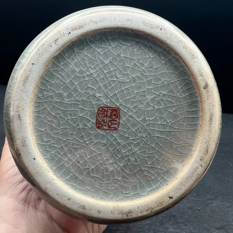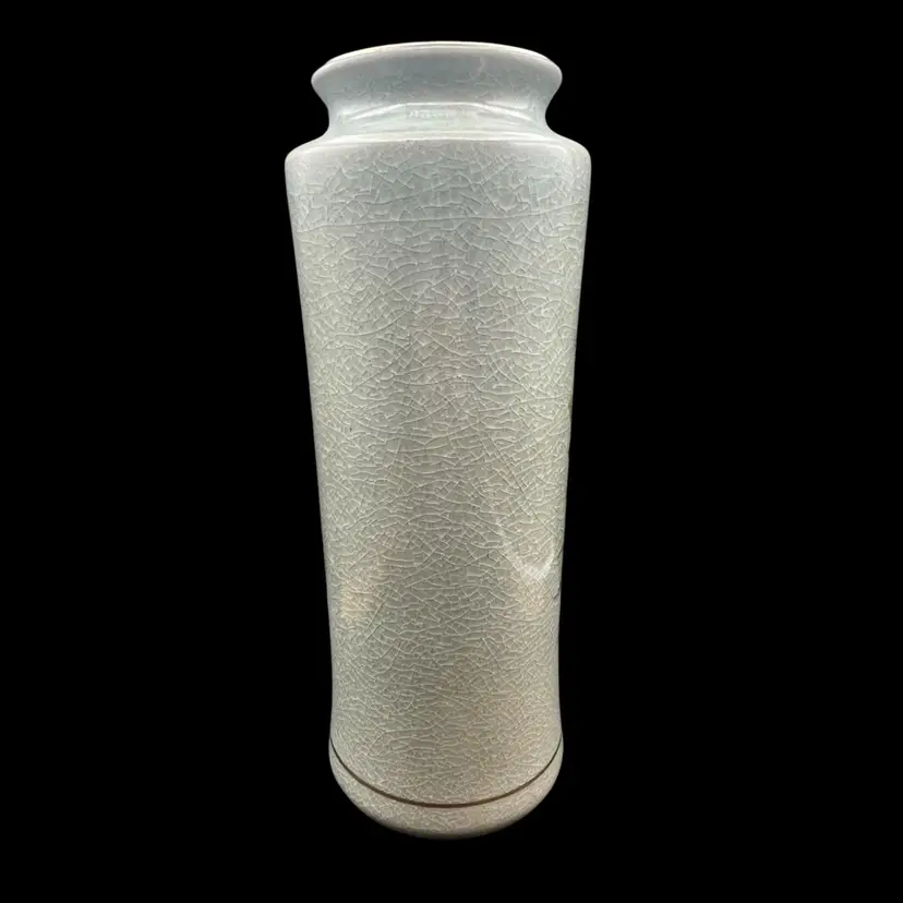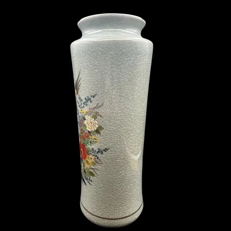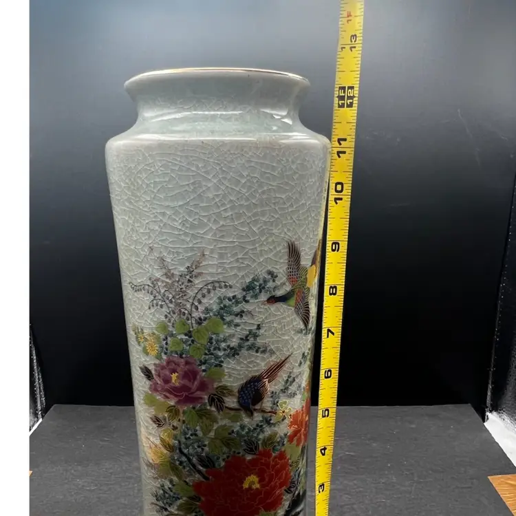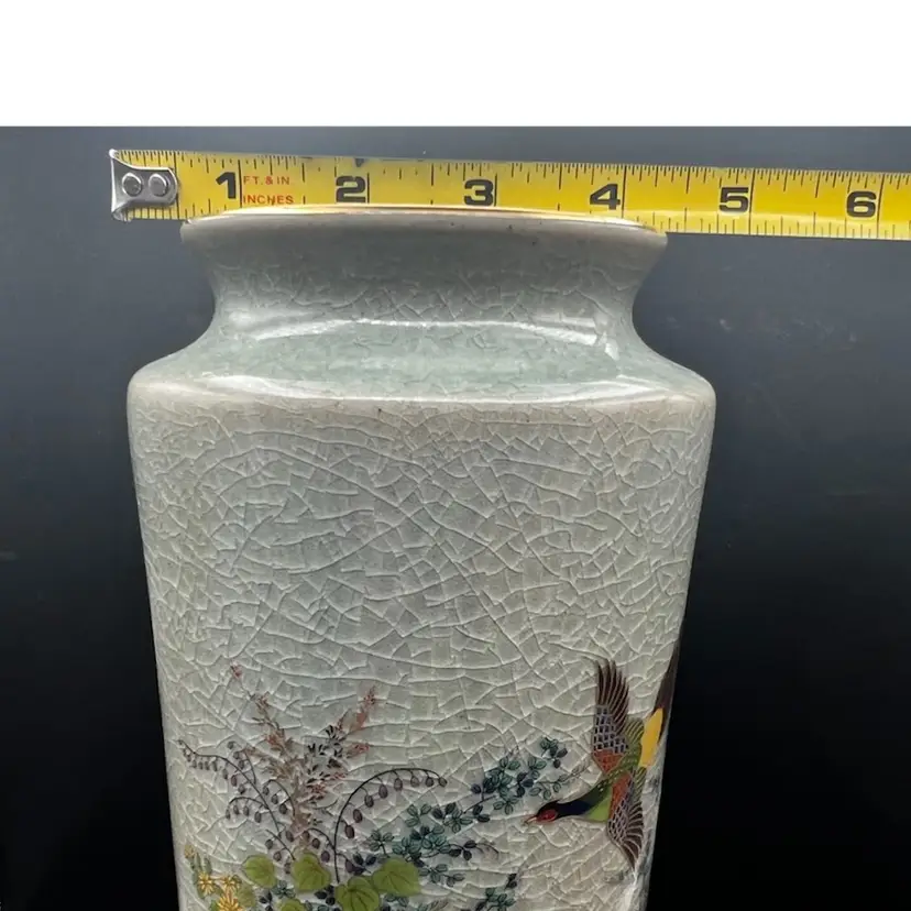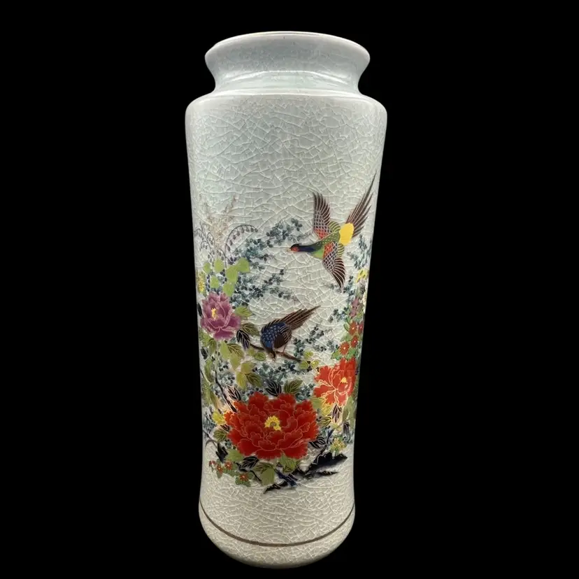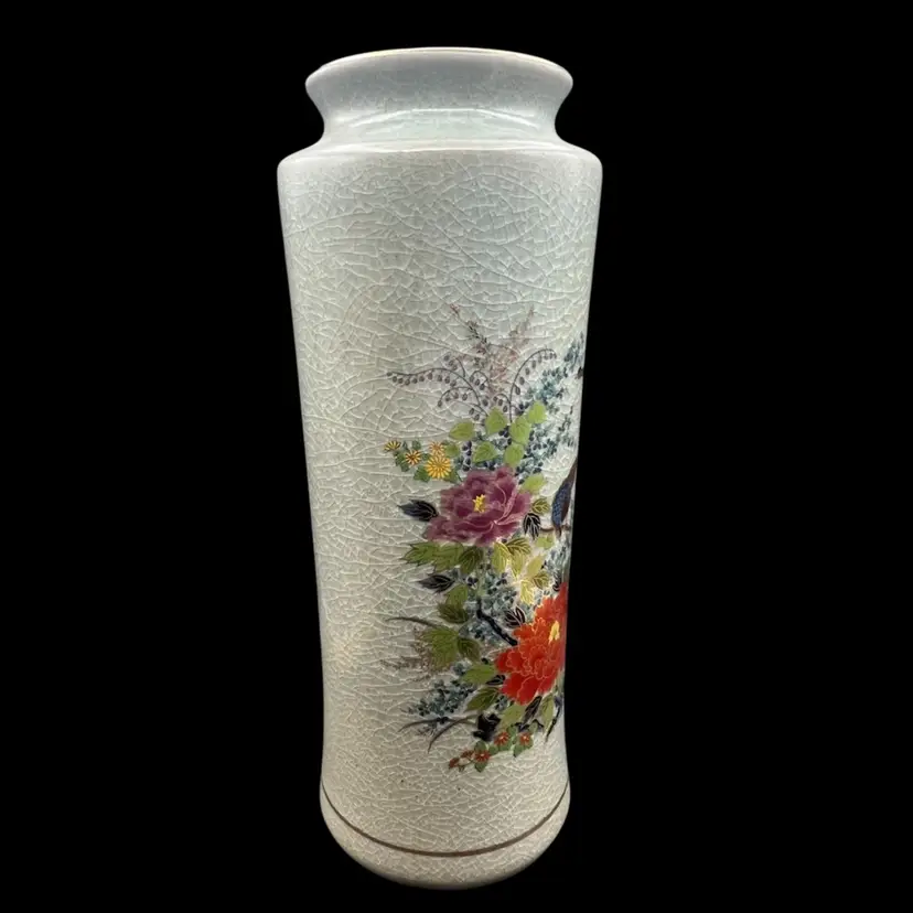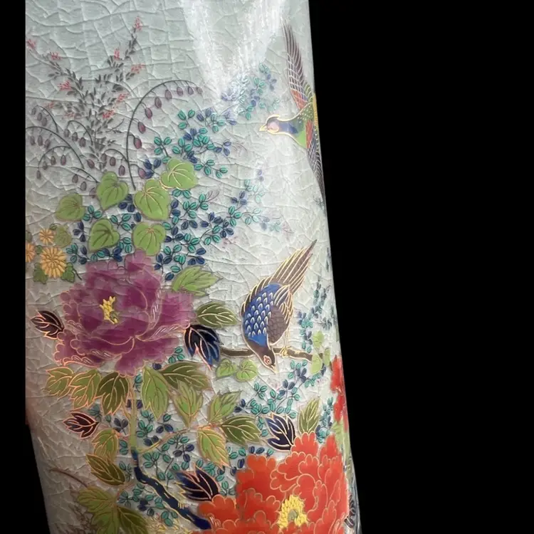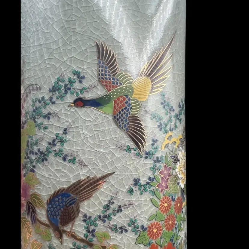 Vintage Satsuma Style Double Pheasant/Bird And Floral Design Vase With Crackle Glaze And Brass Inlay In very good condition Just over 12” tall x 5” in diameter with a 4” mouth