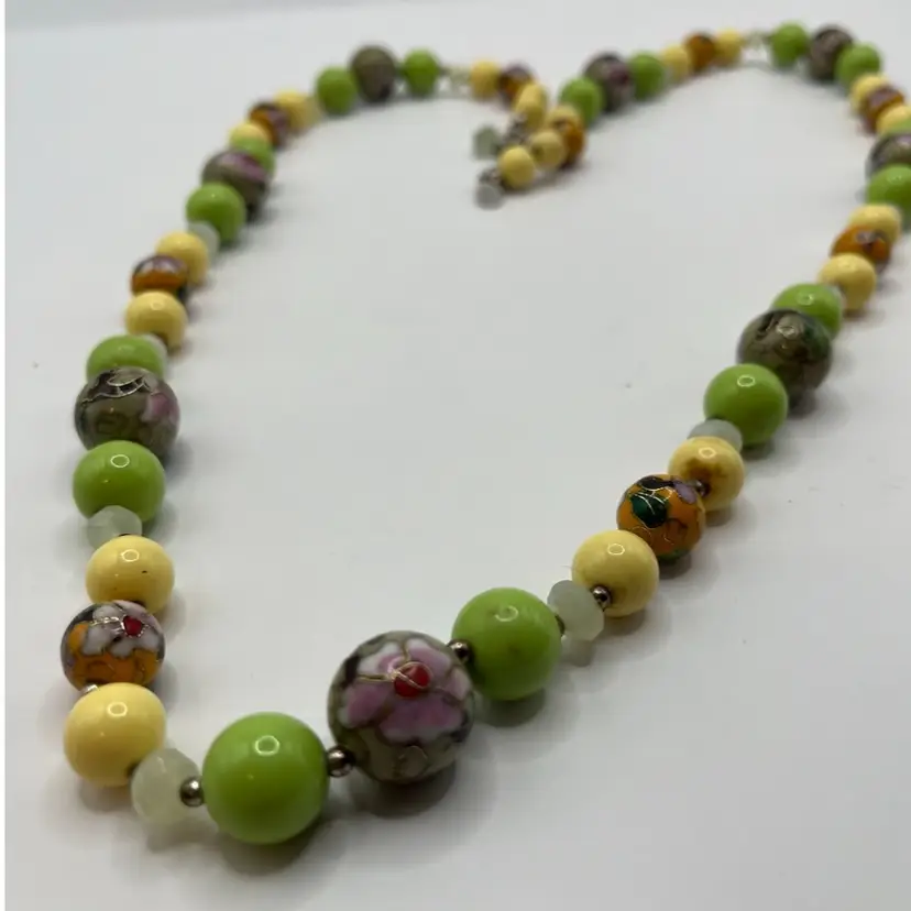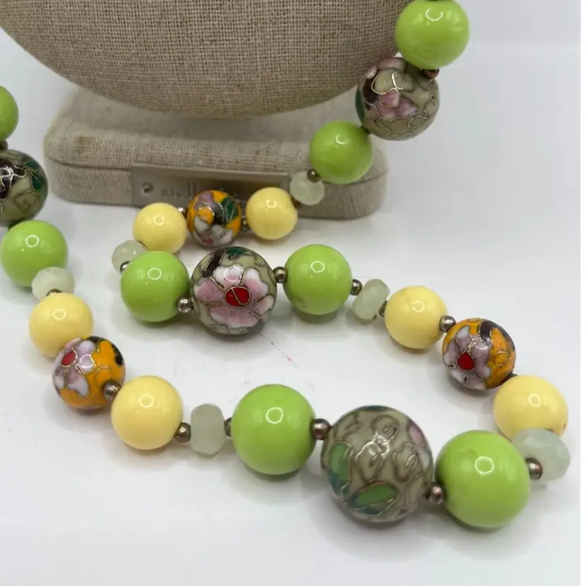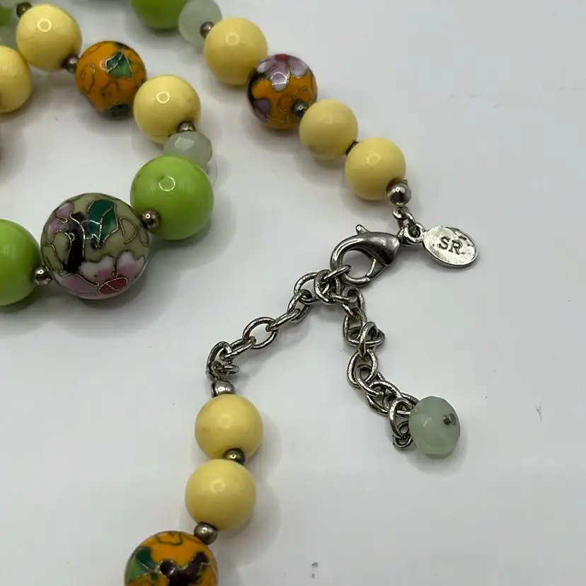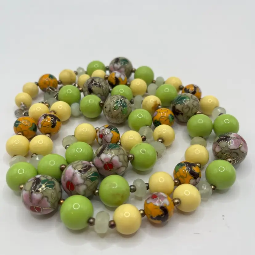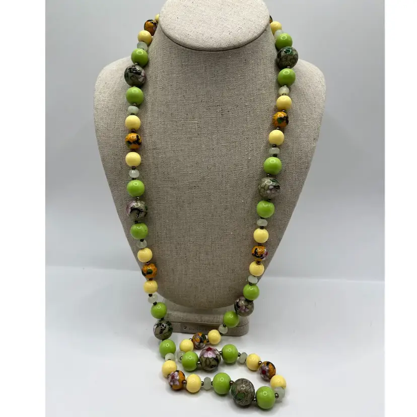 36”Vintage Sonia Rykiel Beaded cloisonné acrylic and crystal Yellow, Green necklace