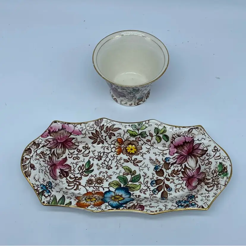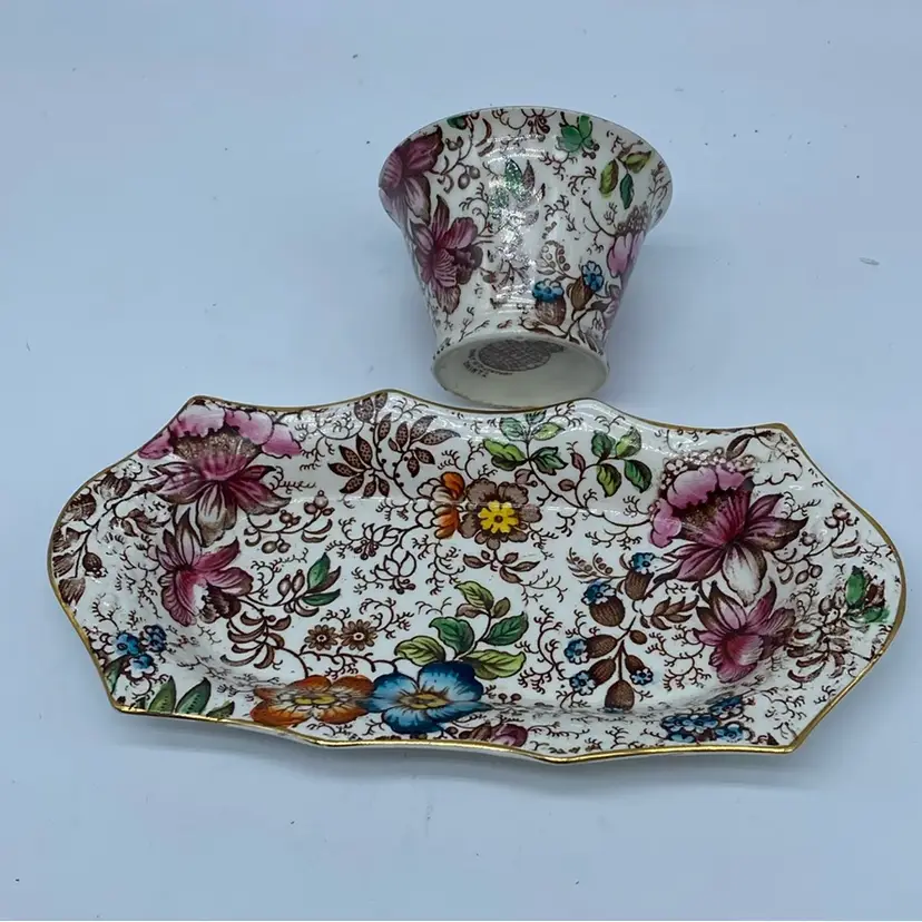 Small flea bite on rim of cup. Tray is 8”x3.5” cup is 2” tall. The early 18th century was a period of significant development in English ceramics, with manufacturers experimenting with new materials and decorative techniques. Chintz patterns, inspired by Indian textiles, gained immense popularity during this era, adorning porcelain and earthenware with vibrant floral motifs. These pieces were highly sought after by the burgeoning middle class and aristocracy alike, reflecting a growing taste for exoticism and domestic ornamentation.