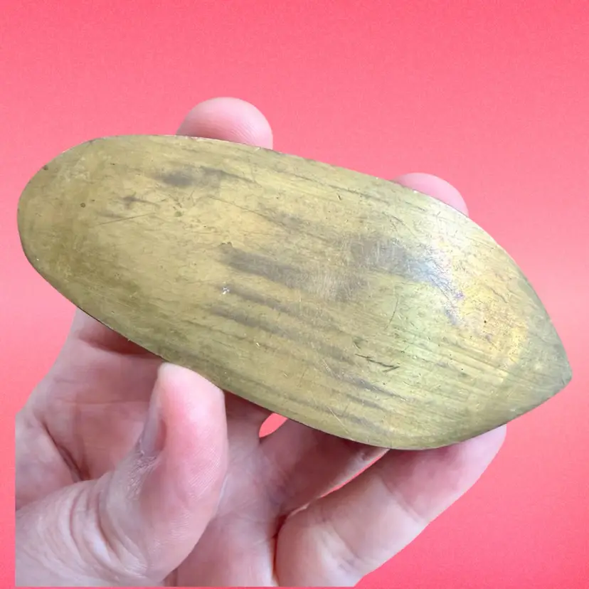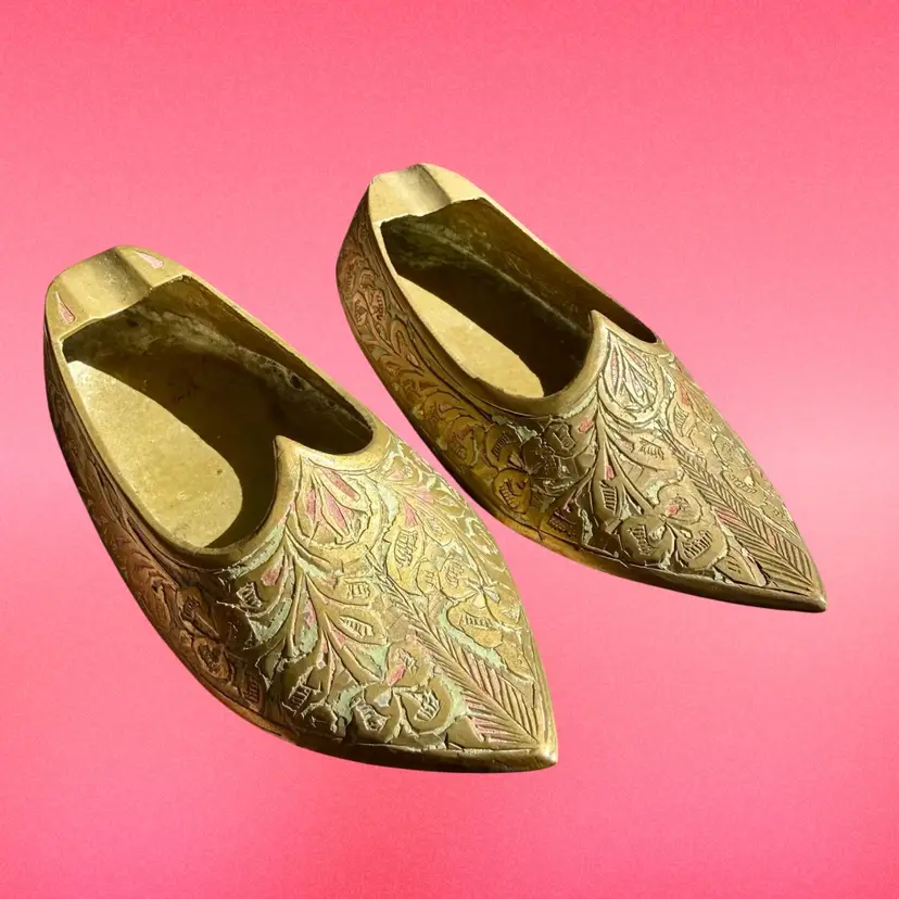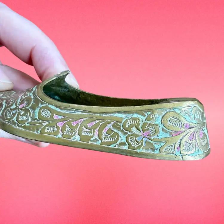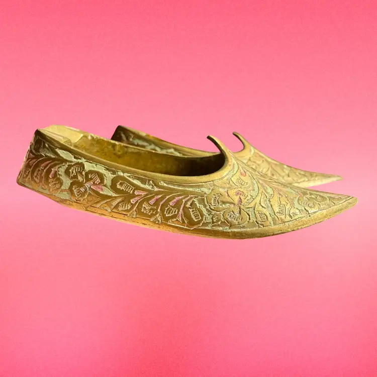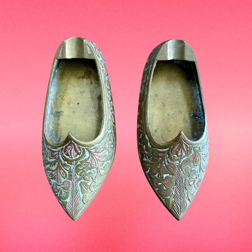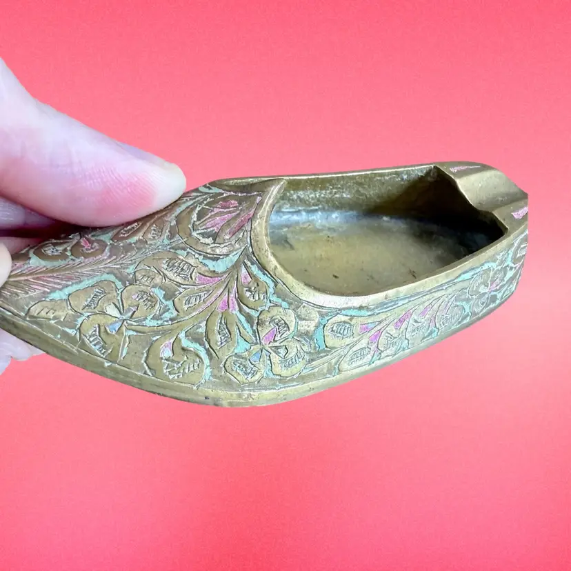 3.75”x1.5”x0.75”. Listing is for TWO little handheld ashtrays in the shape of traditional Indian shoes. Each shoe is etched with a lovely design and has some (faded) red and green paint within the etching. Ash trays are used and have some wear on the inside from use. No marks or stickers.