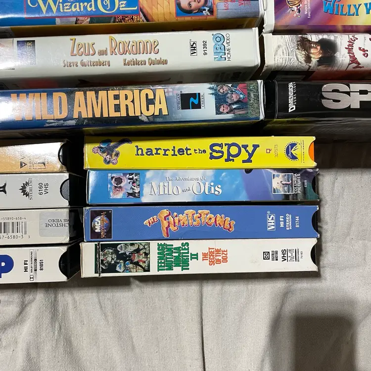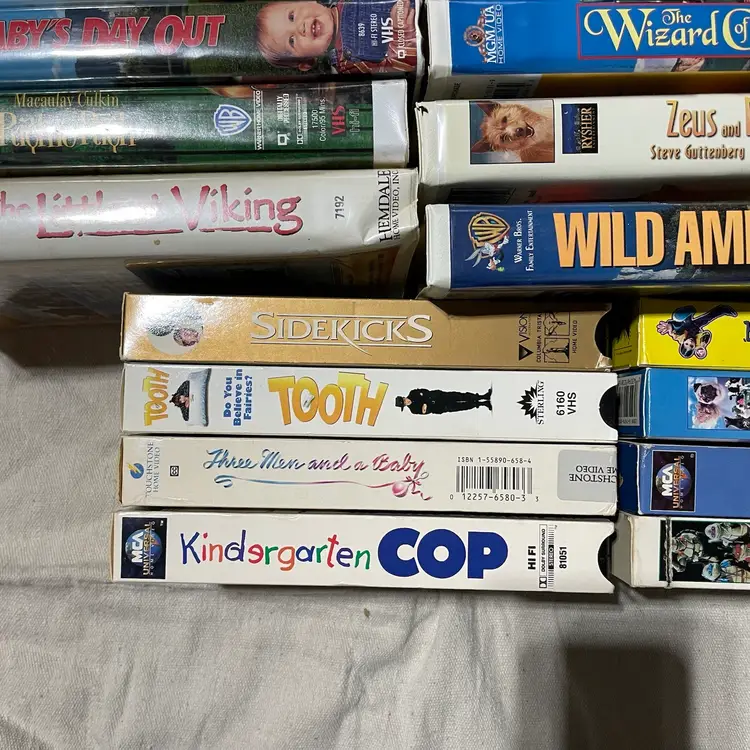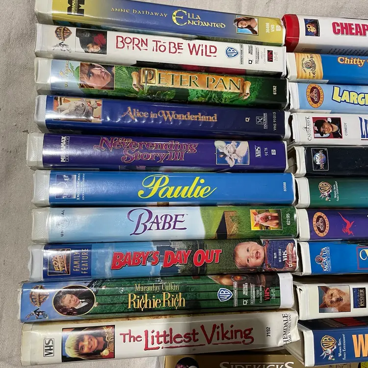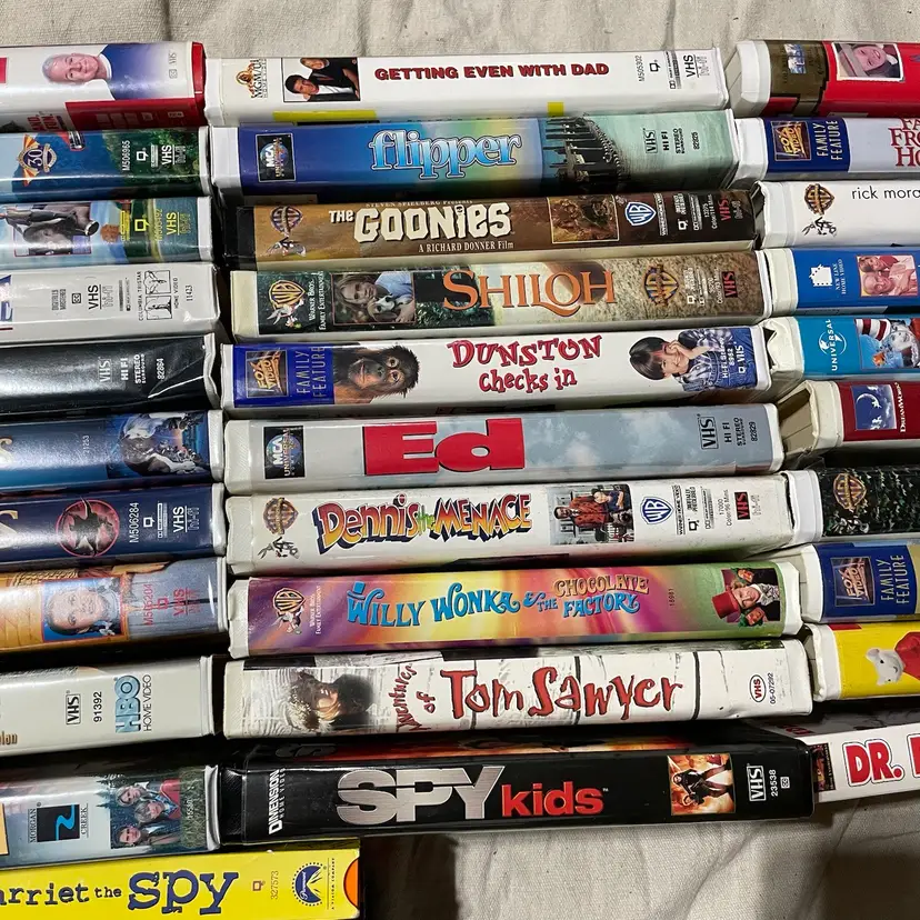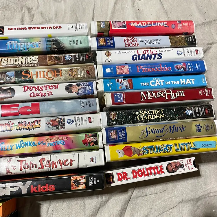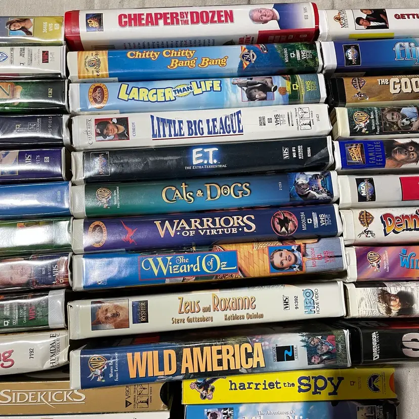 38 kids and family live action movies. Non Disney. A box of nostalgia. Tapes in excellent condition overall. Cases overall in good condition.