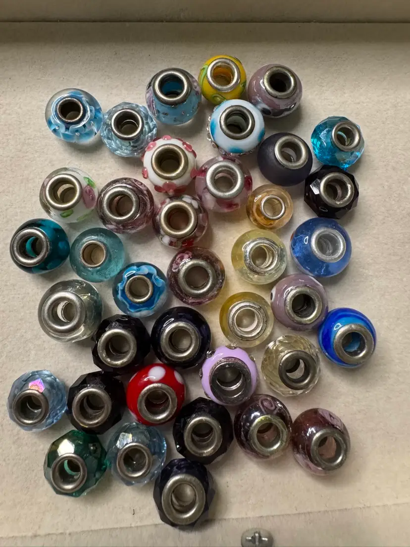 38 Glass Bead Silver Tone Slider Bracelet Charms. All good condition. No chips or cracks. Excellent lot! Measure about a half inch each.
