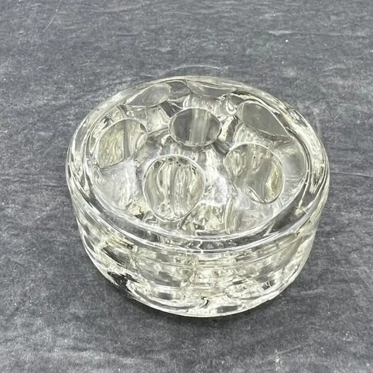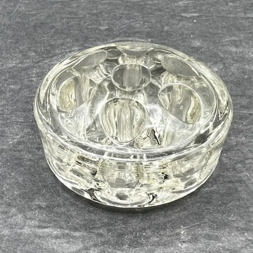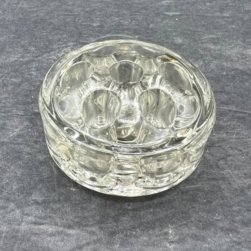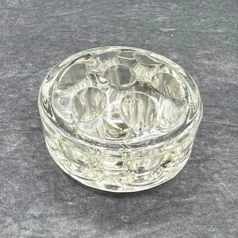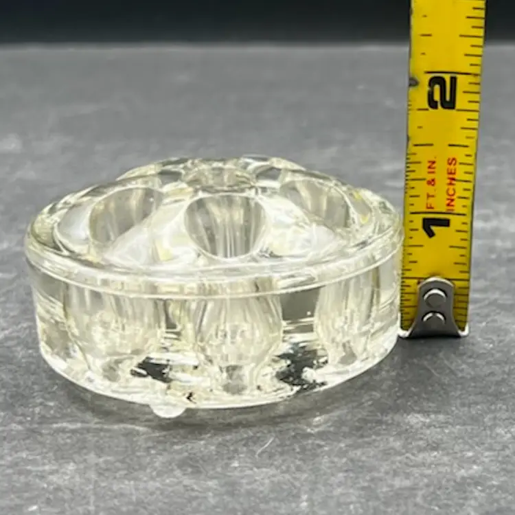 Vintage Clear Glass 7 Hole Small Flower Frog Has Slight Manganese Glow 1 1/2” tall x 2 1/2” in diameter In very good condition, no visible flaws