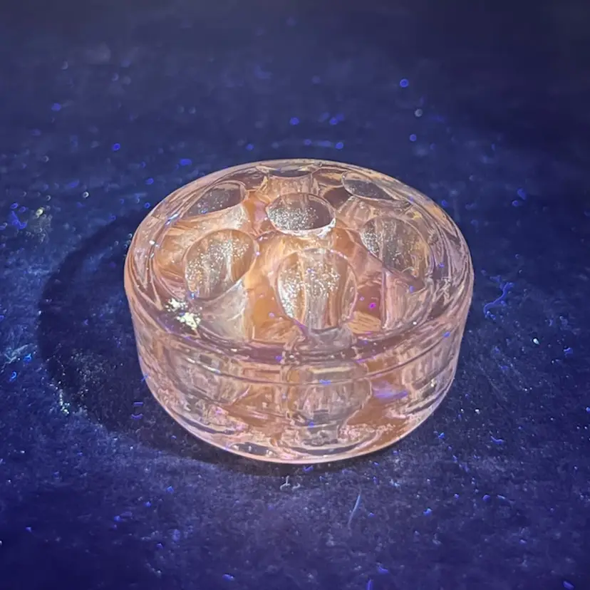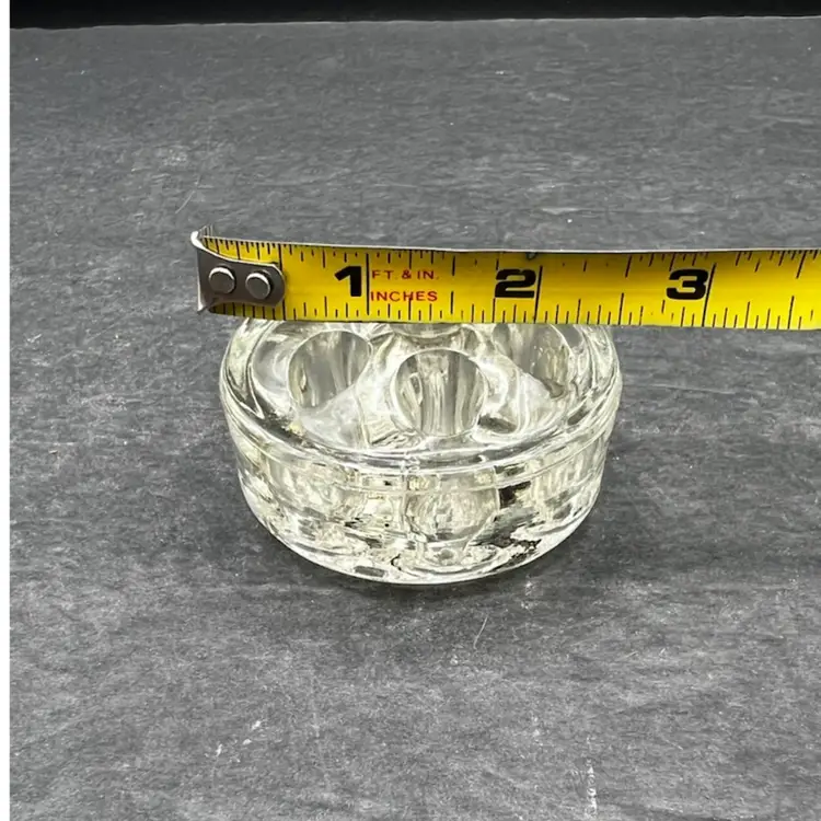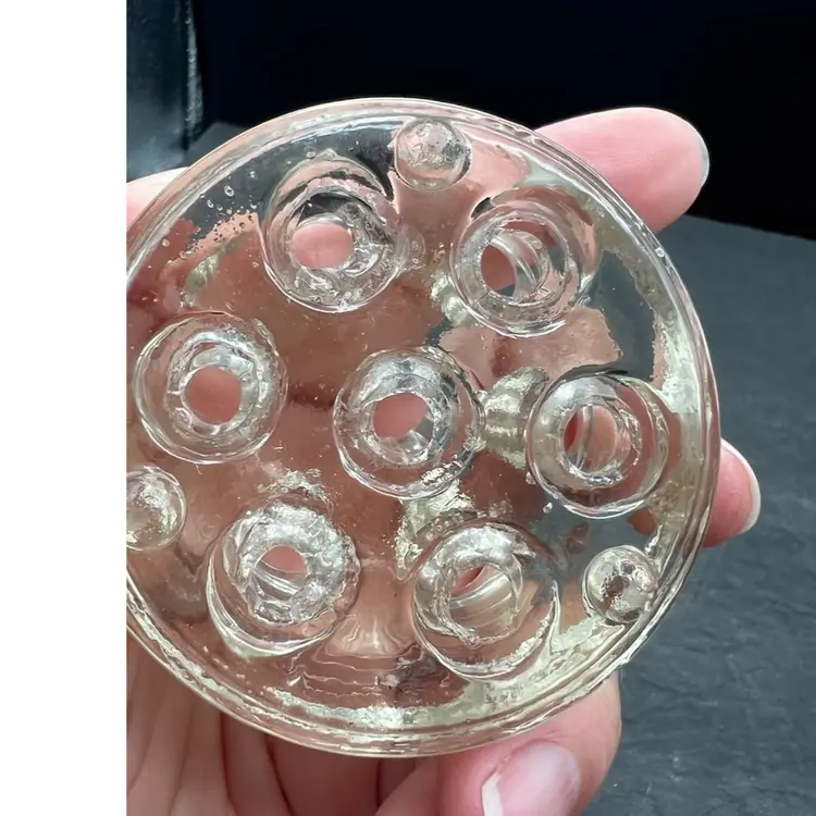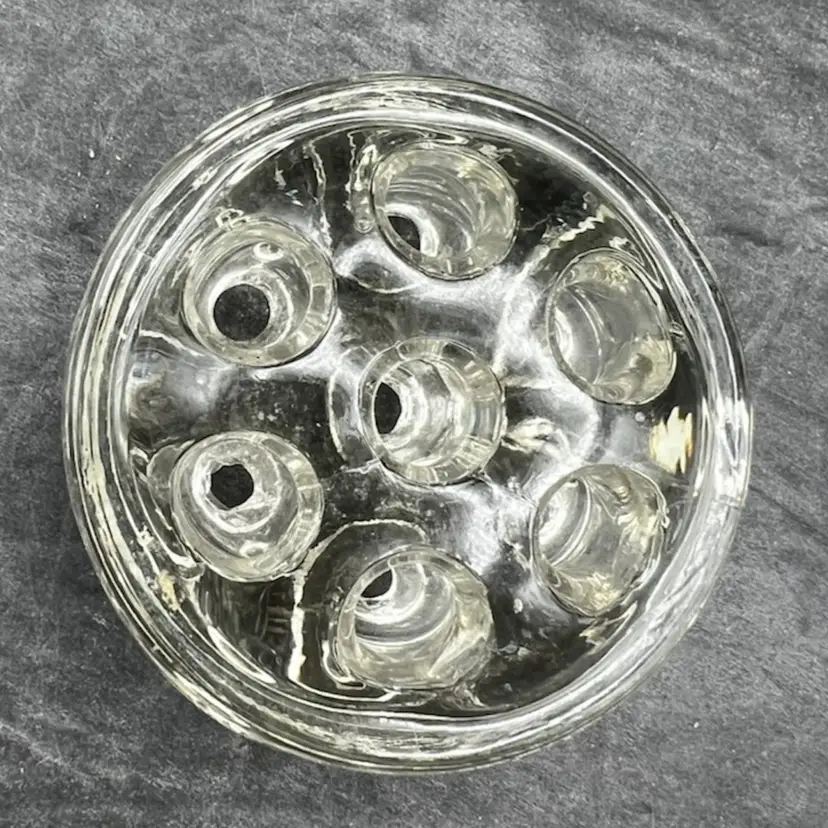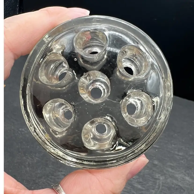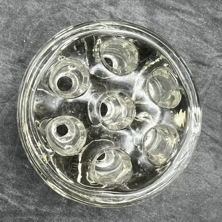 Vintage Clear Glass 7 Hole Small Flower Frog Has Slight Manganese Glow 1 1/2” tall x 2 1/2” in diameter In very good condition, no visible flaws