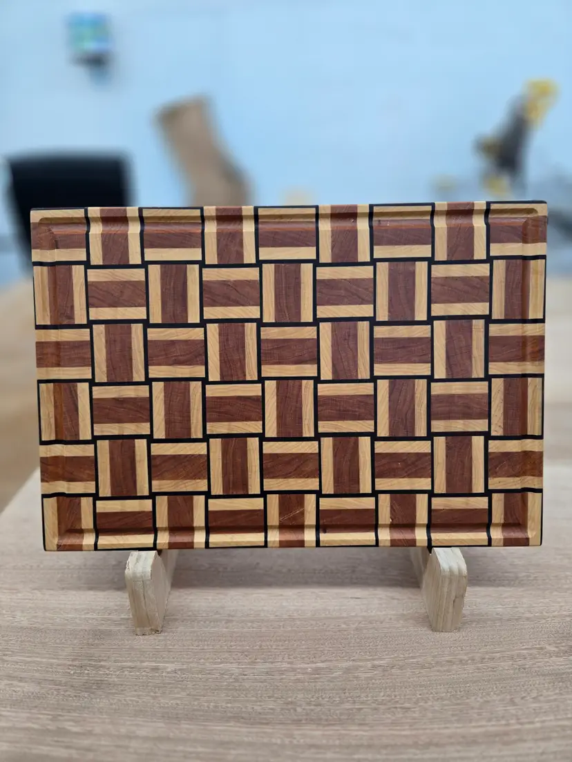 Handcrafted end grain cutting board featuring Maple, Cherry and Andiroba wood. Durable and perfect for everyday use. Juice groove and rubber feet included. Free shipping within the continental US. Approximate dimensions: 15"x10.5".