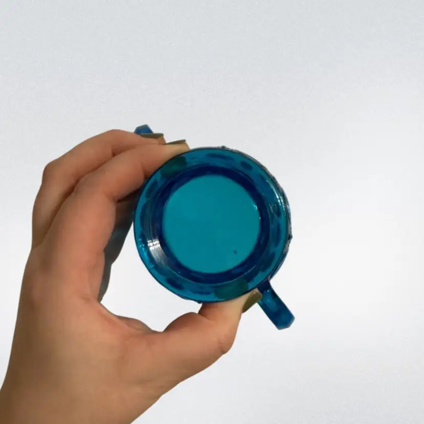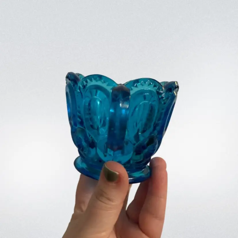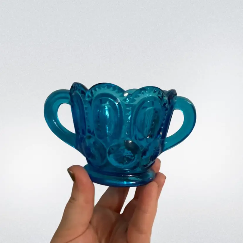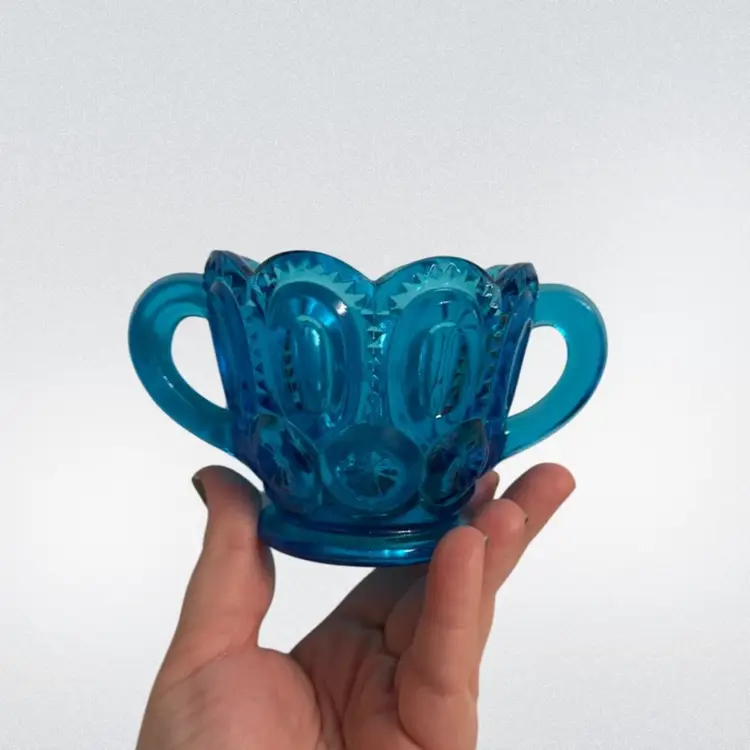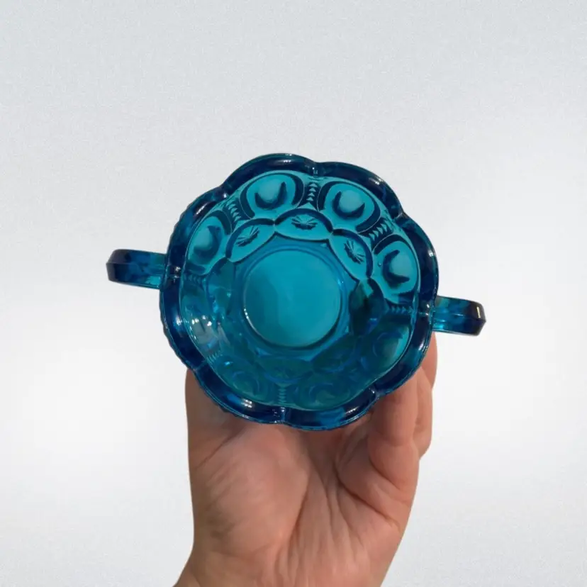 An open sugar dish by LE Smith in the Moon and Star pattern, in the color Peacock. The dish is in good vintage condition- no chips or cracks. Approximately 3in tall.